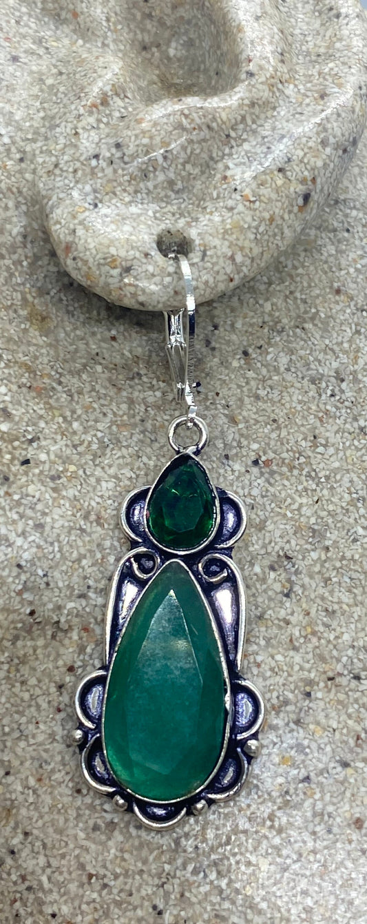 Antique Vintage Green Aventurine Jade Silver Dangle Earrings