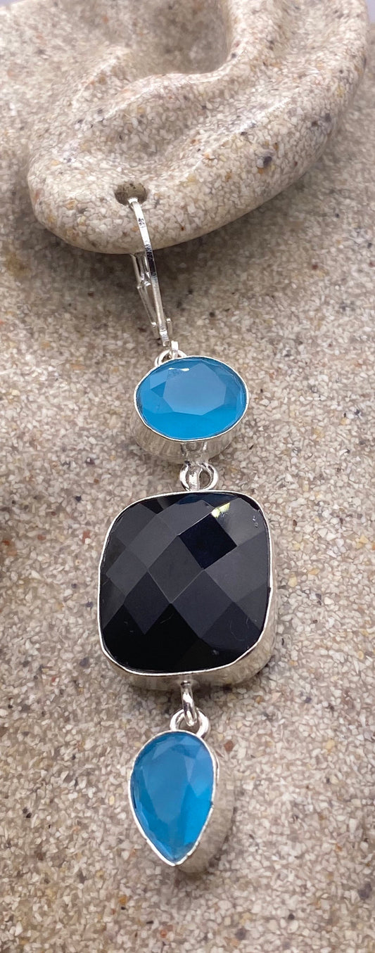 Vintage Genuine Black Onyx Chalcedony 925 Sterling Silver Deco Dangle Earrings