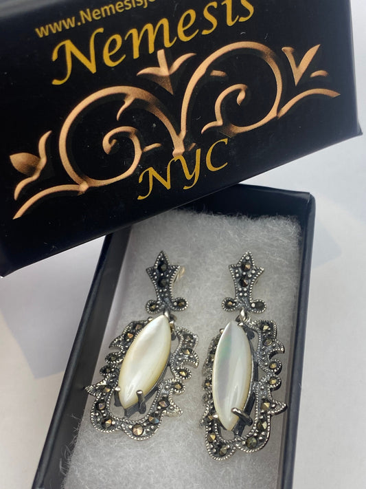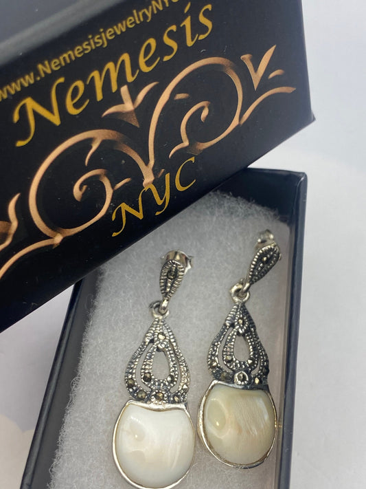 Vintage Mother of Pearl Marcasite 925 Sterling Silver Heart Dangle Earrings