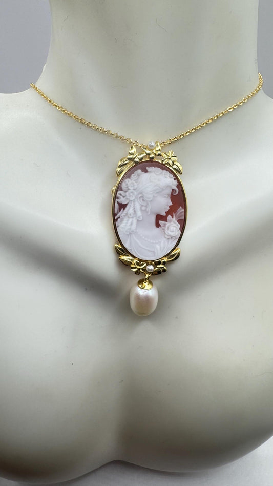 Vintage Carved Cameo Yellow Gold 925 Sterling Silver Necklace Choker pin brooch