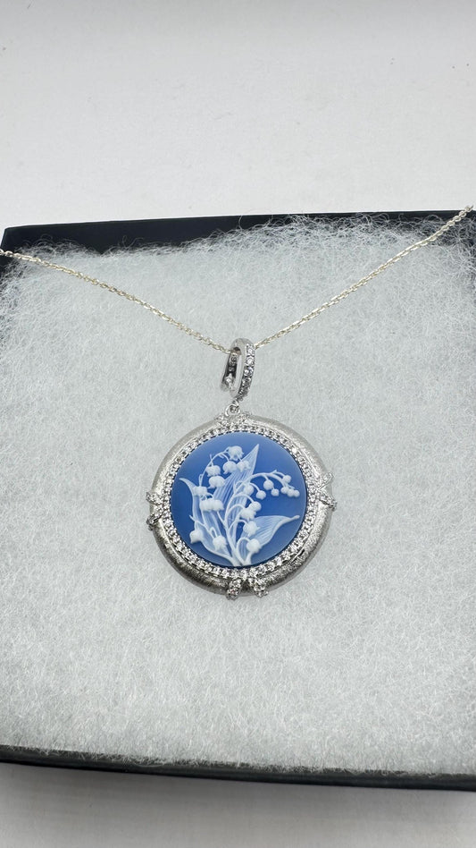 Vintage Lily of the Valley Green Onyx Cameo Choker 925 Sterling Silver Necklace
