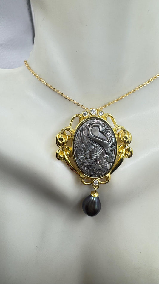Vintage Abalone Pearl Black Swan Cameo Gold 925 Sterling silver Necklace Pin Choker