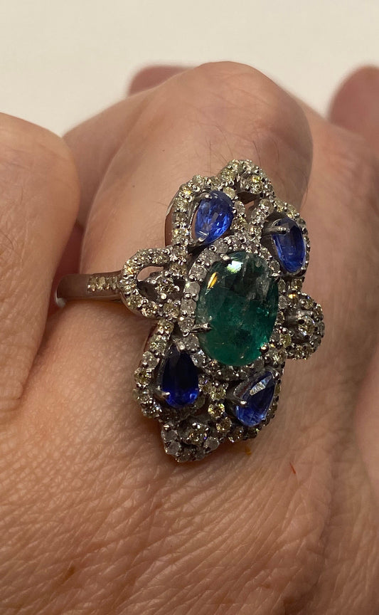 Vintage Emerald Tanzanite Diamond Cocktail Ring 925 Sterling Silver Size 6.5