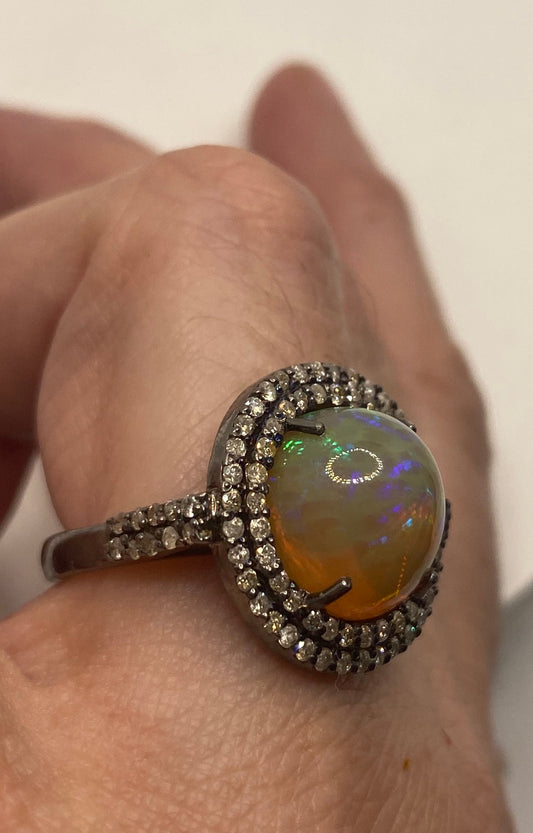 Vintage Fire Opal Sapphire Diamond Cocktail Ring 925 Sterling Silver Size 7