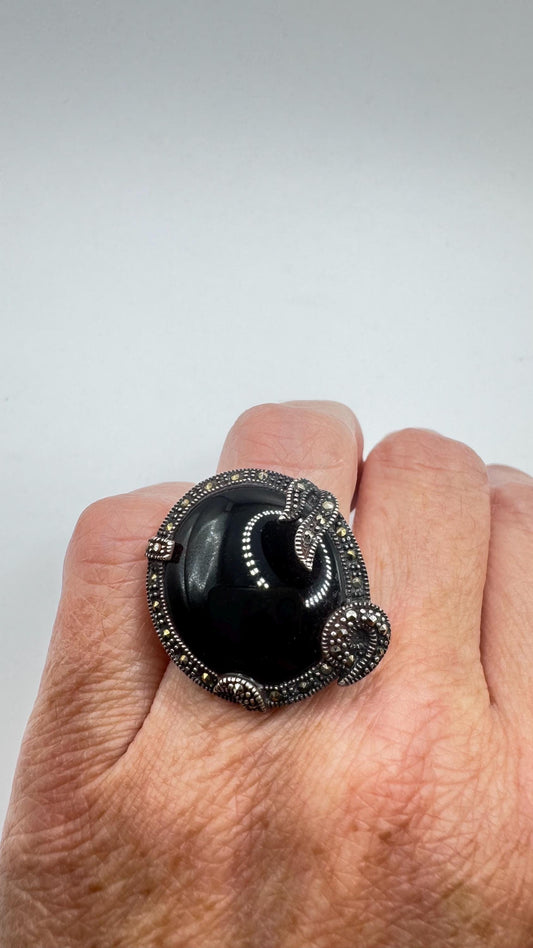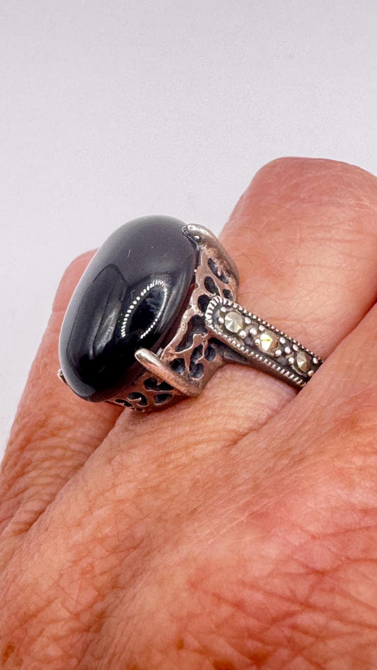 Vintage Genuine Black Onyx Silver Marcasite Ring