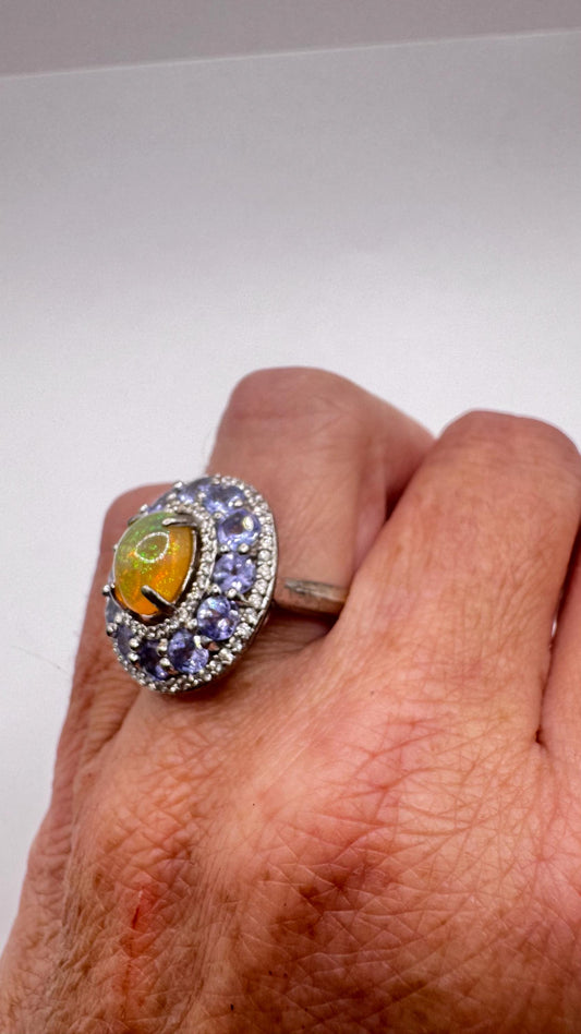 Vintage Orange Ethiopian Fire Opal surrounded by Blue Tanzanite Diamond 925 Sterling Silver Ring