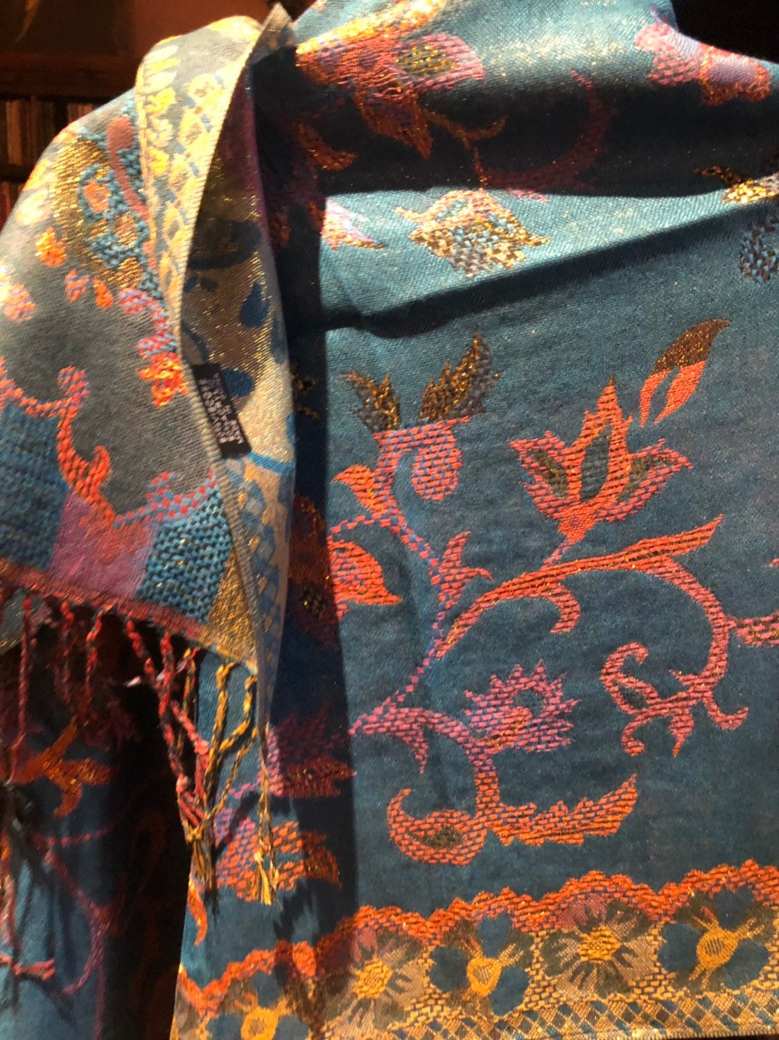 Golden Vintage Blue Green Gold Metallic Paisley Brocade Pashmina Scarf Wrap