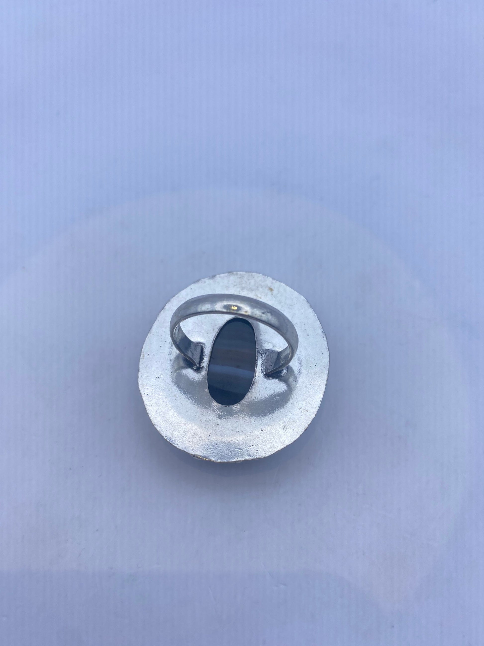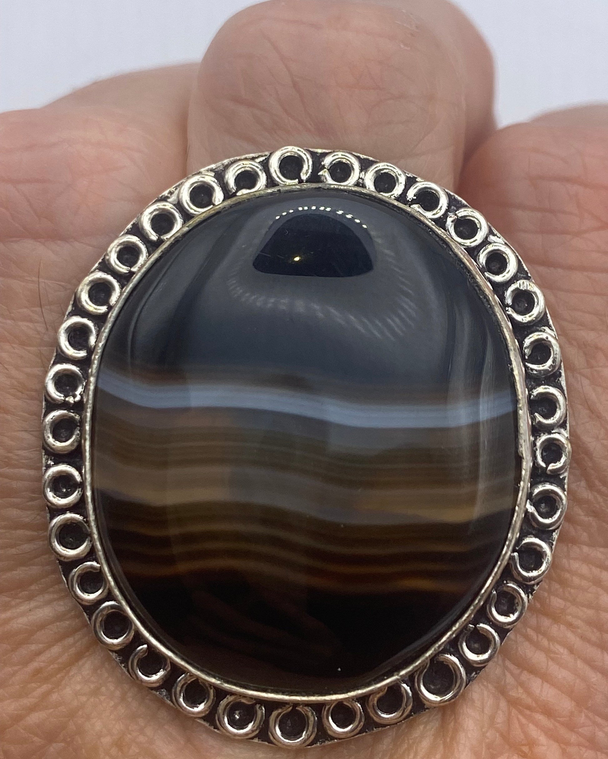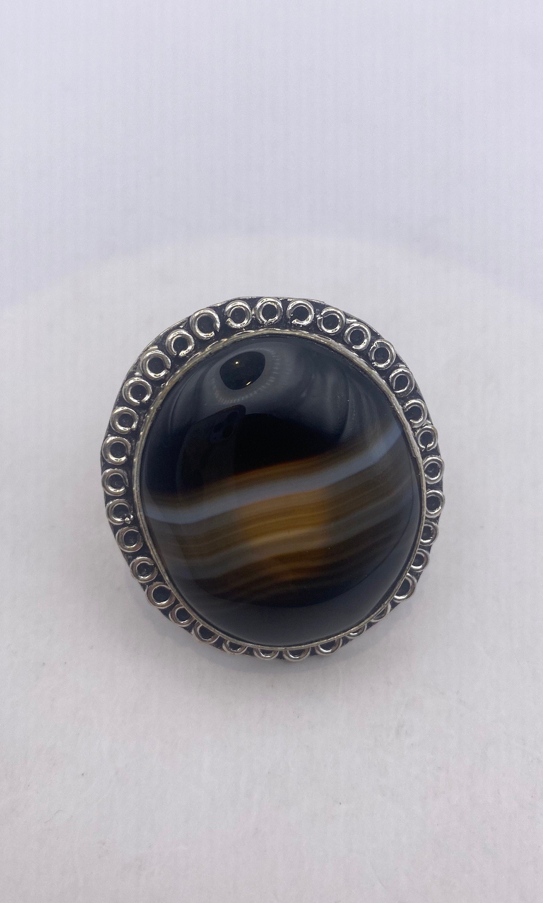 Vintage Black and White Banded Agate White Bronze Silver Cocktail Ring