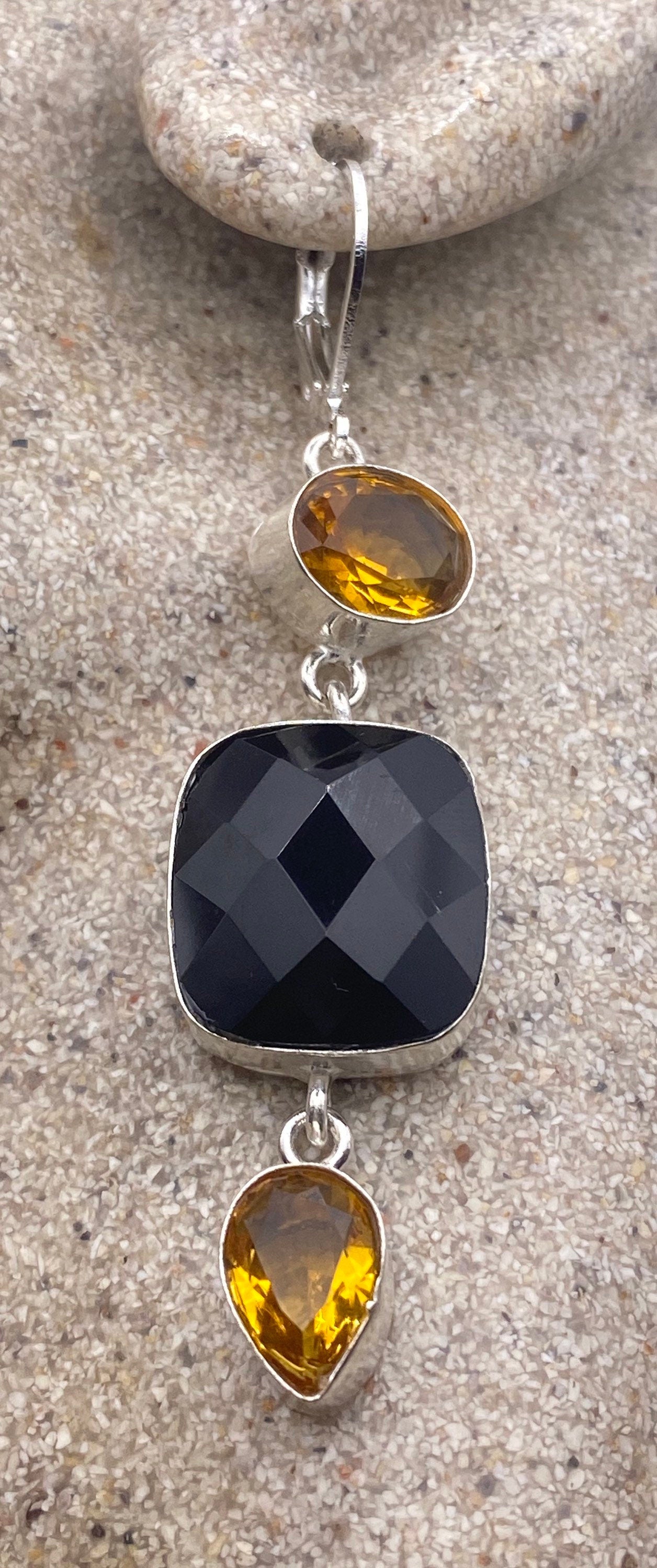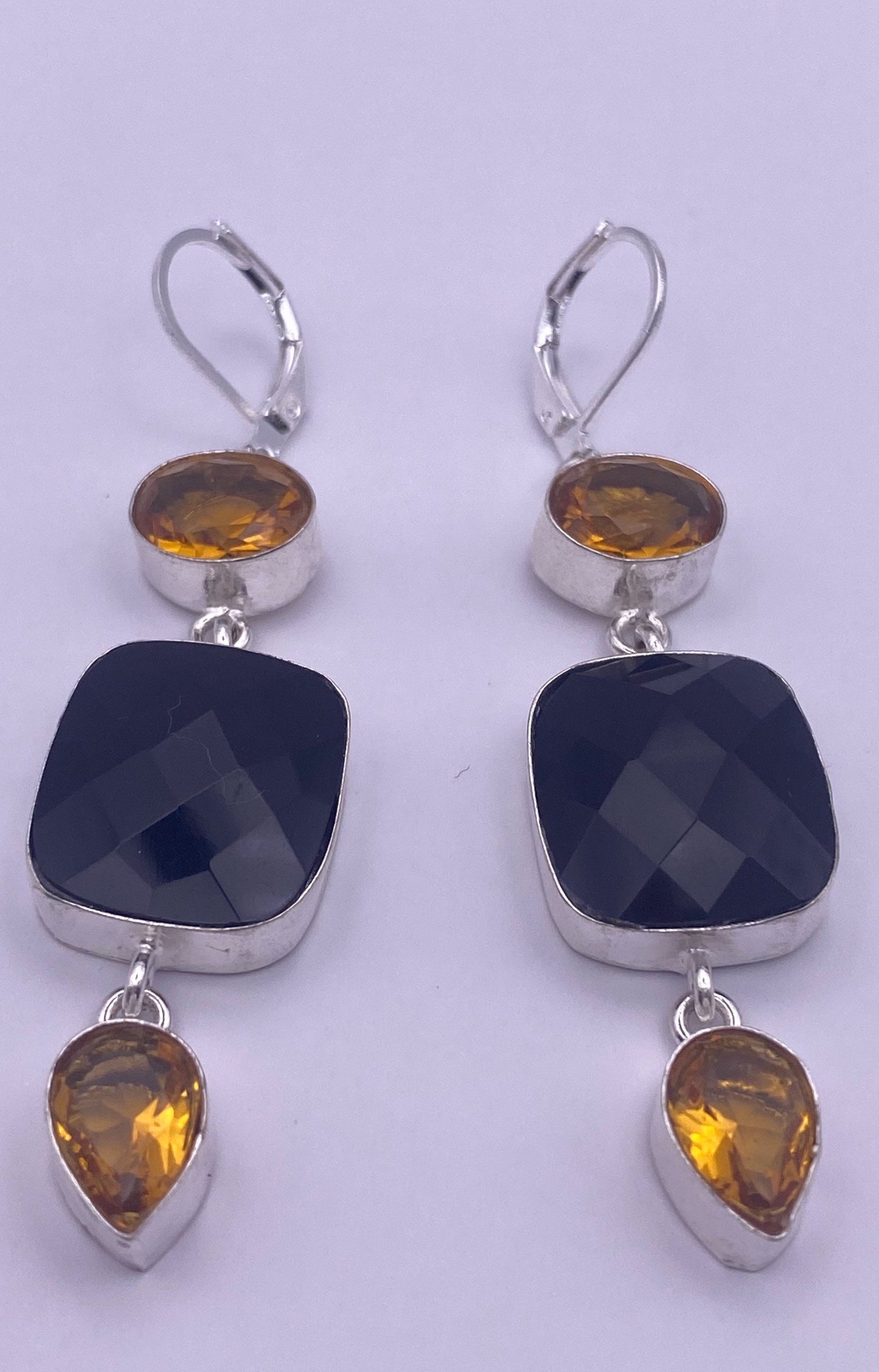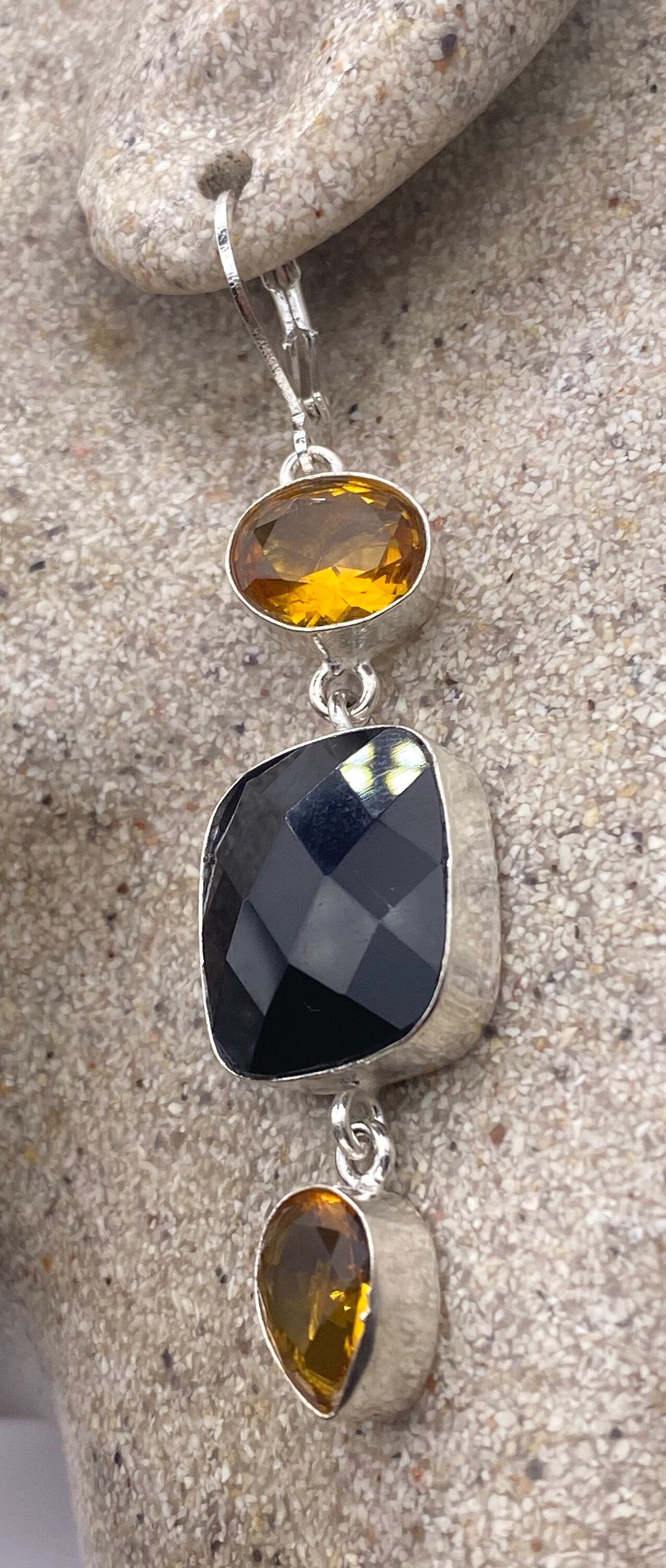 Black onyx earrings set with citrine. These dangle earrings are over an inch long