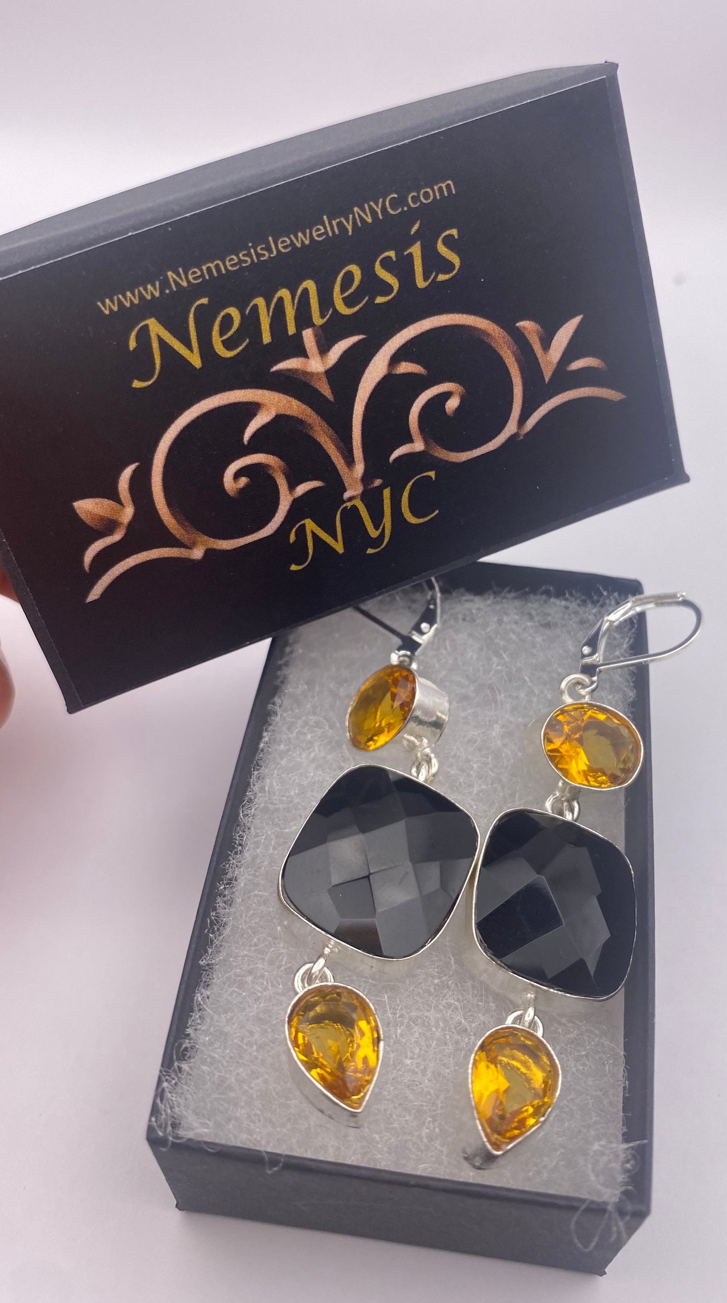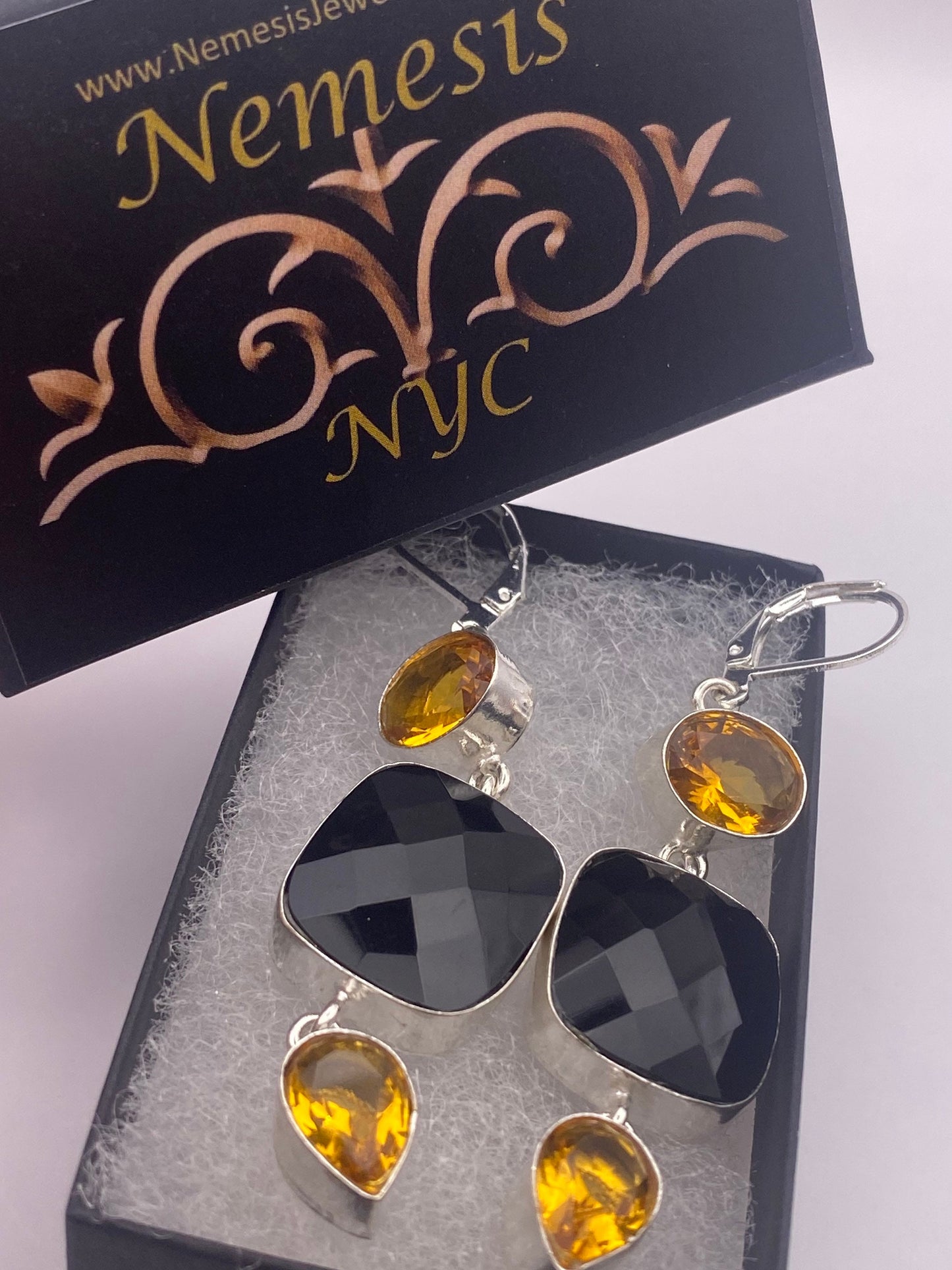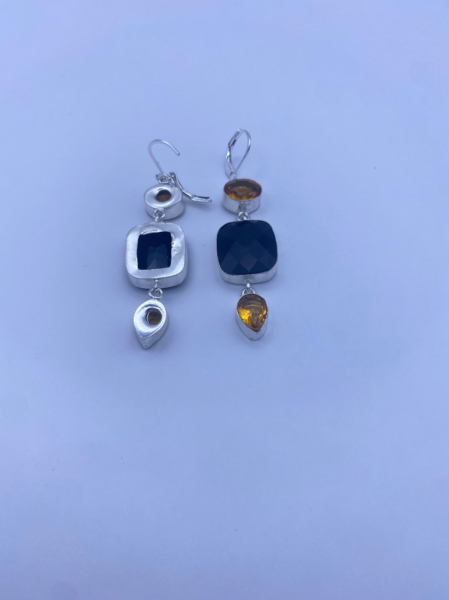 Black onyx earrings set with citrine. These dangle earrings are over an inch long