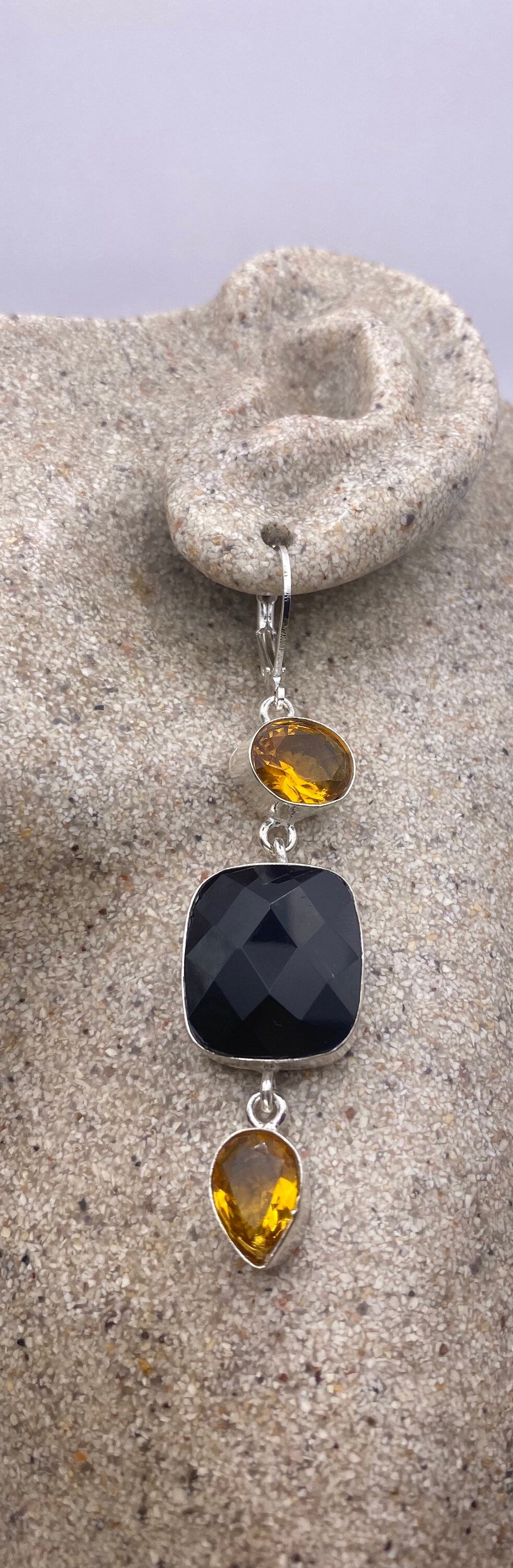 Vintage Black Onyx Citrine Sterling Silver Deco Dangle Earrings