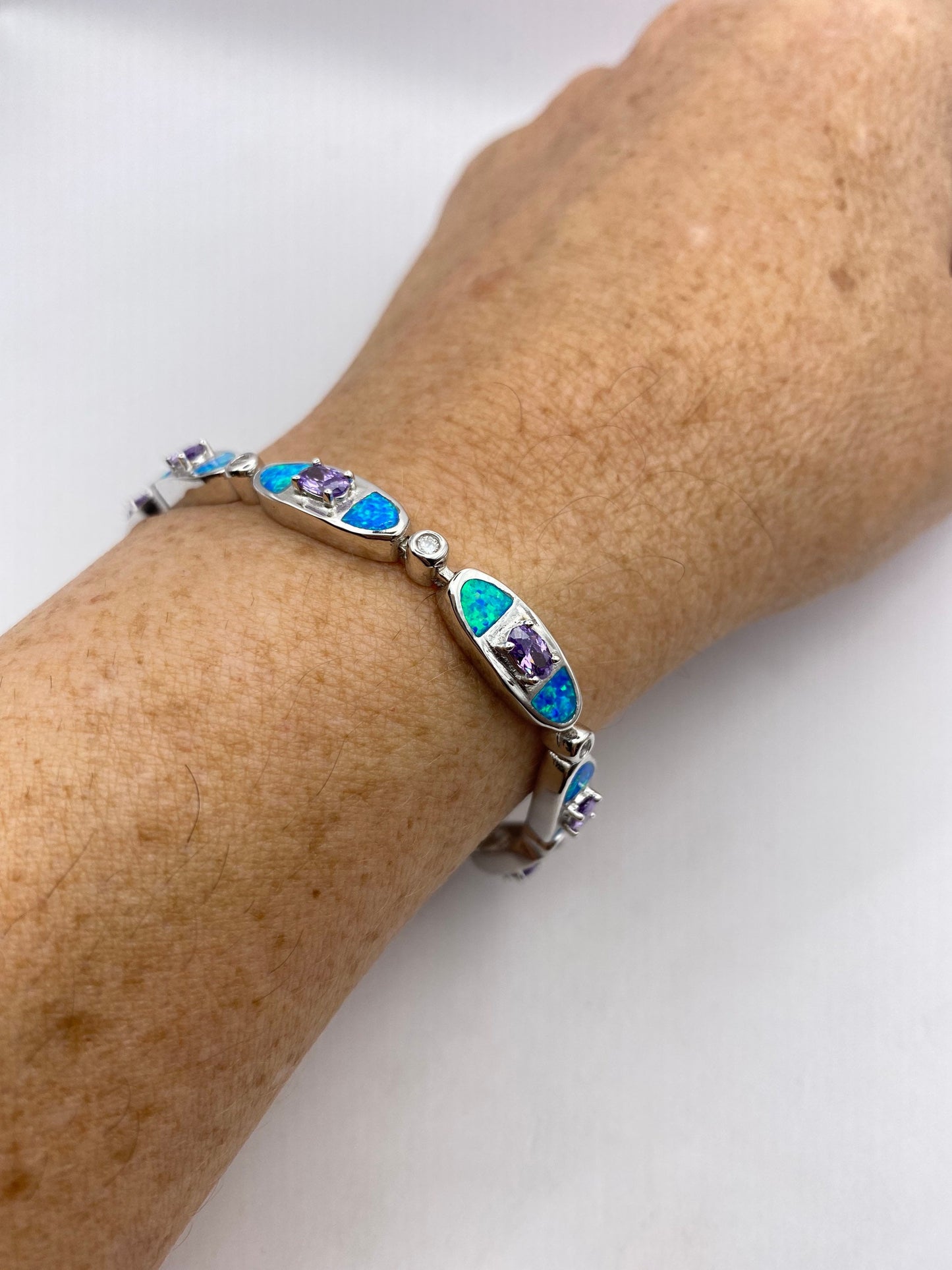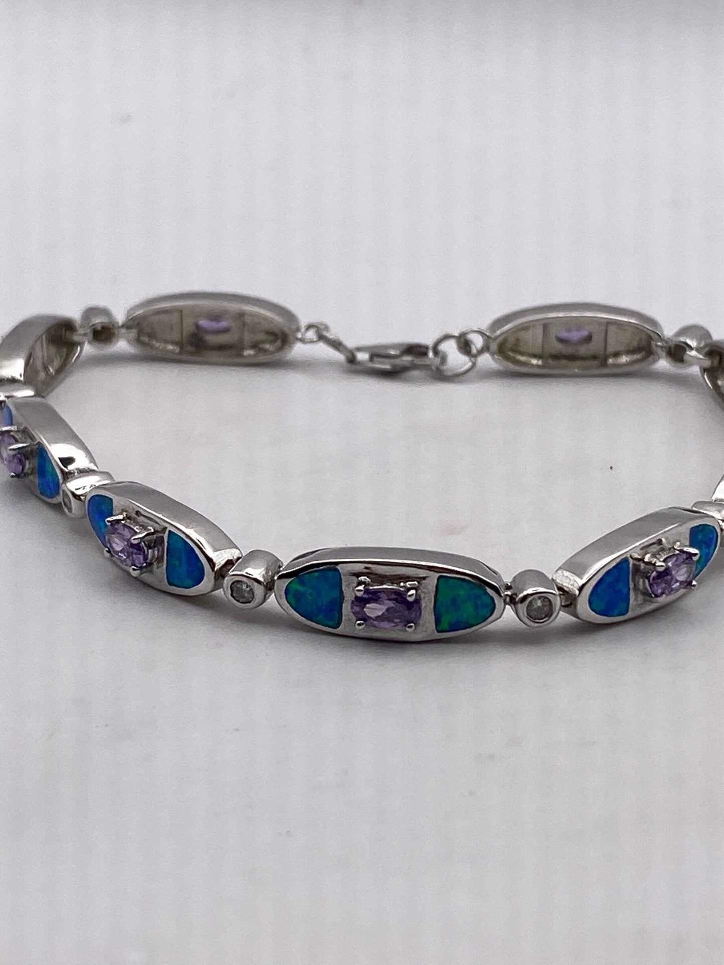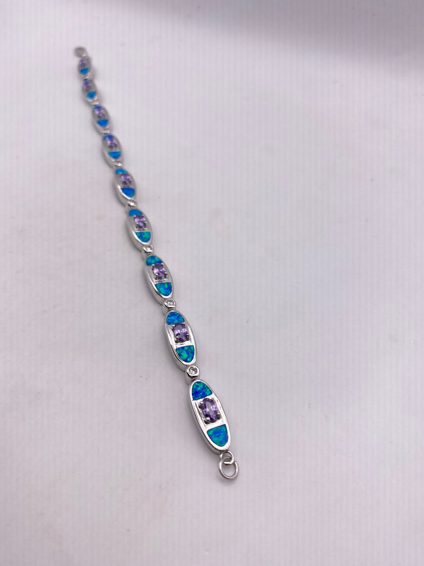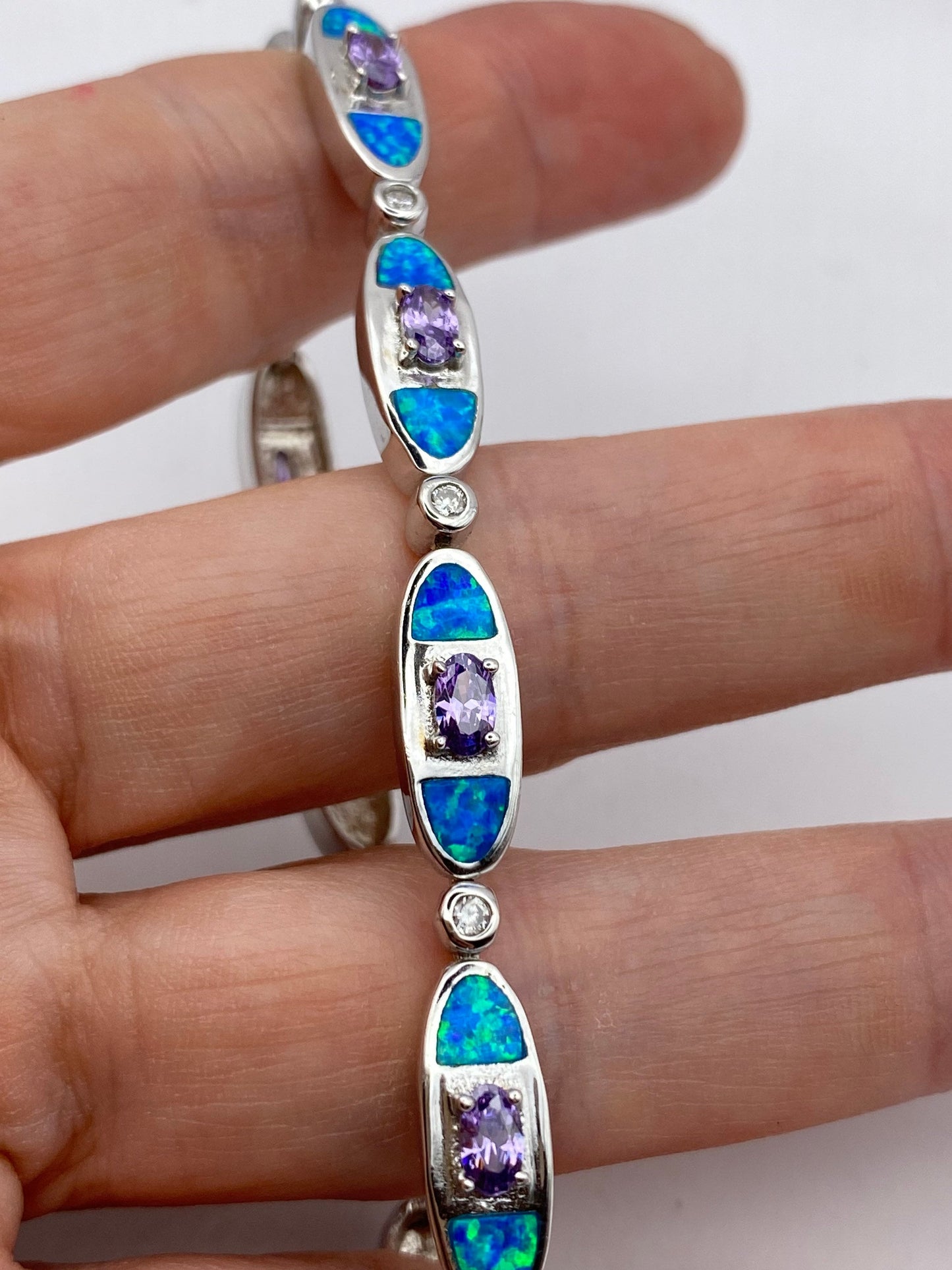 Vintage Blue Fire Opal Amethyst Bracelet inlay 925 Sterling Silver
