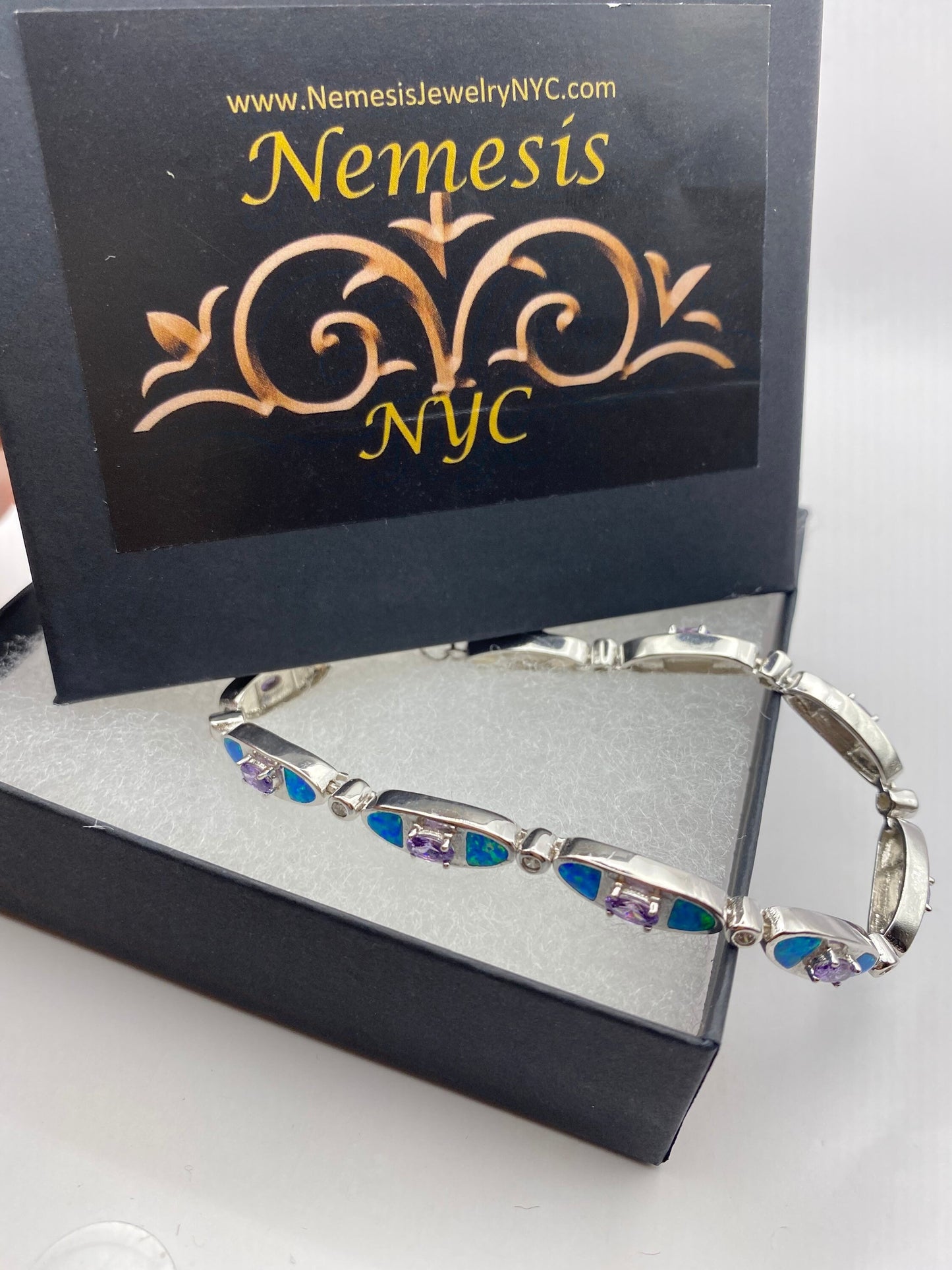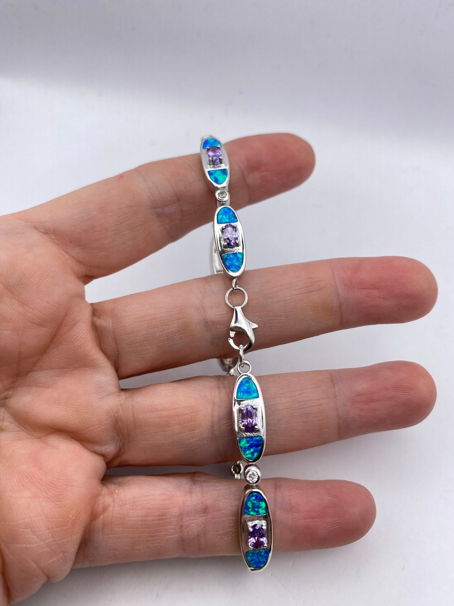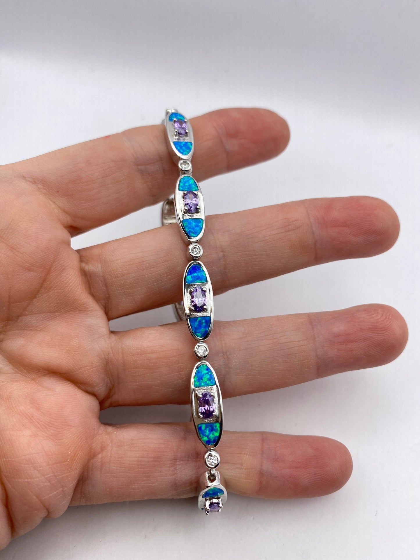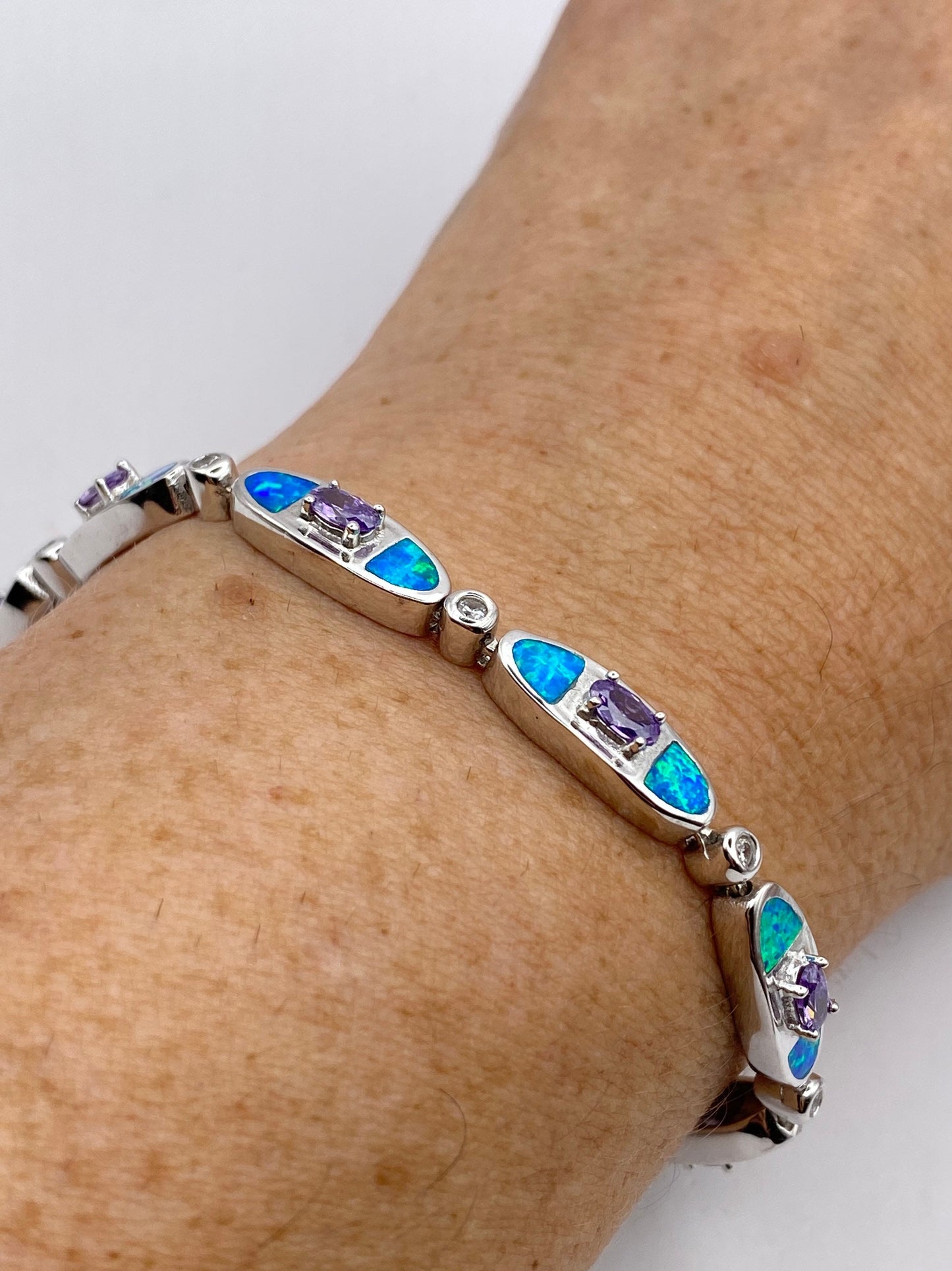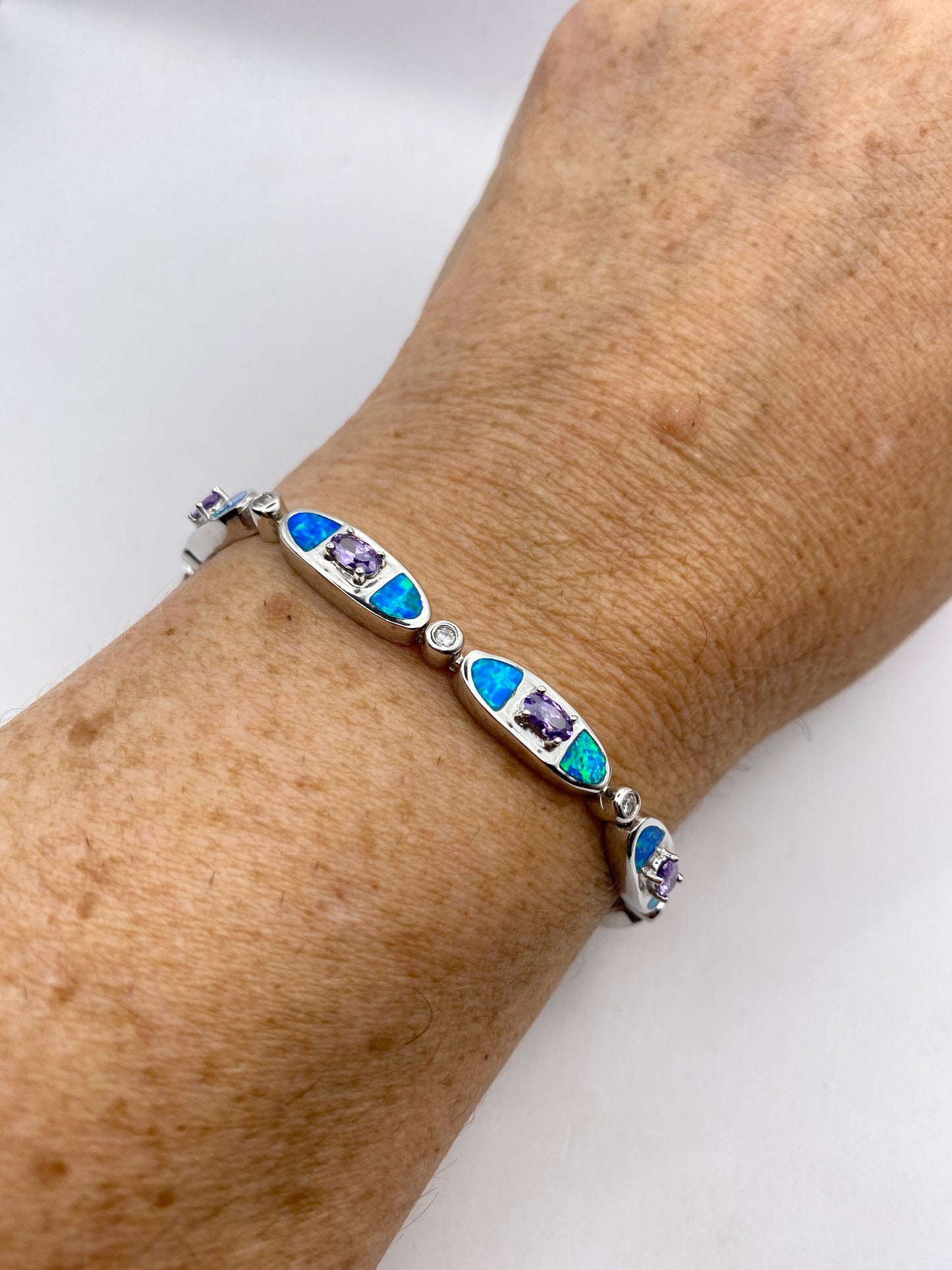 Vintage Blue Fire Opal Amethyst Bracelet inlay 925 Sterling Silver