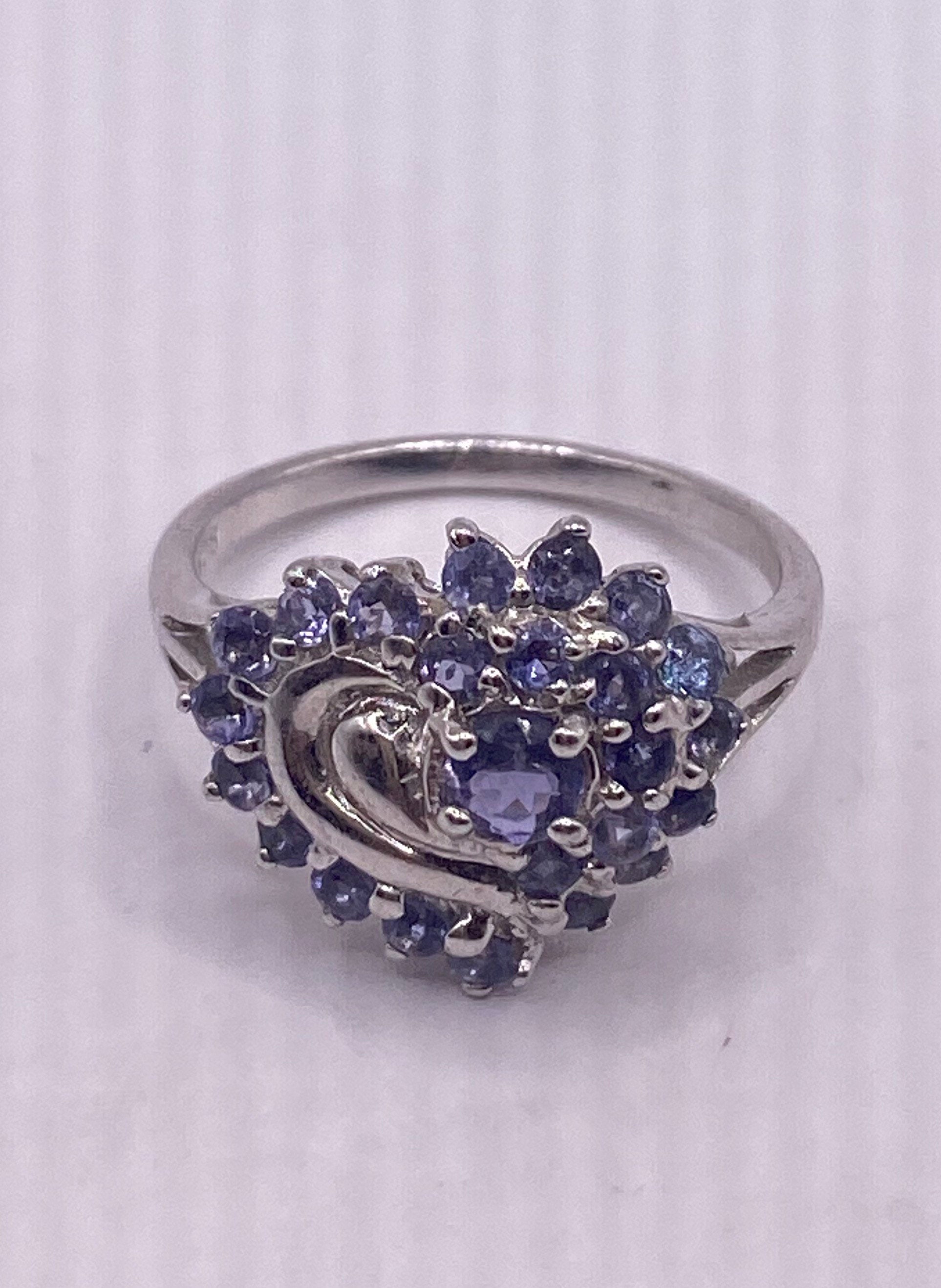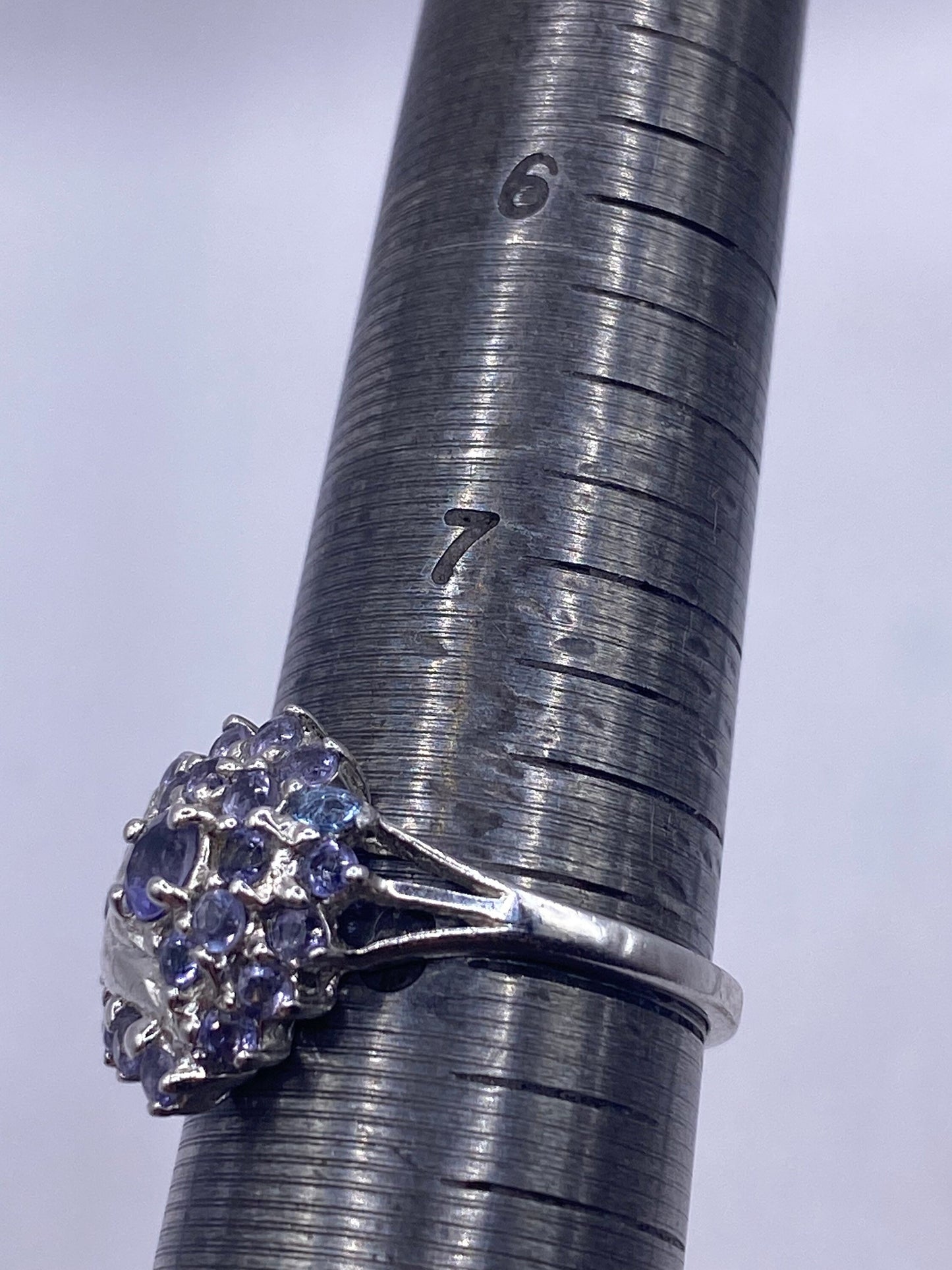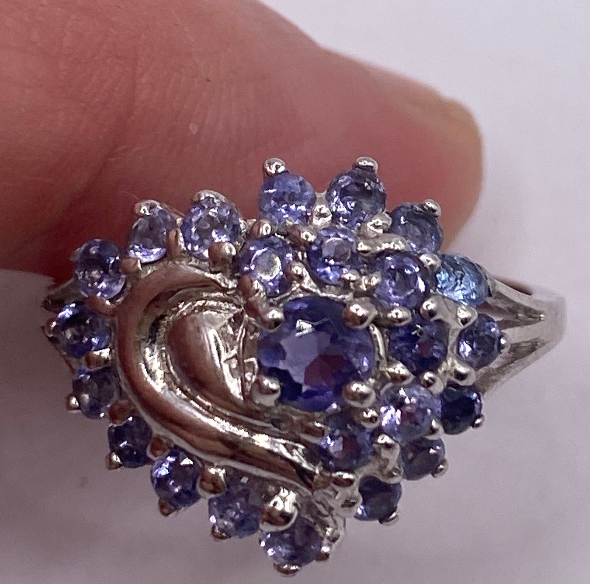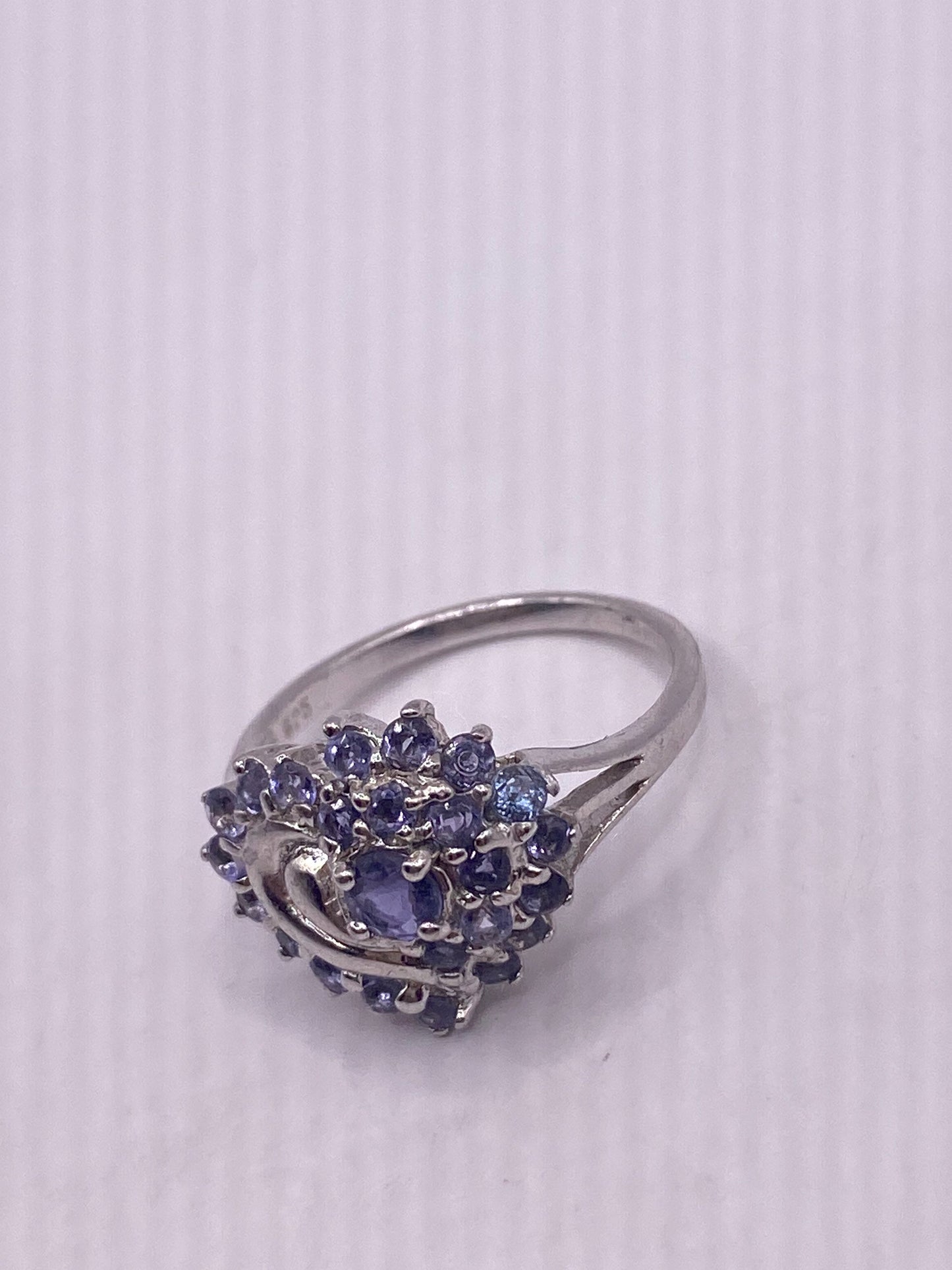 This is a vintage blue iolite in a 925 sterling silver floral setting.