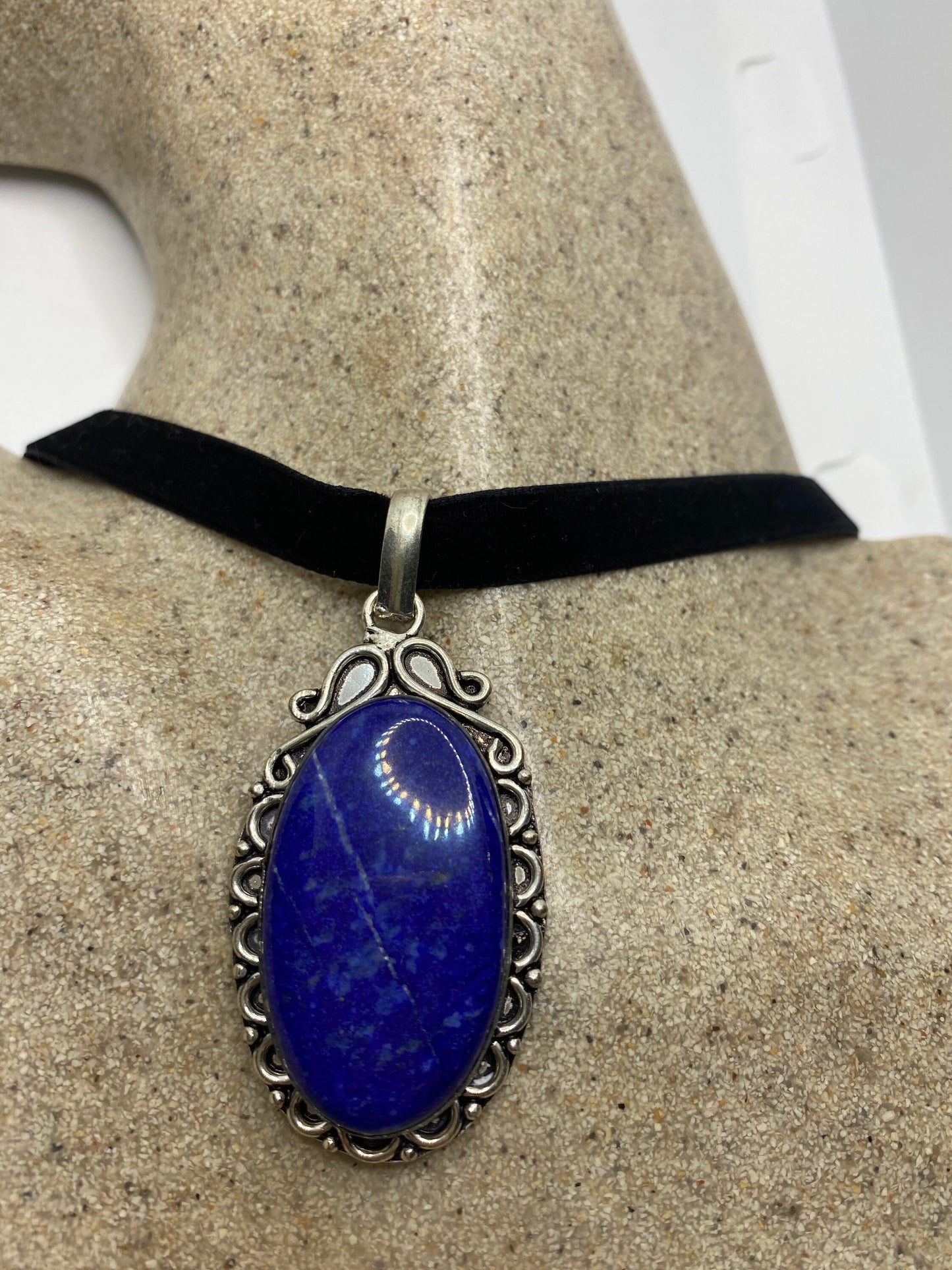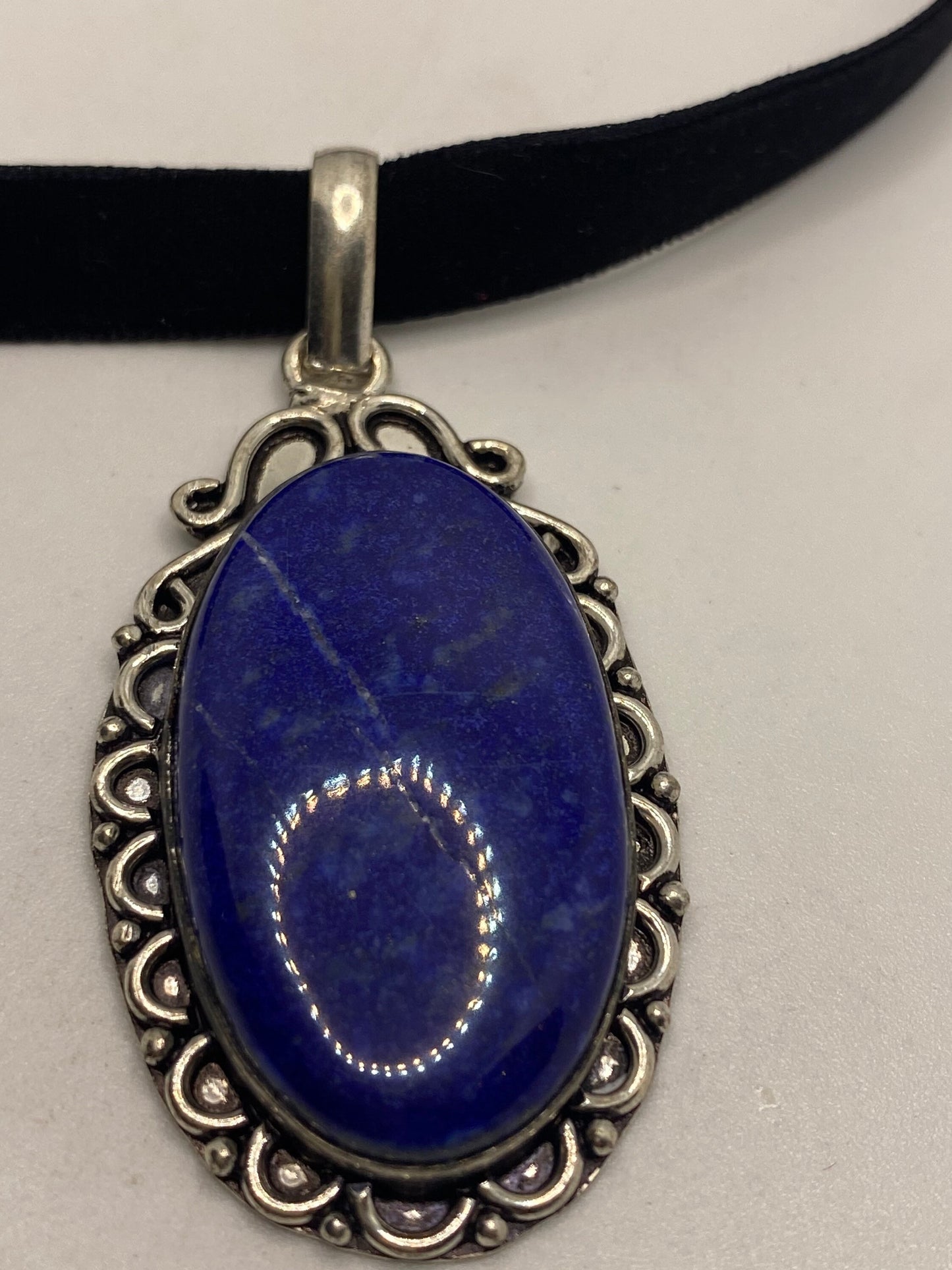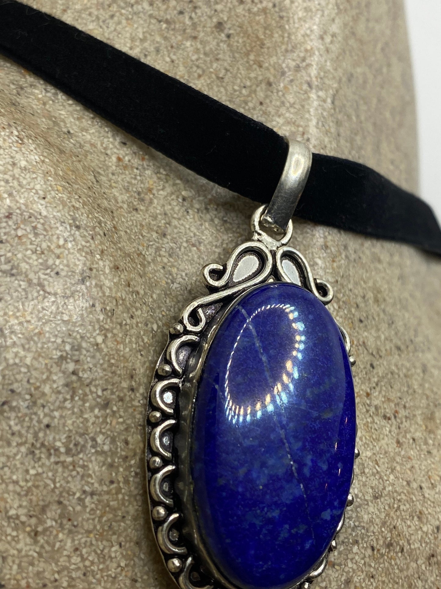 Vintage Blue Lapis Choker Black Velvet Ribbon Necklace.
