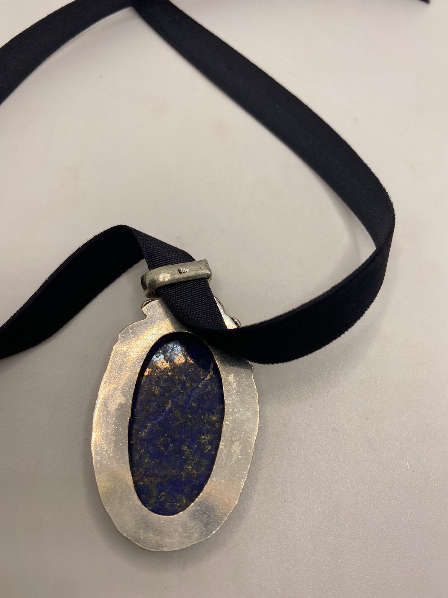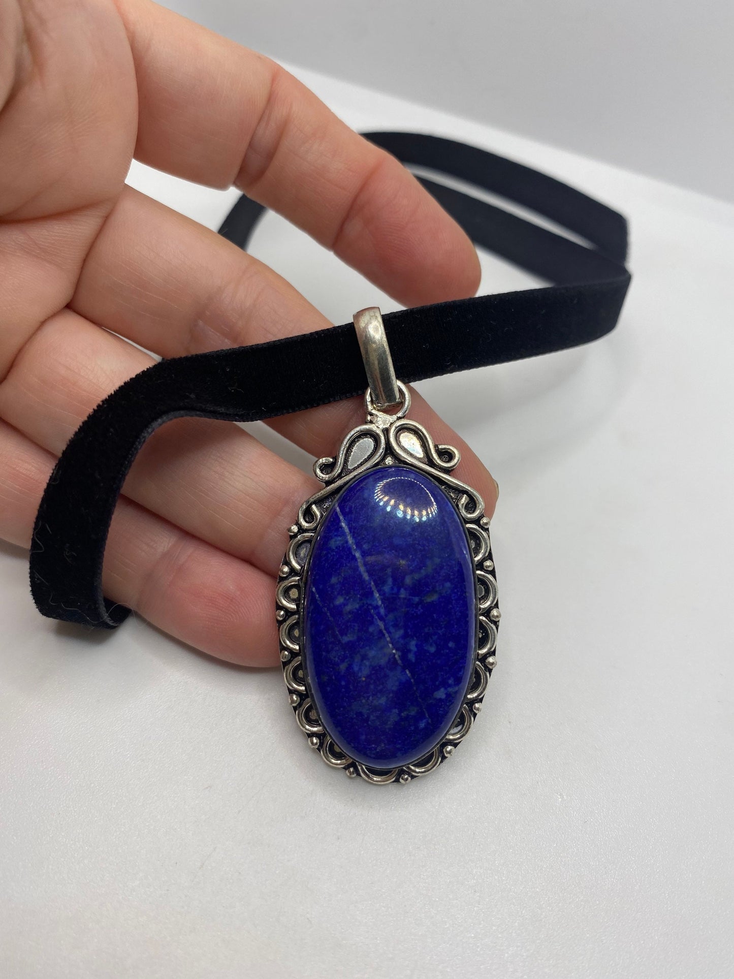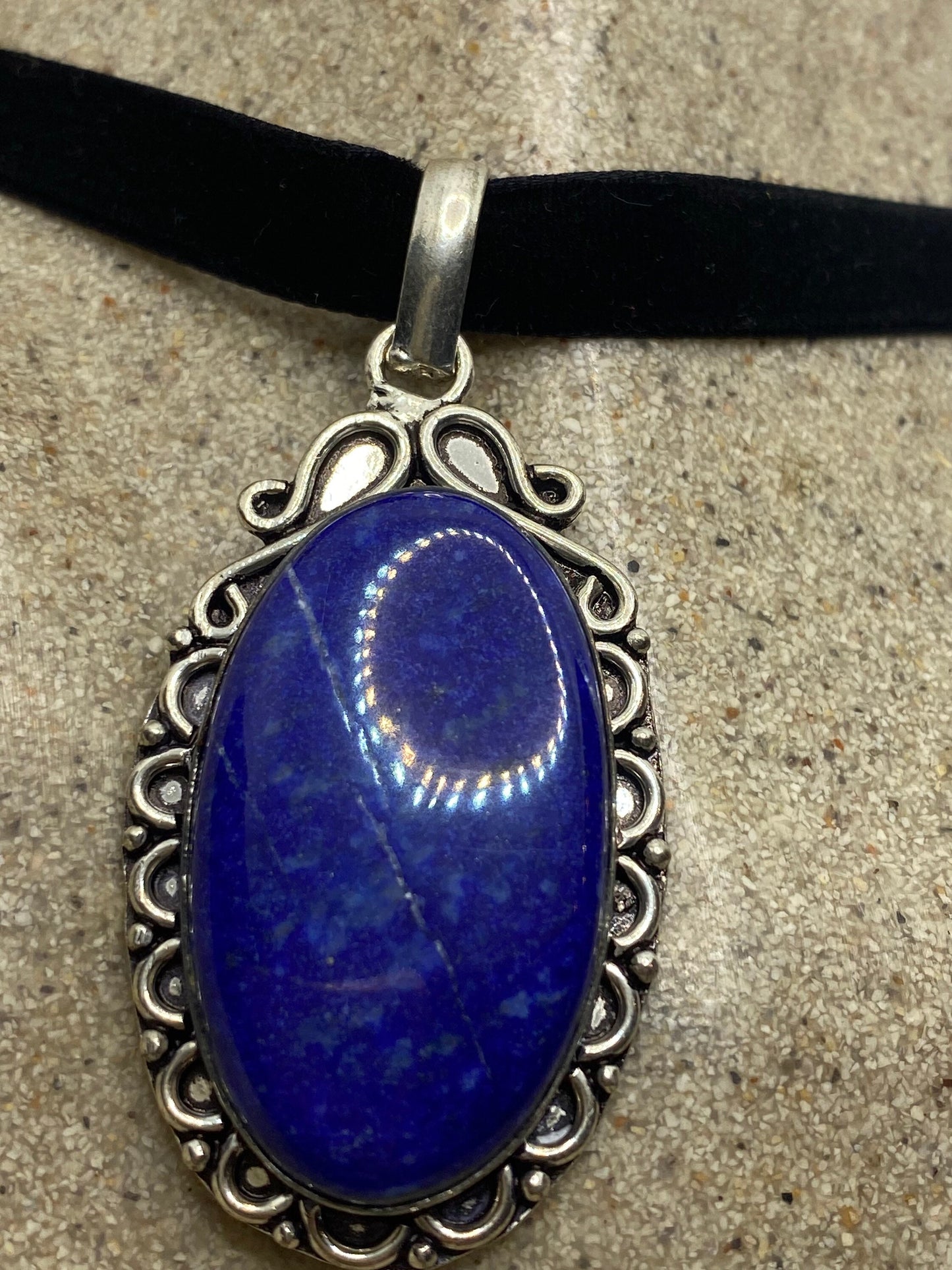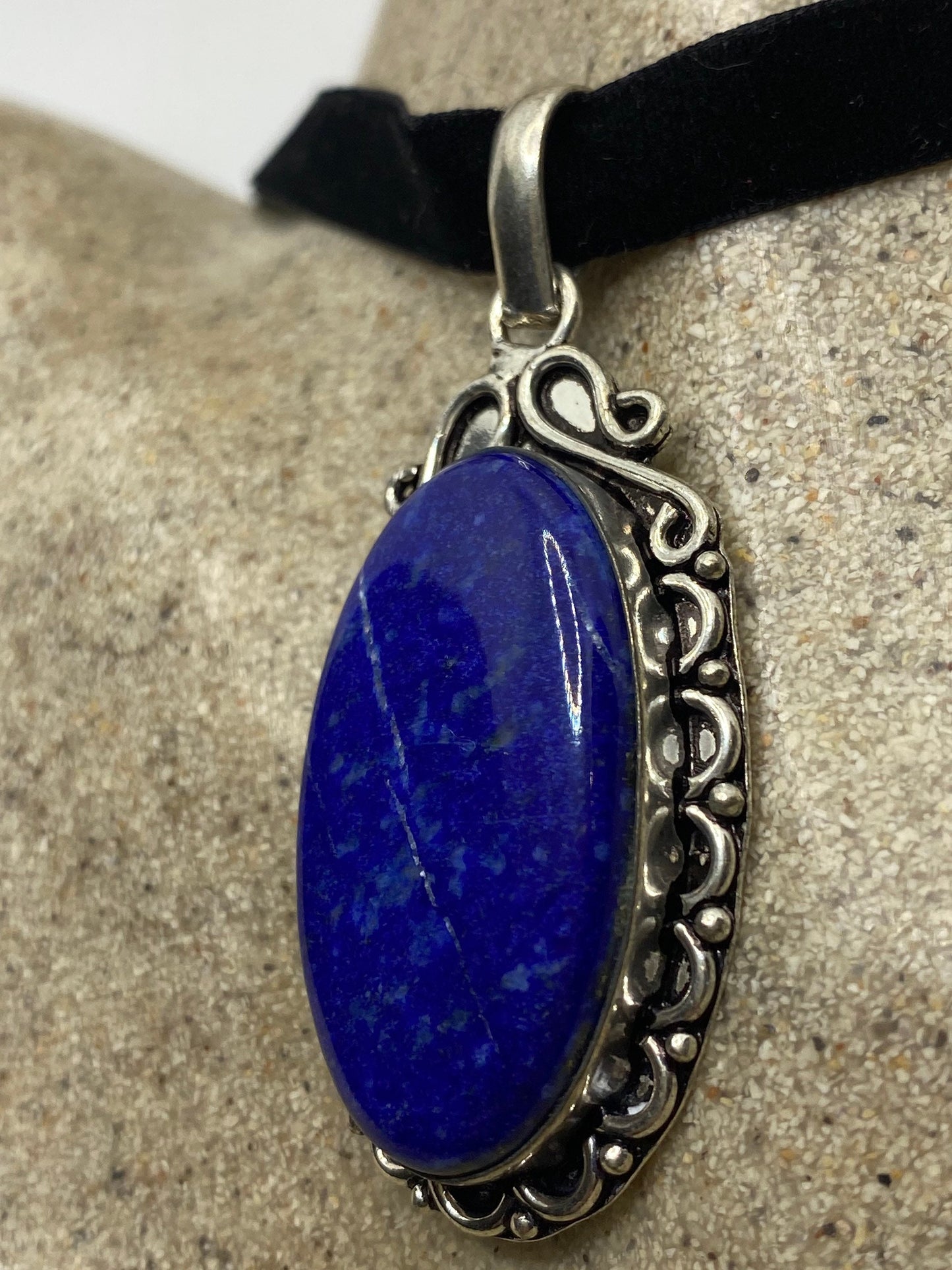 Vintage Blue Lapis Choker Black Velvet Ribbon Necklace.