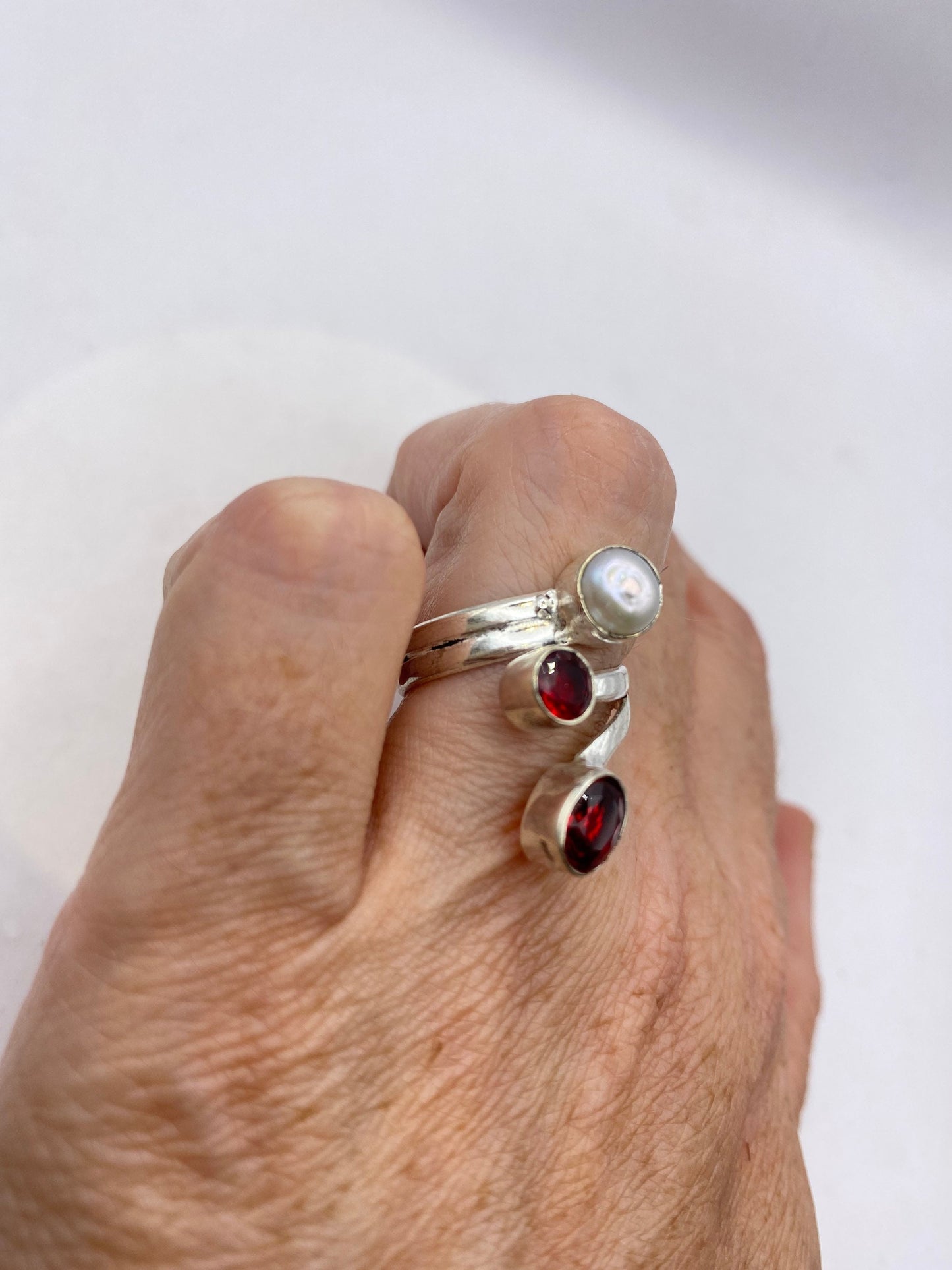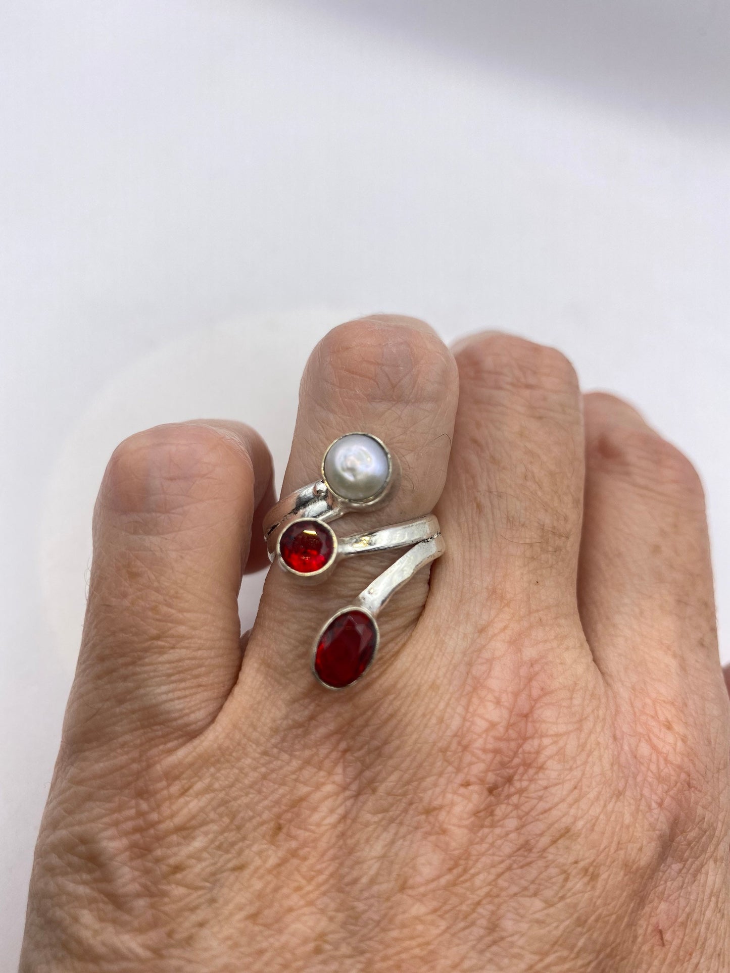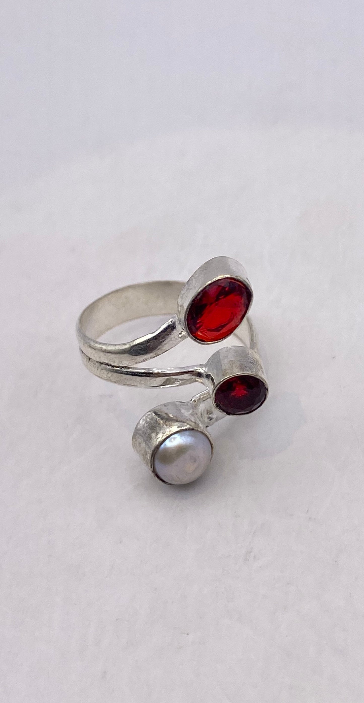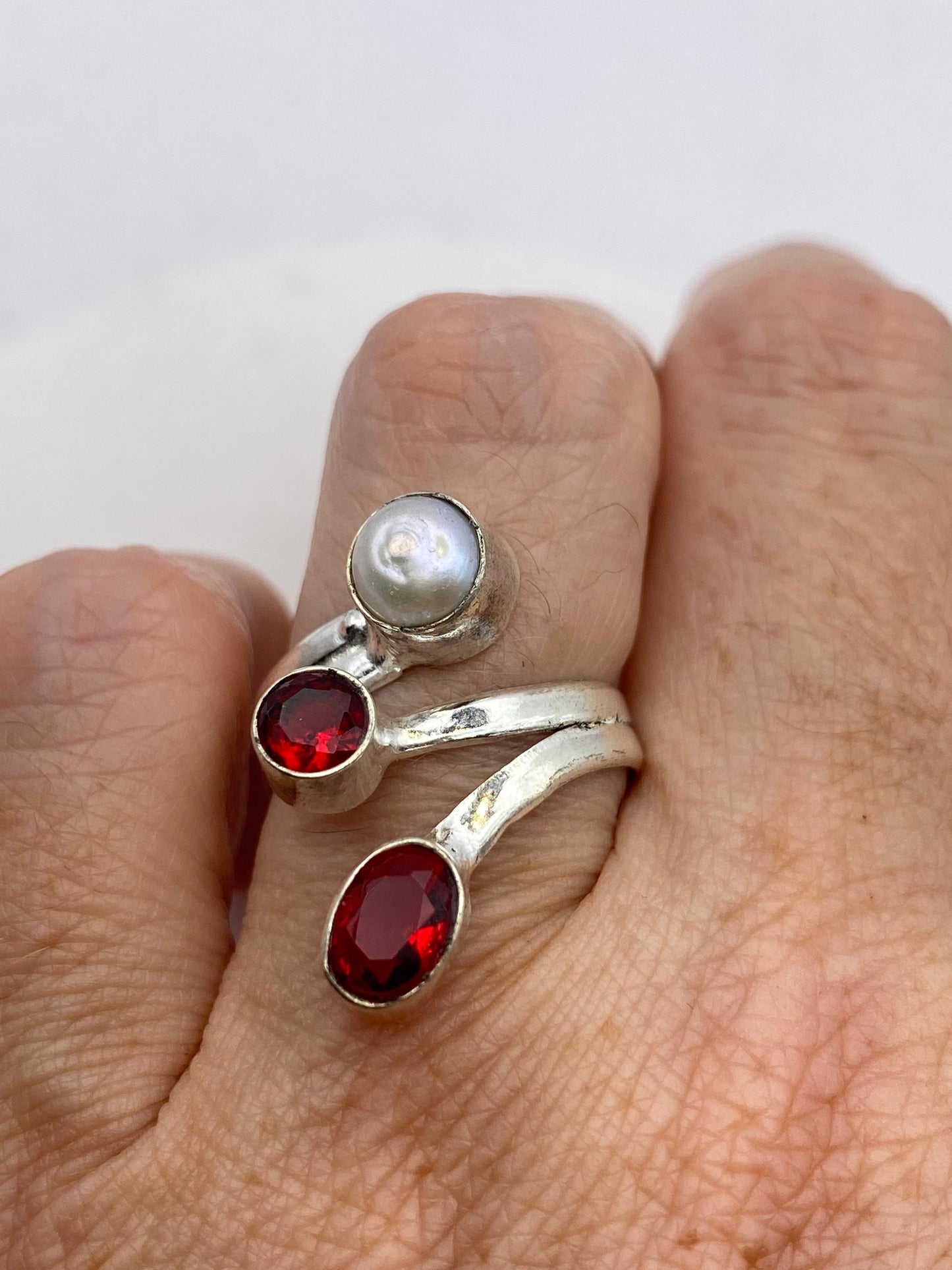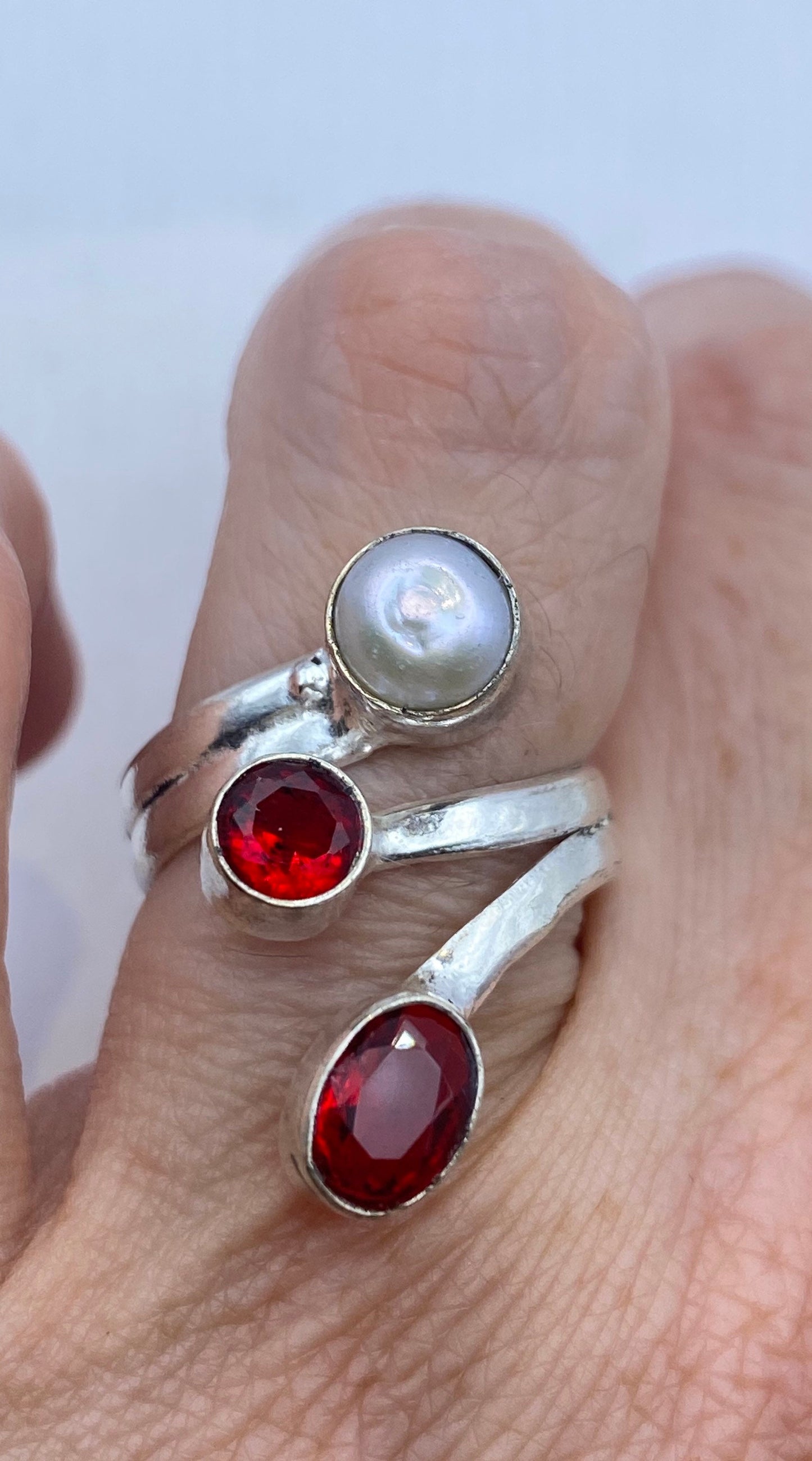 Vintage Boho Ruby Glass Pearl Cocktail Ring Adjustable