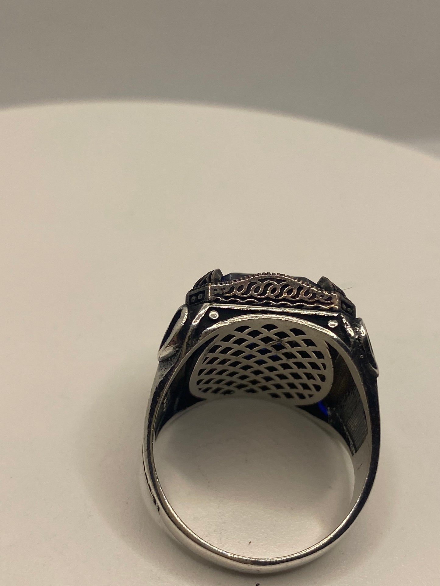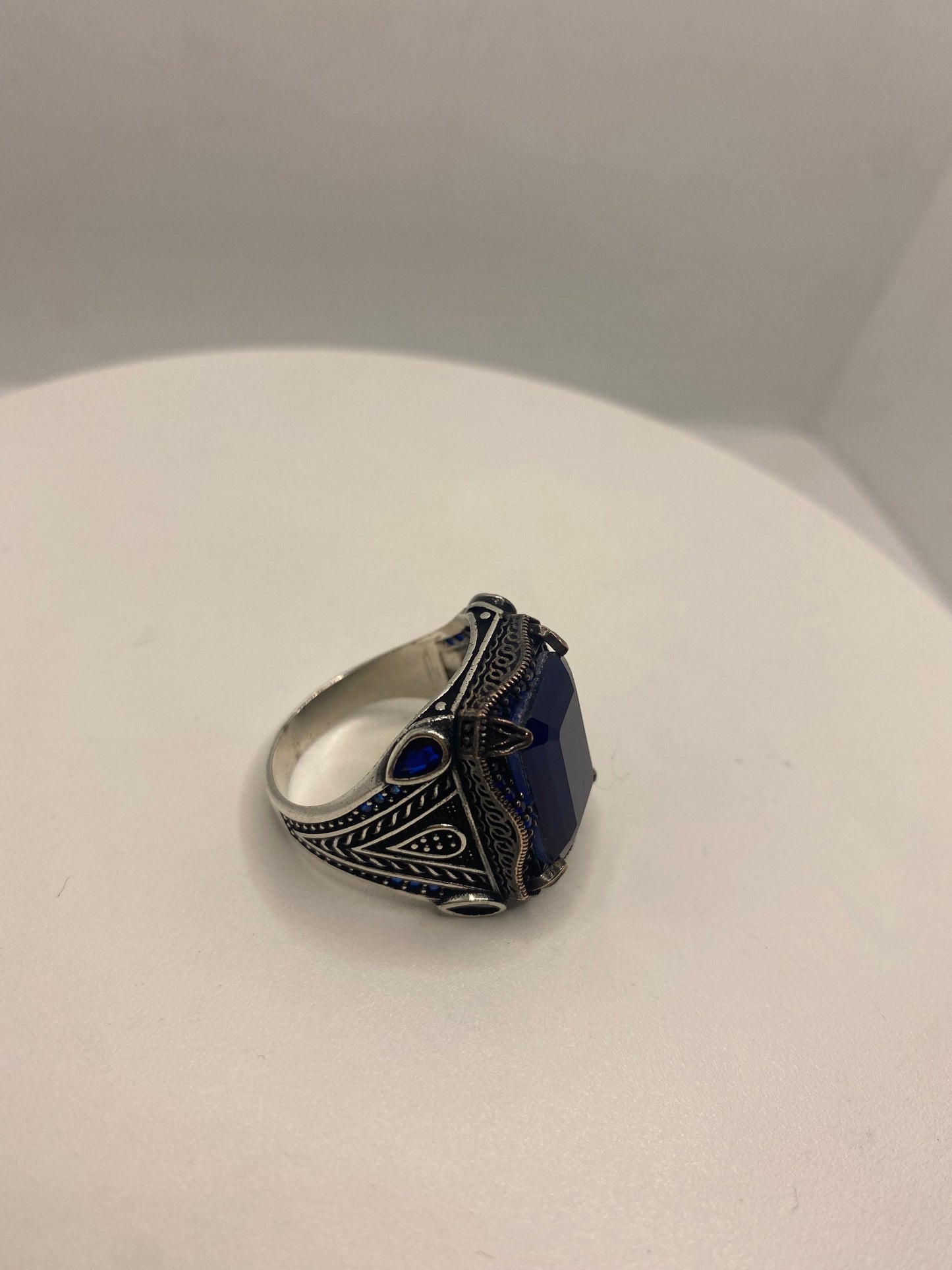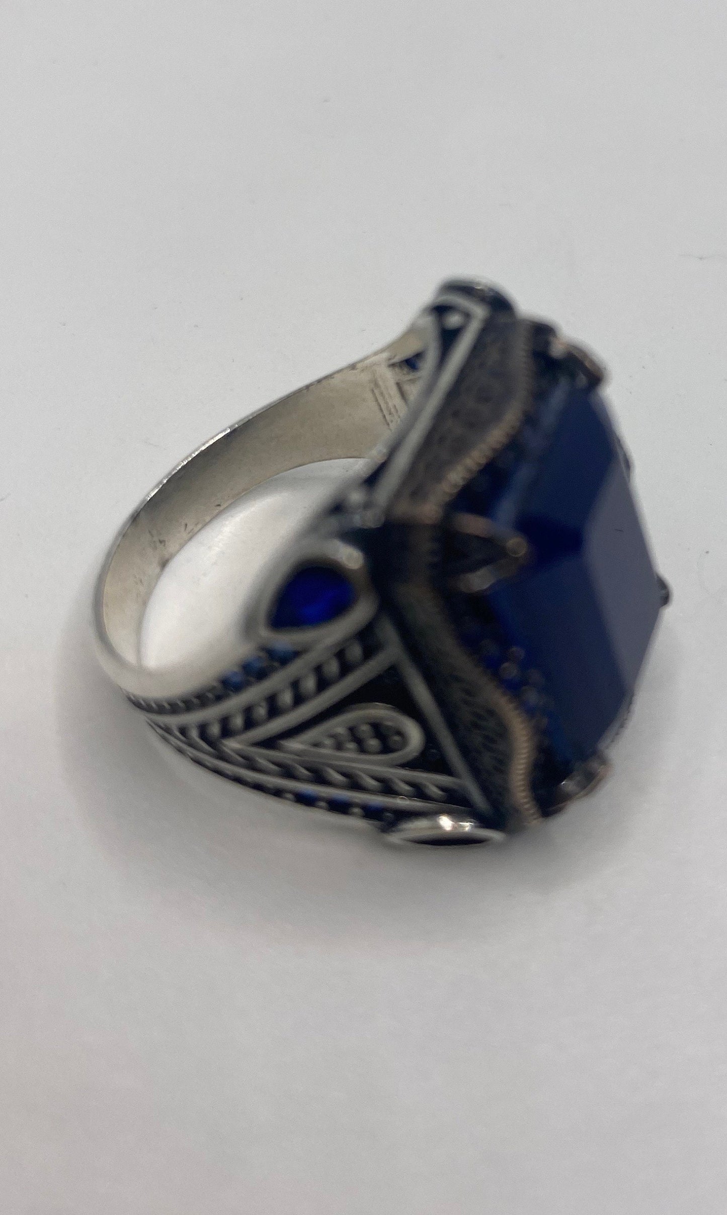 This is a gorgeous one-of-a-kind ring, intricate detail work on the silver set with beep blue stones.