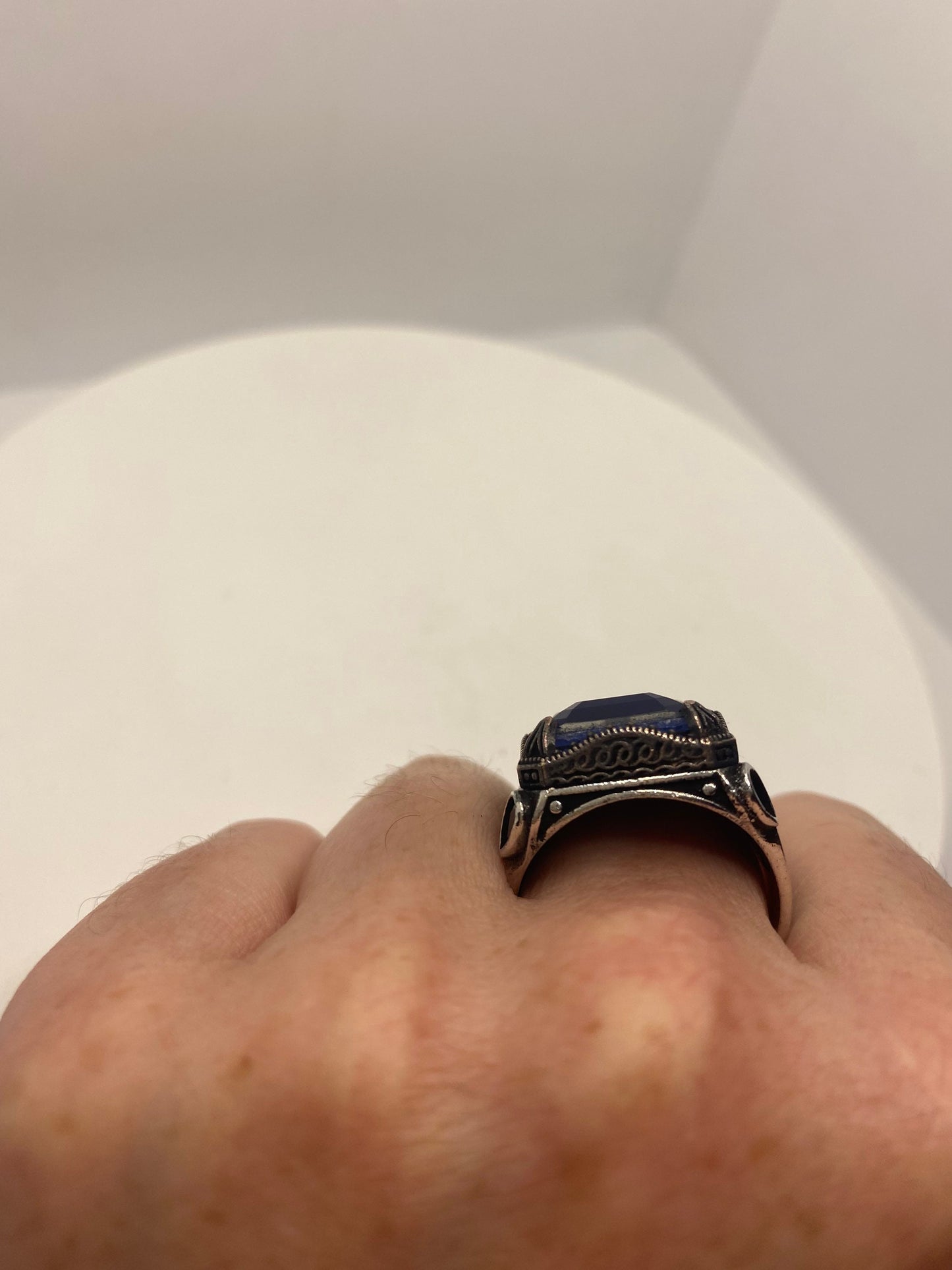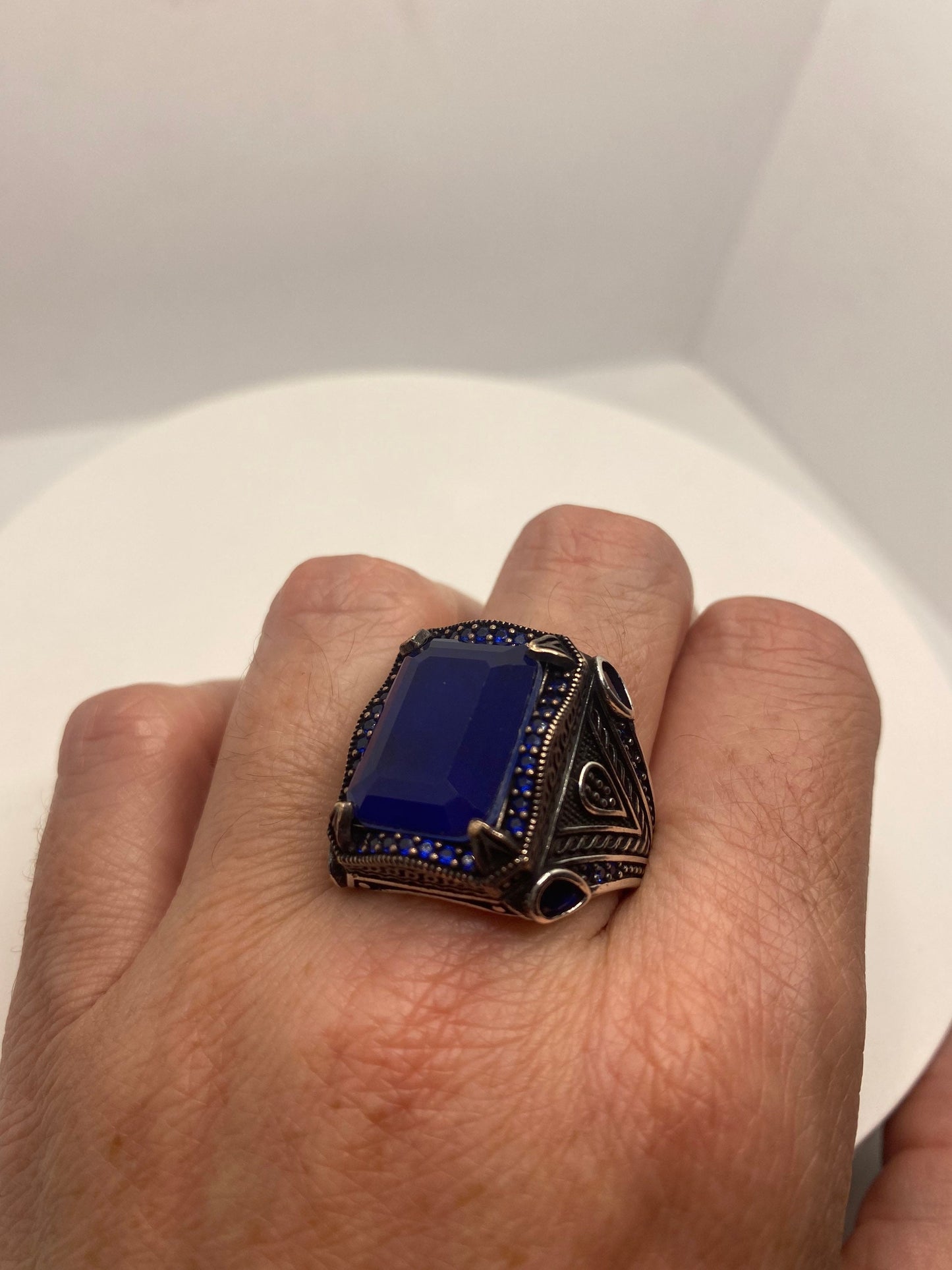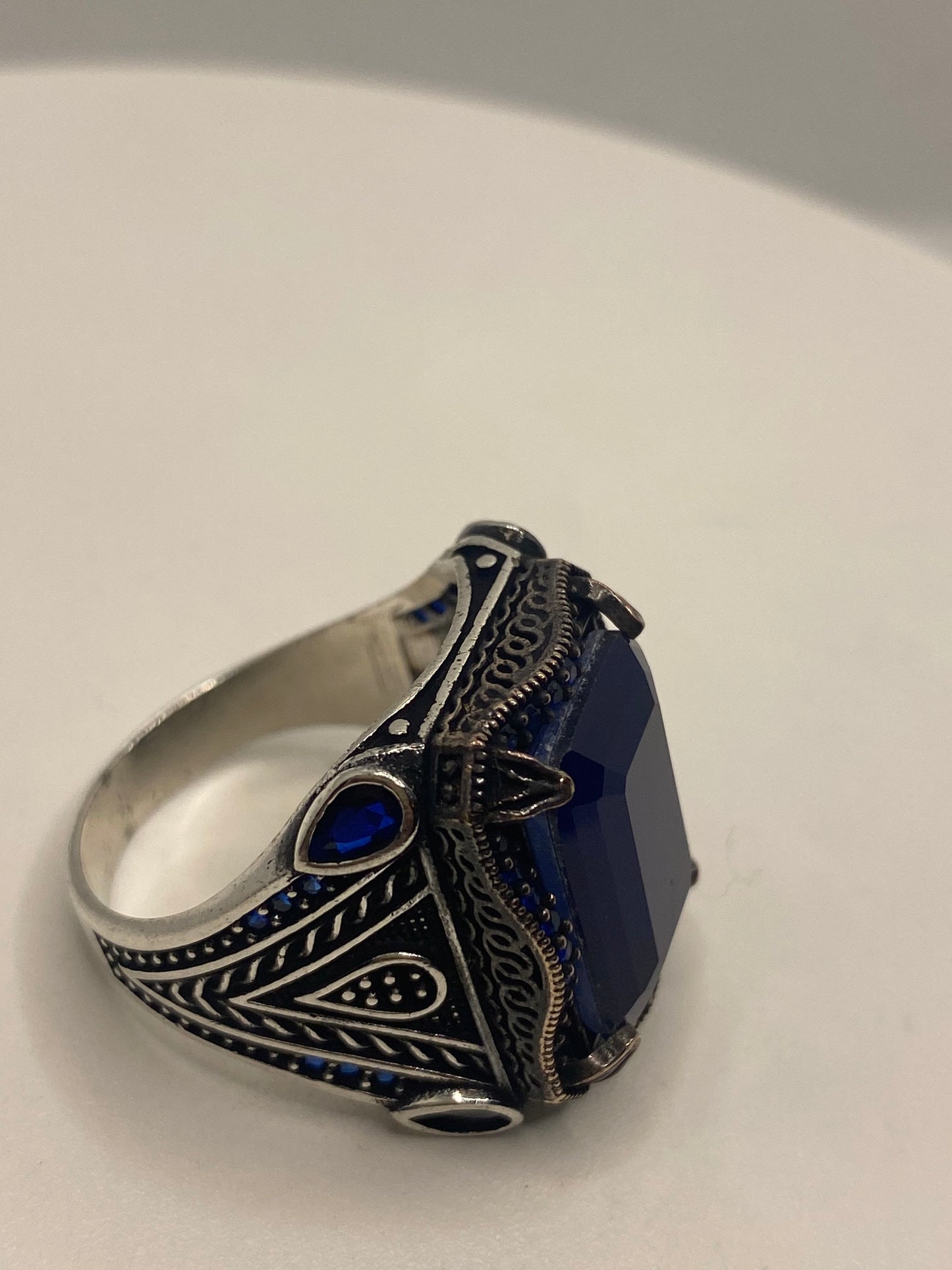 This is a gorgeous one-of-a-kind ring, intricate detail work on the silver set with beep blue stones.