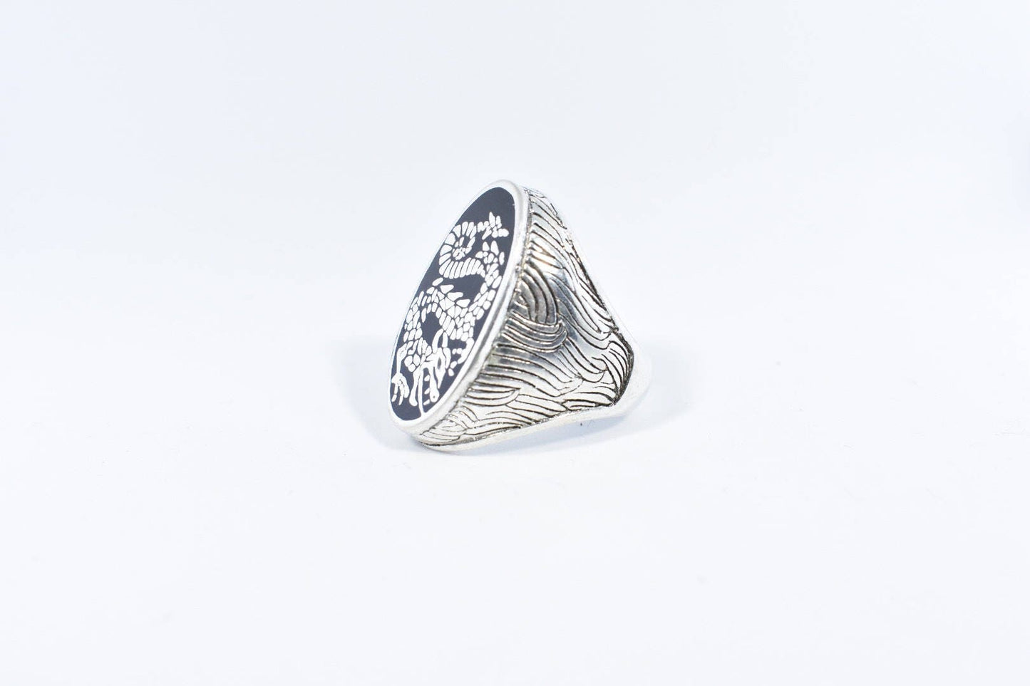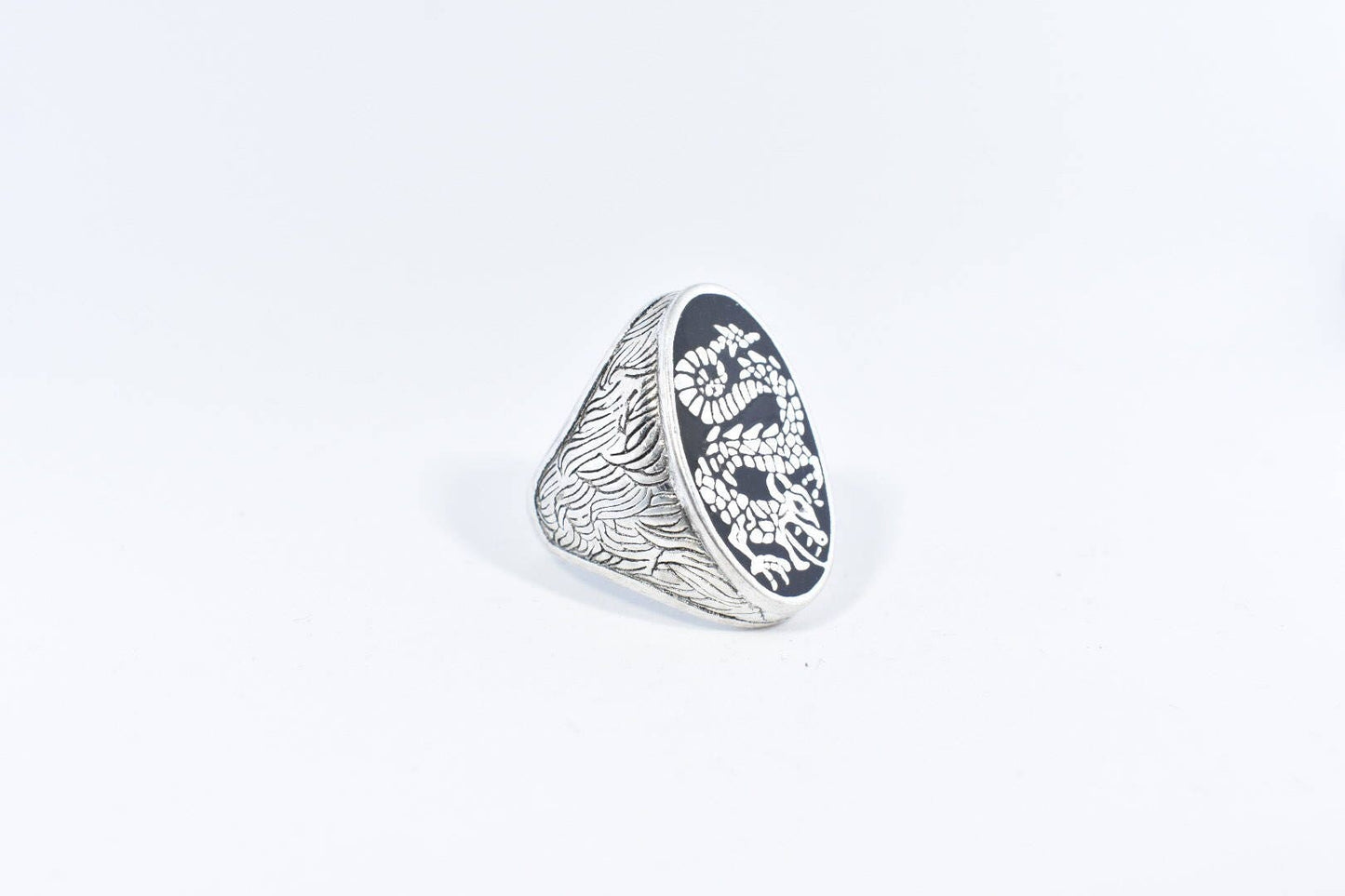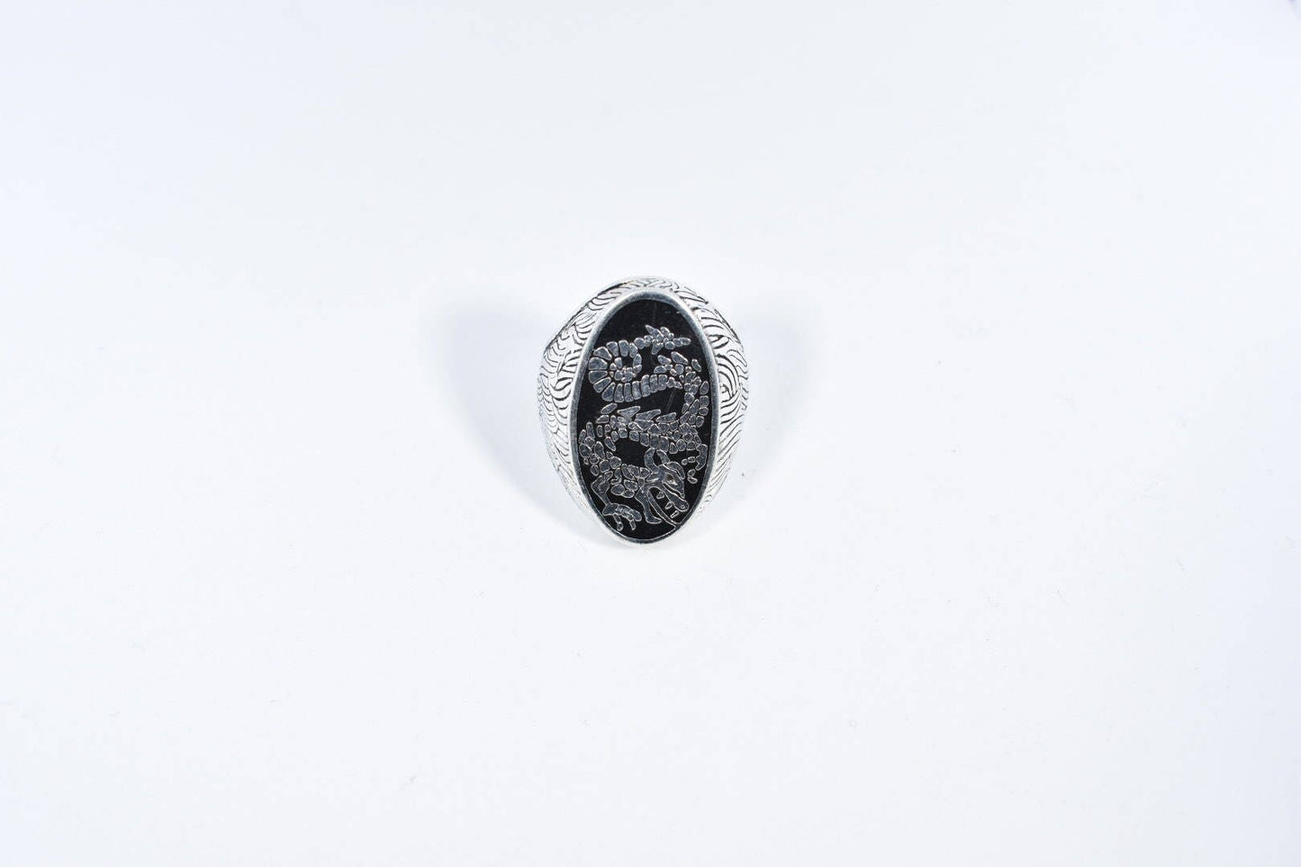Vintage Dragon Silver and Black Inlay Mens Ring
