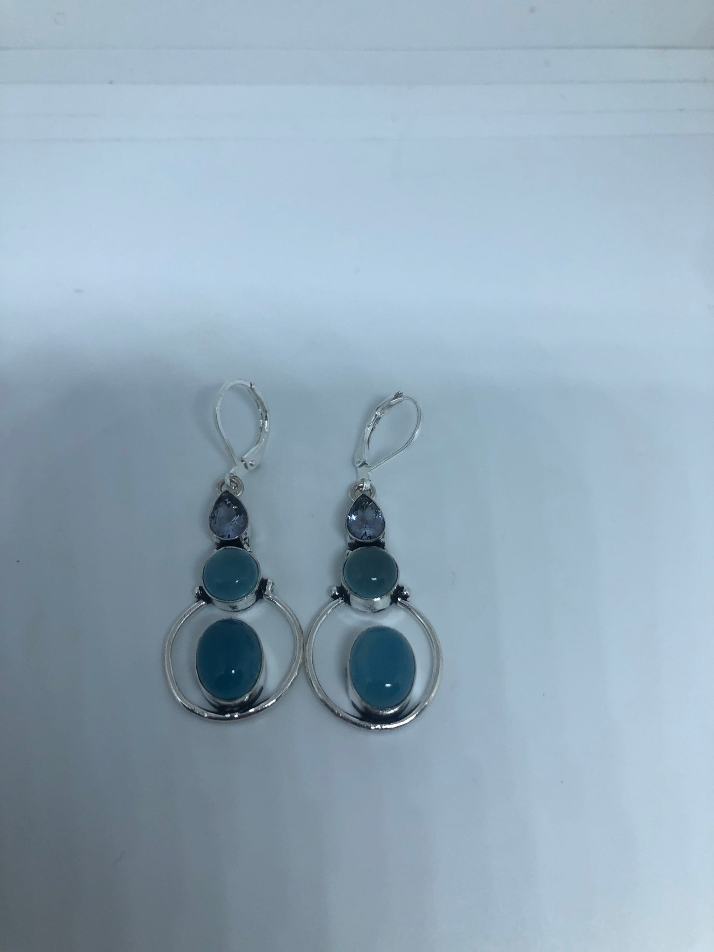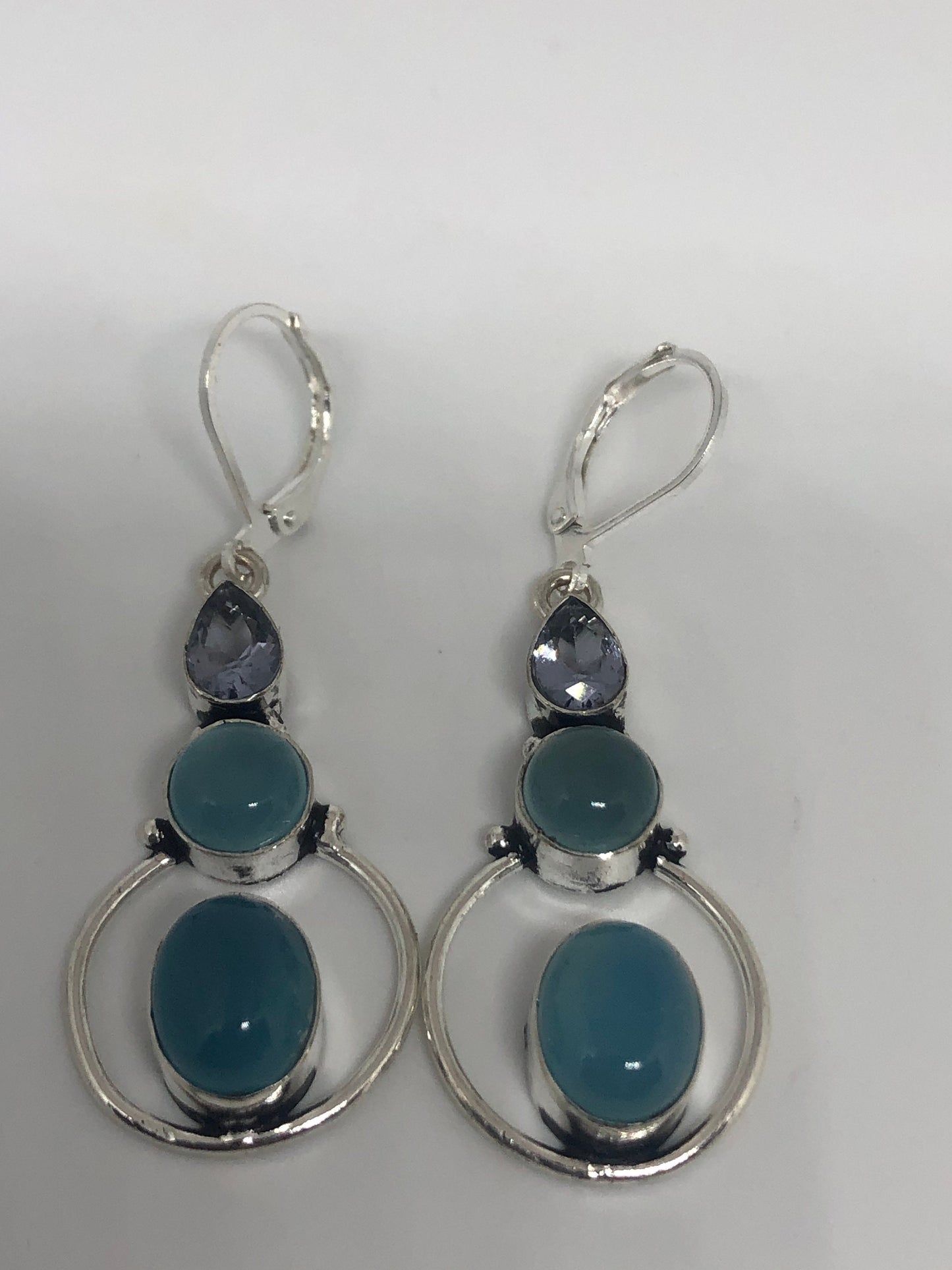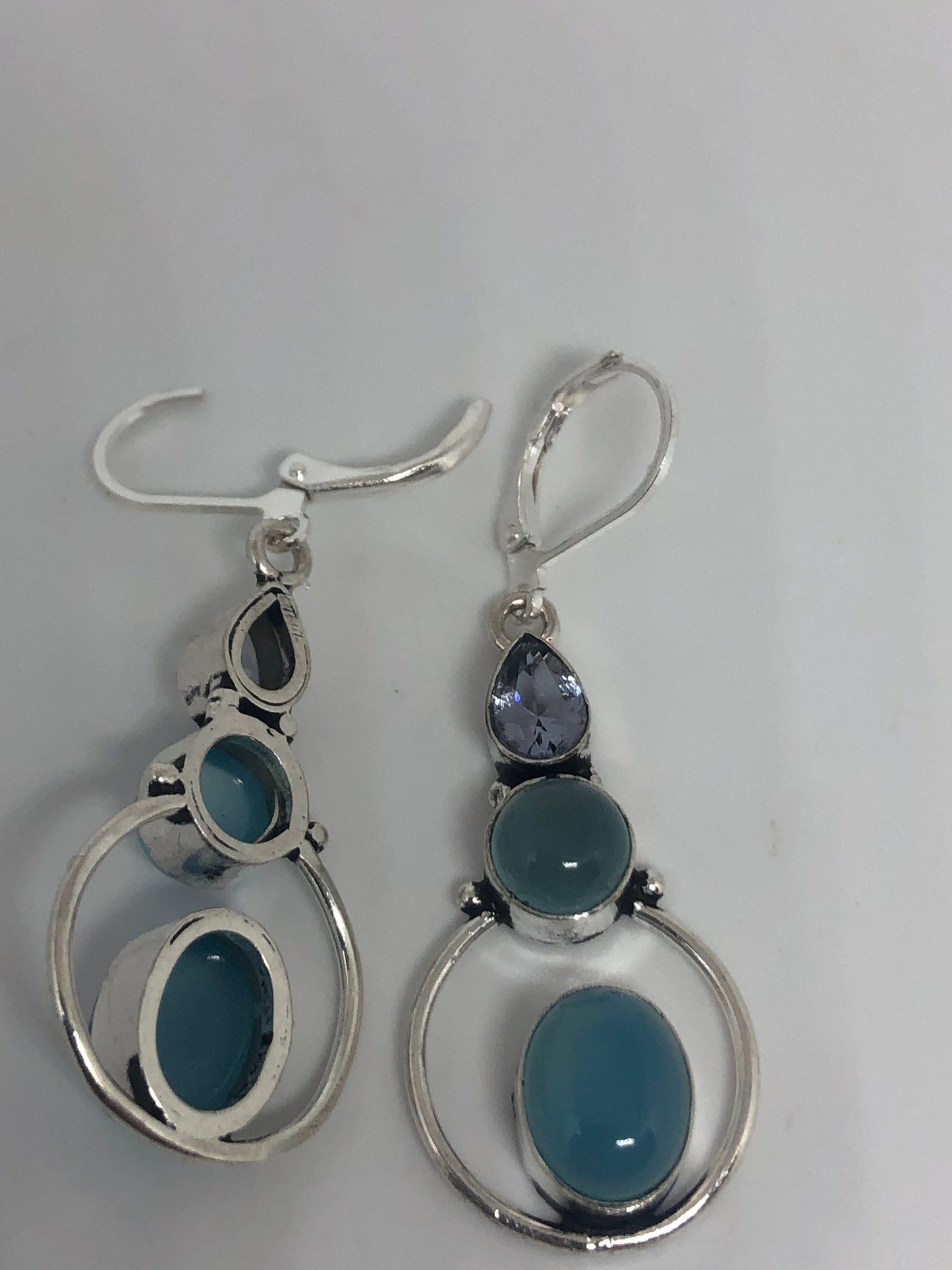 Vintage Genuine Blue Chalcedony Gemstone Filigree Sterling Silver Lever Back Chandelier Earrings