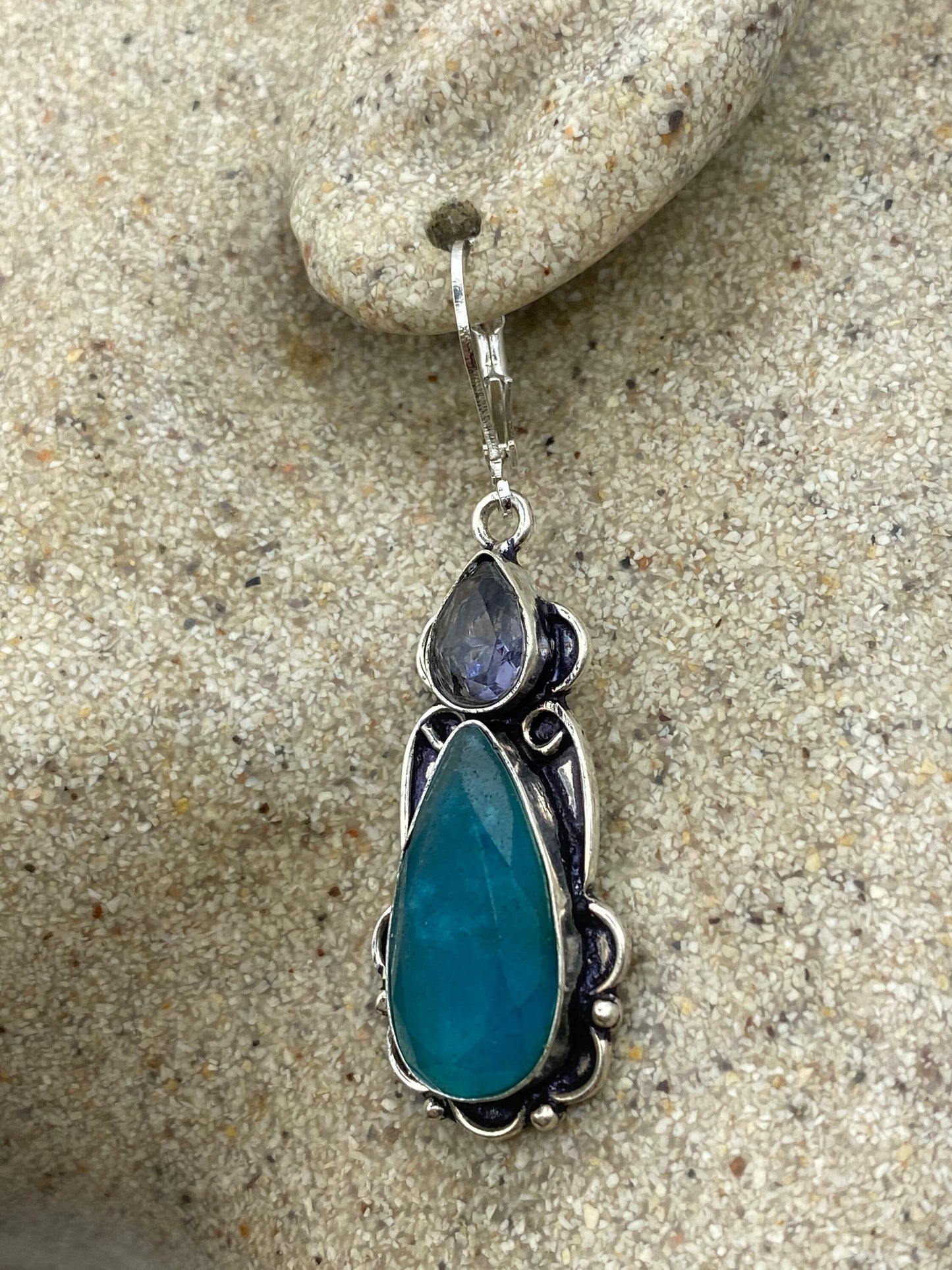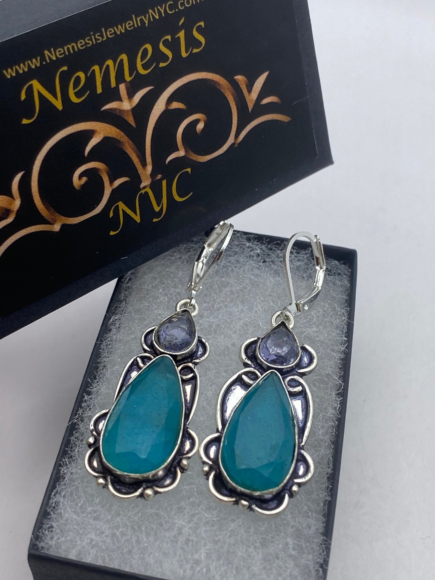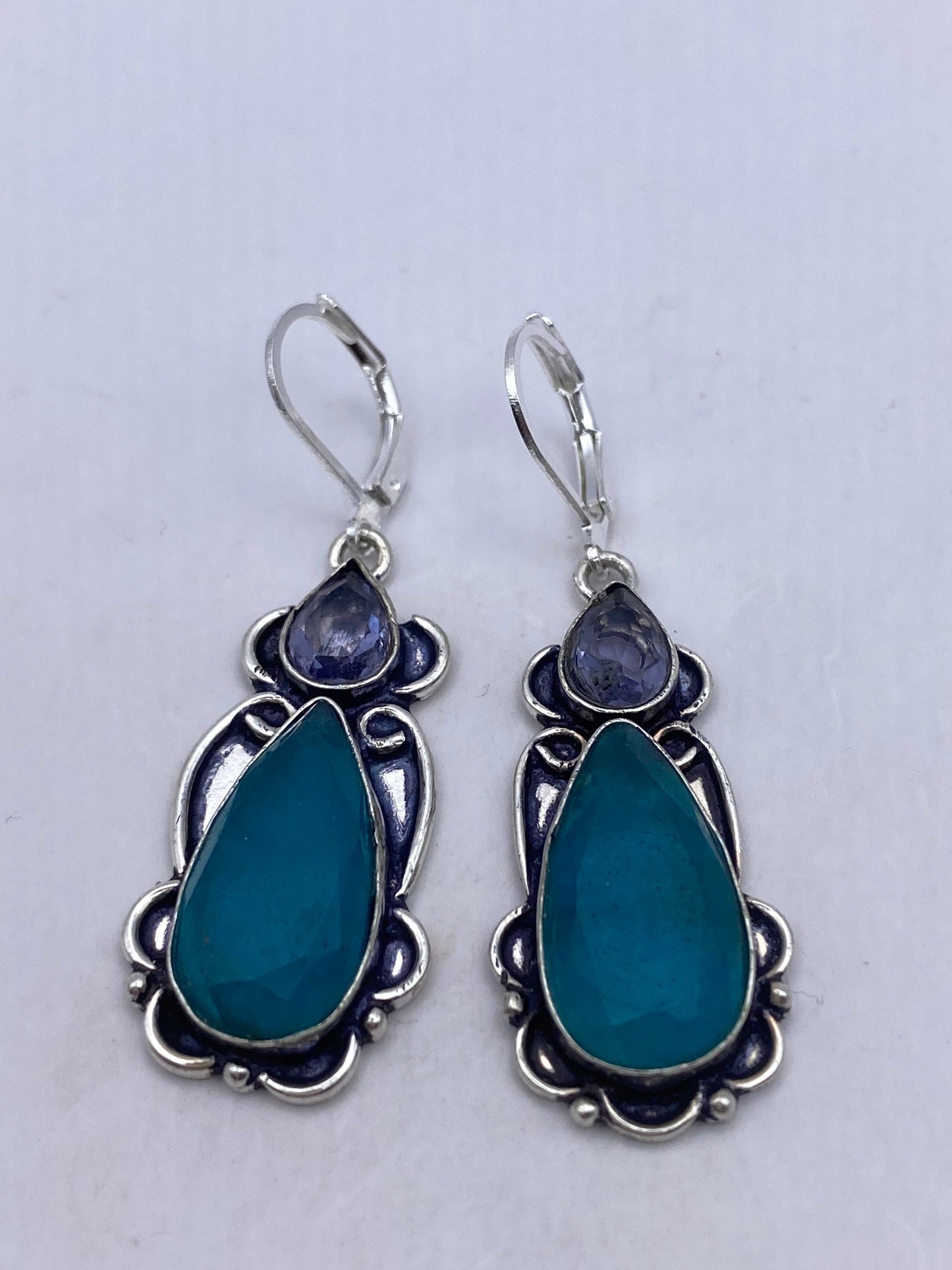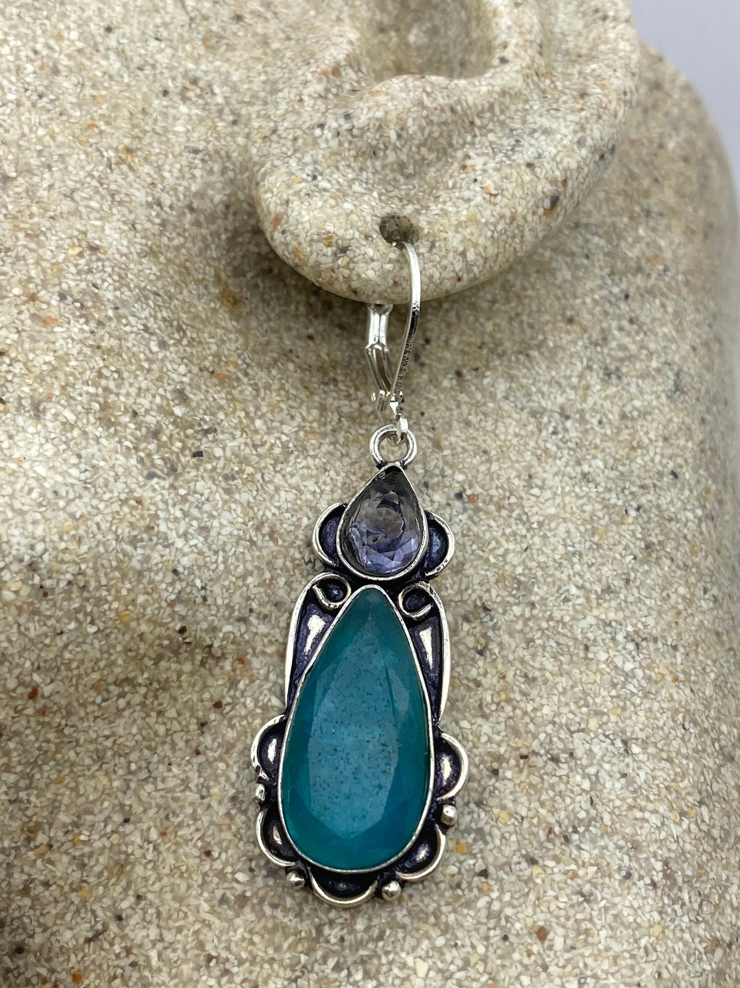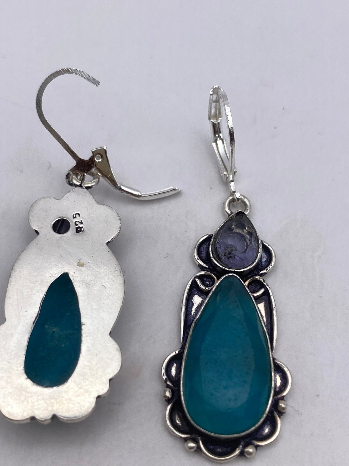Vintage Genuine Blue Chalcedony Gemstone Filigree Sterling Silver Lever Back Chandelier Earrings