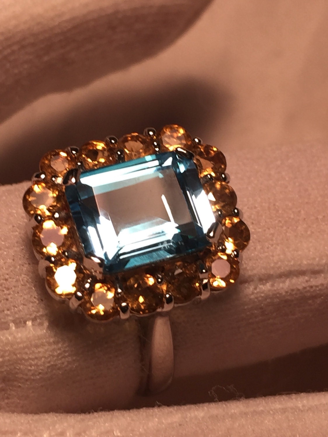 Huge great color blue topaz stone surrounding nice filigree work set with golden citrine