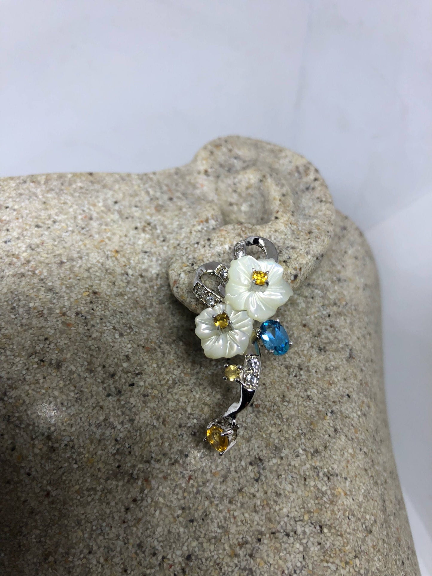 Vintage Genuine Gemstone Mother of Pearl Flower 925 Sterling Silver Dangle Earrings