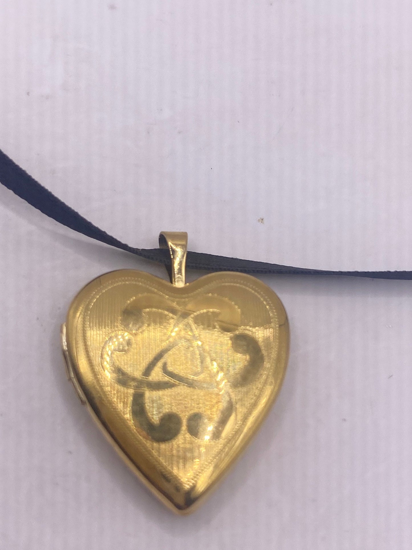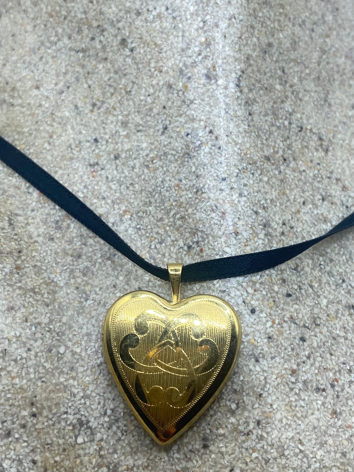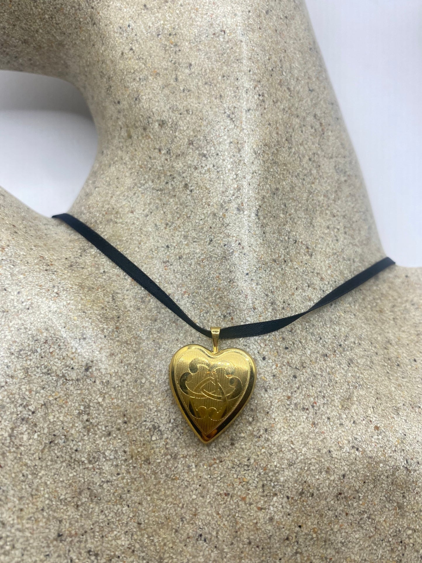 Vintage Gold Locket | Tiny Heart 9k Gold Filled Pendant Photo Memory Charm Engraved Etched Design | Choker Necklace