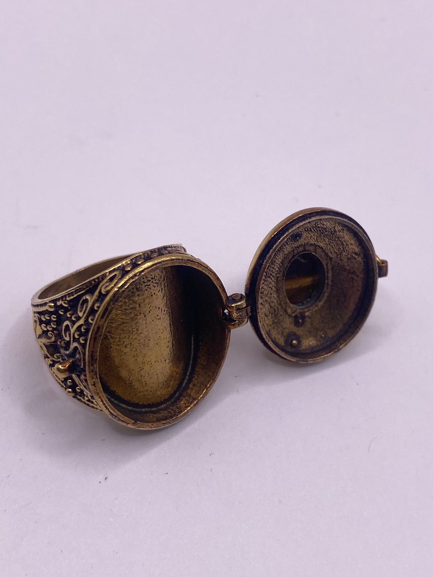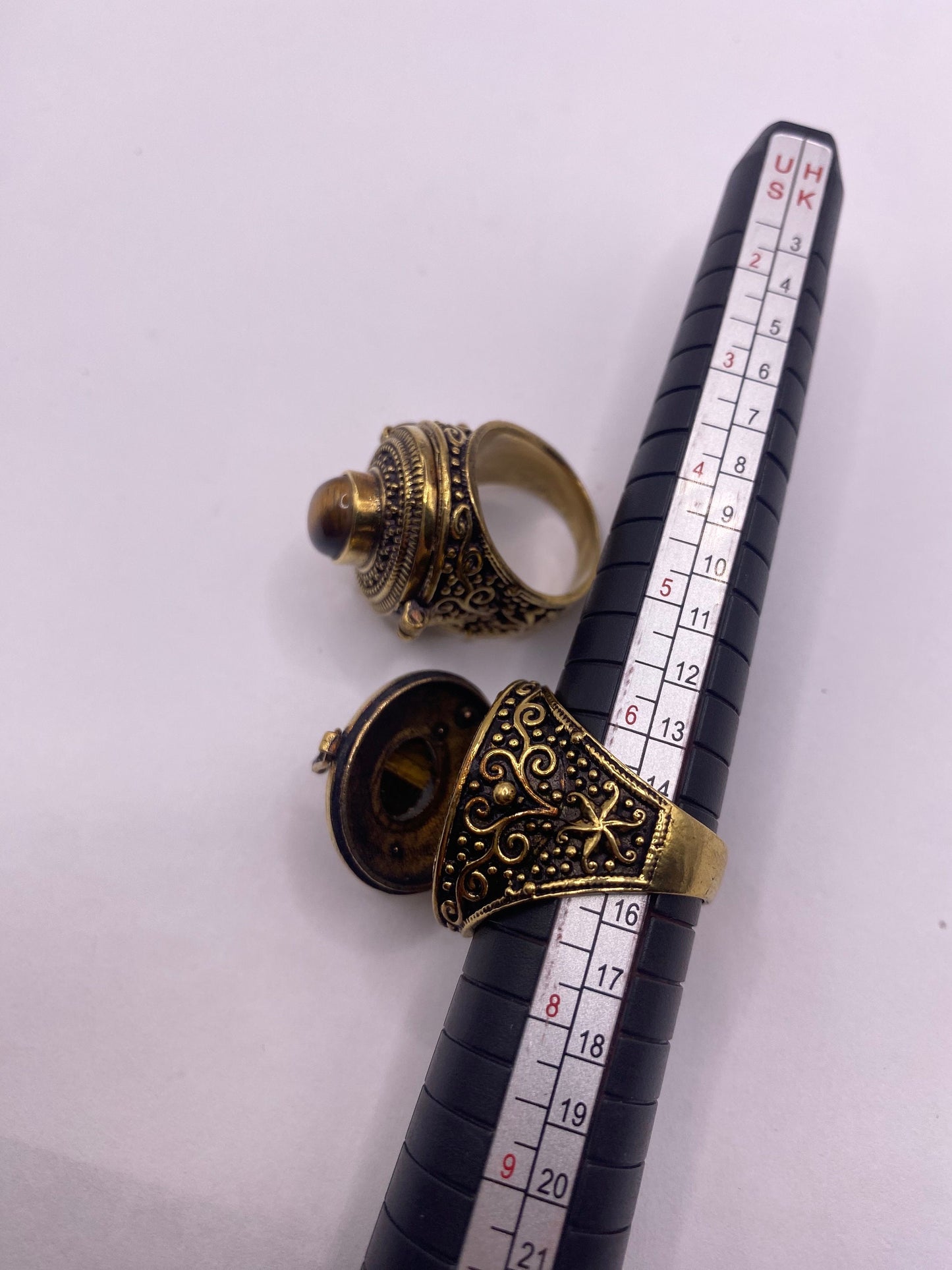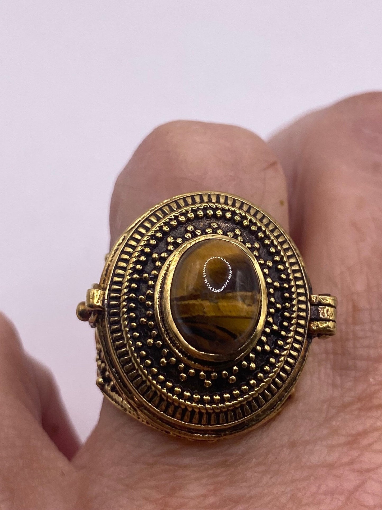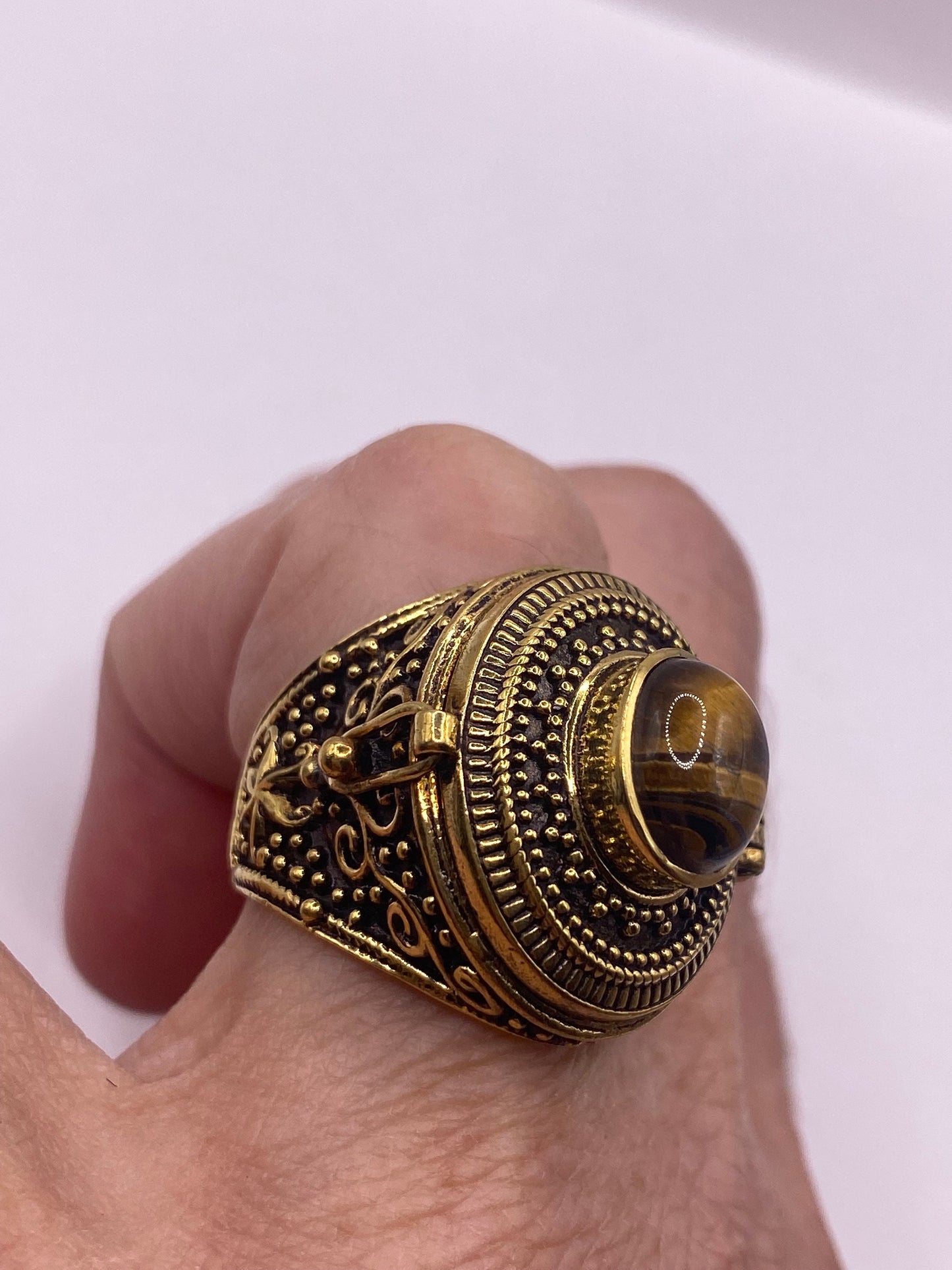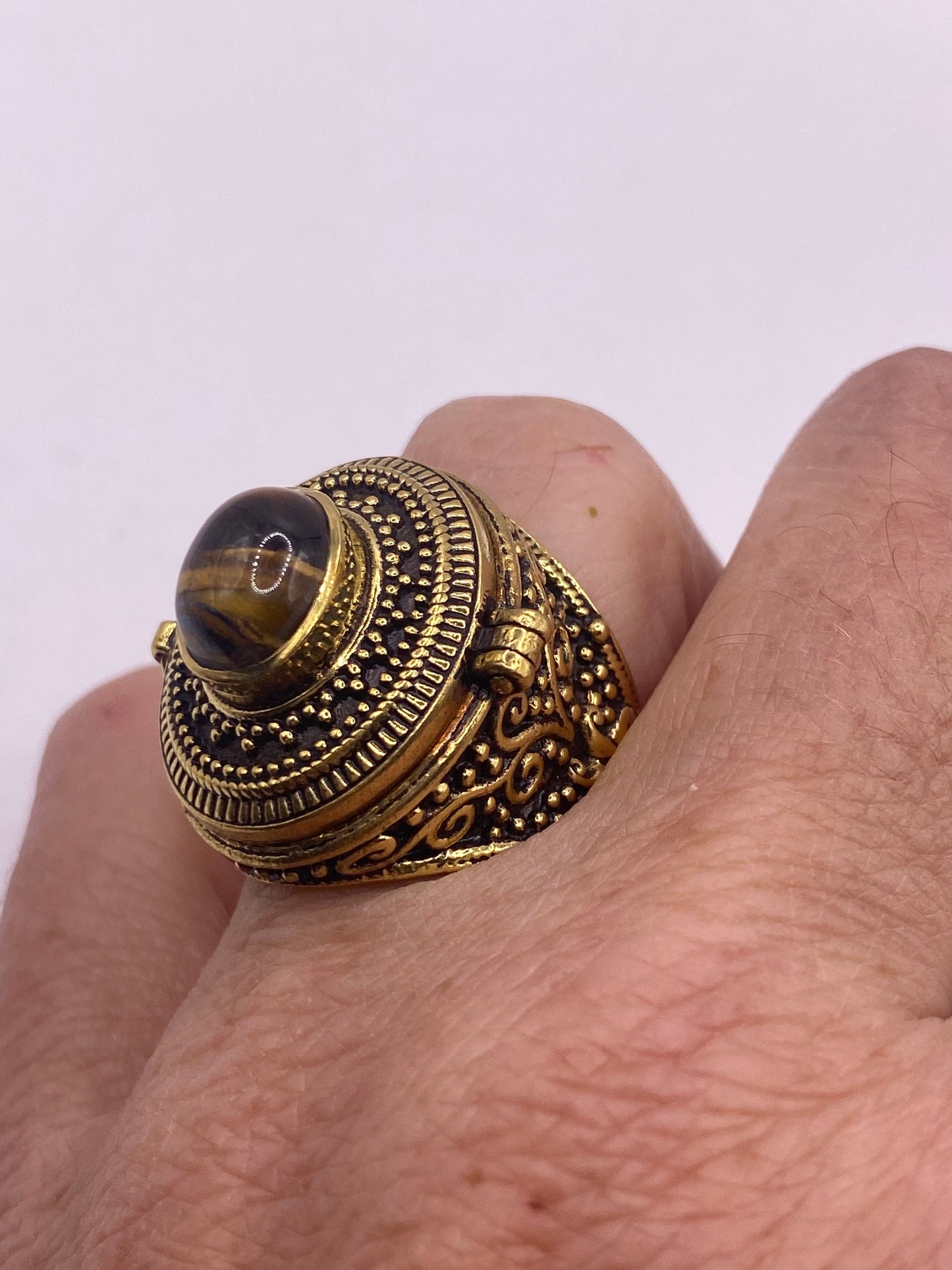 Vintage Gold Tigers Eye Brass Poison Pillbox Ring
