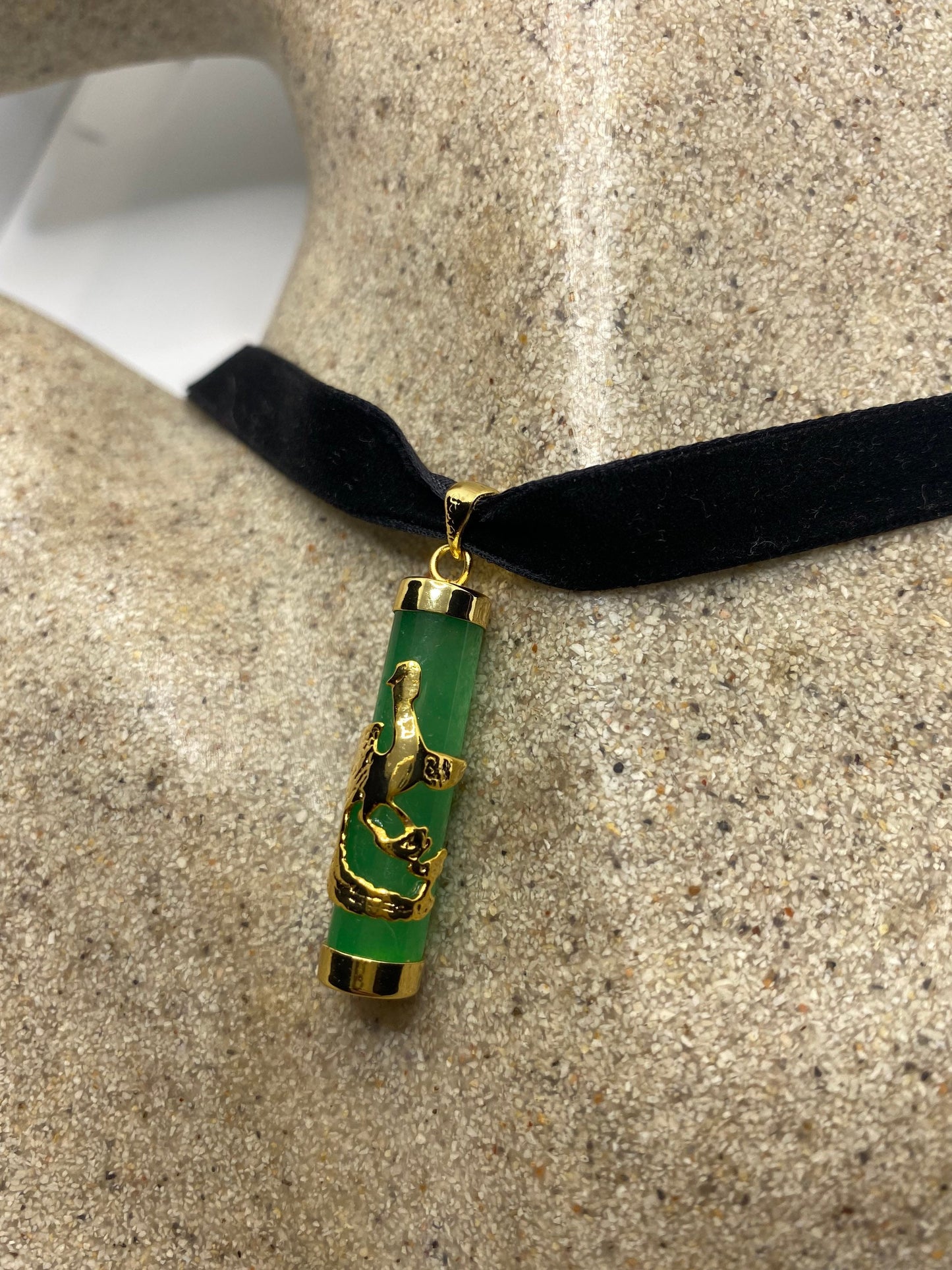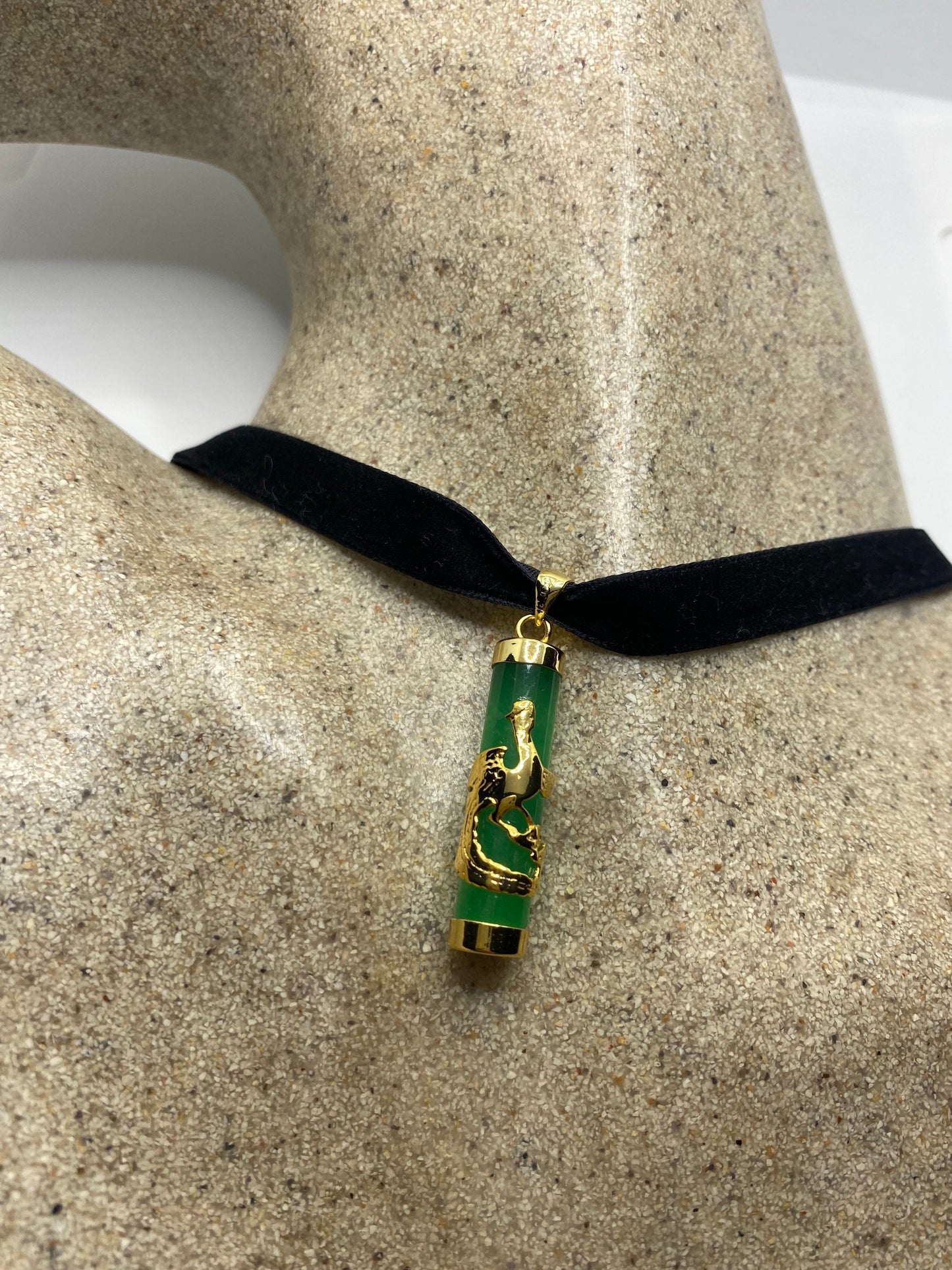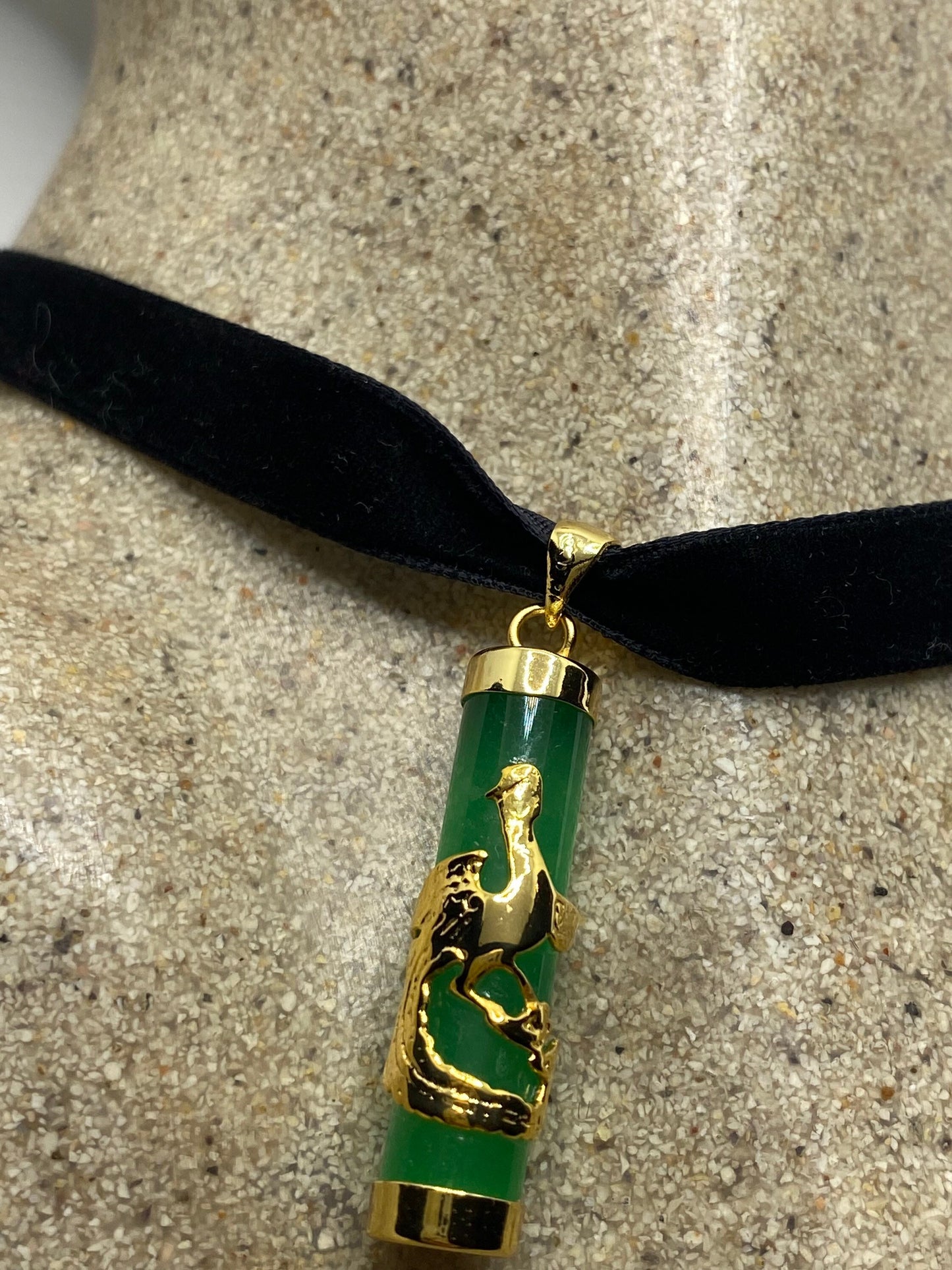 Vintage Green Jade Choker Gold Finish Dragon Necklace Pendant