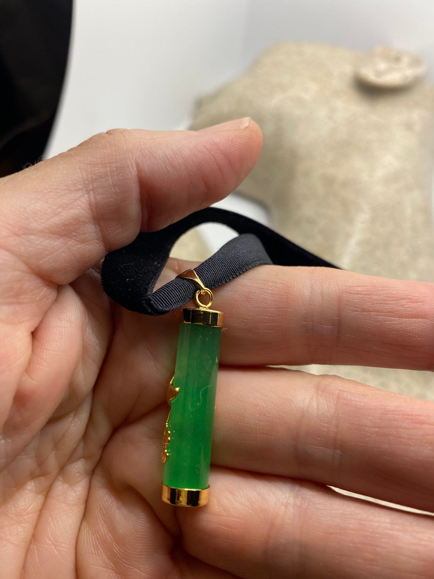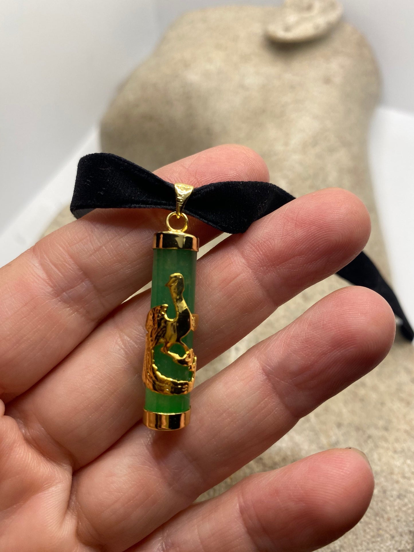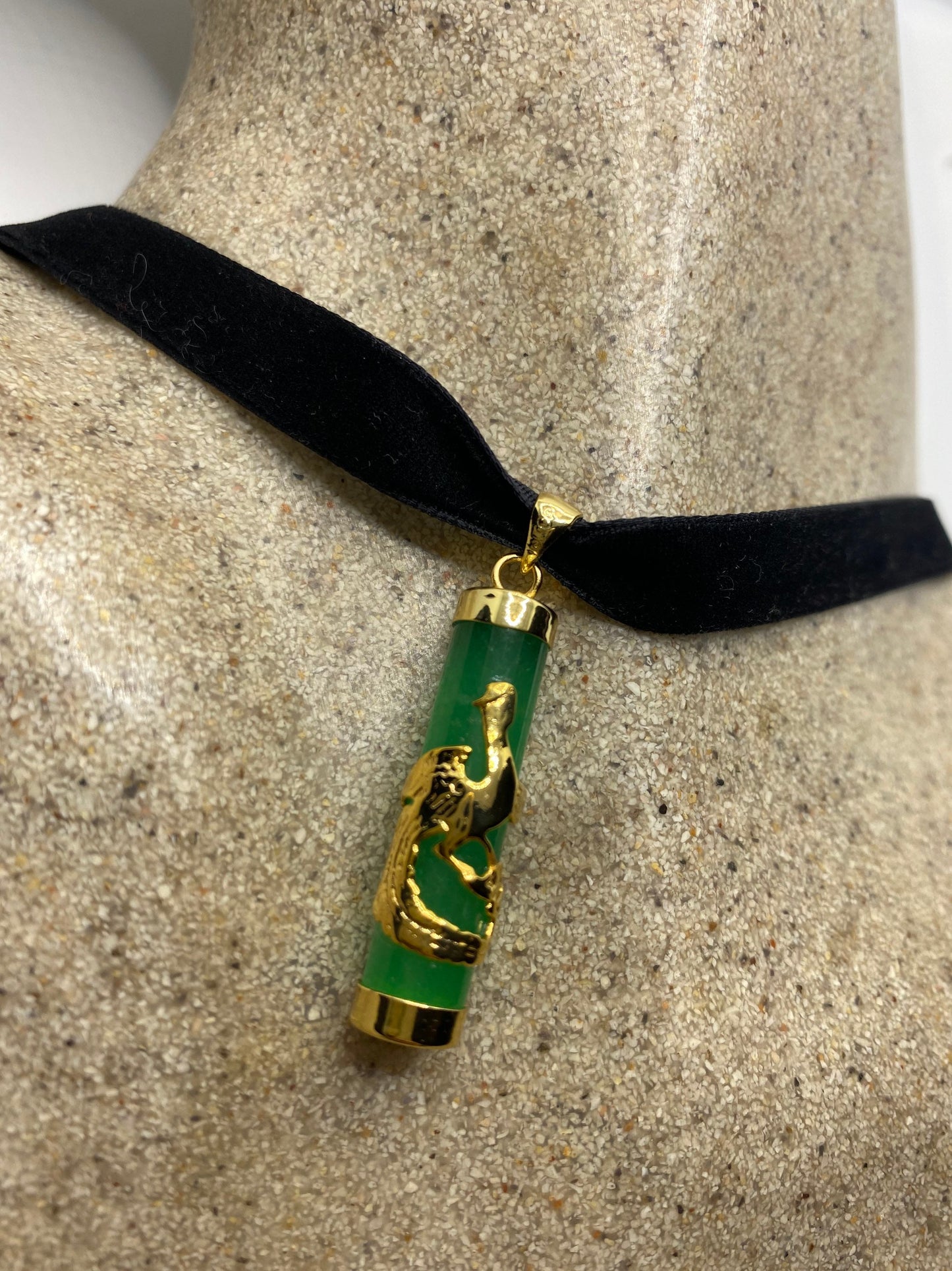 Vintage Green Jade Choker Gold Finish Dragon Necklace Pendant