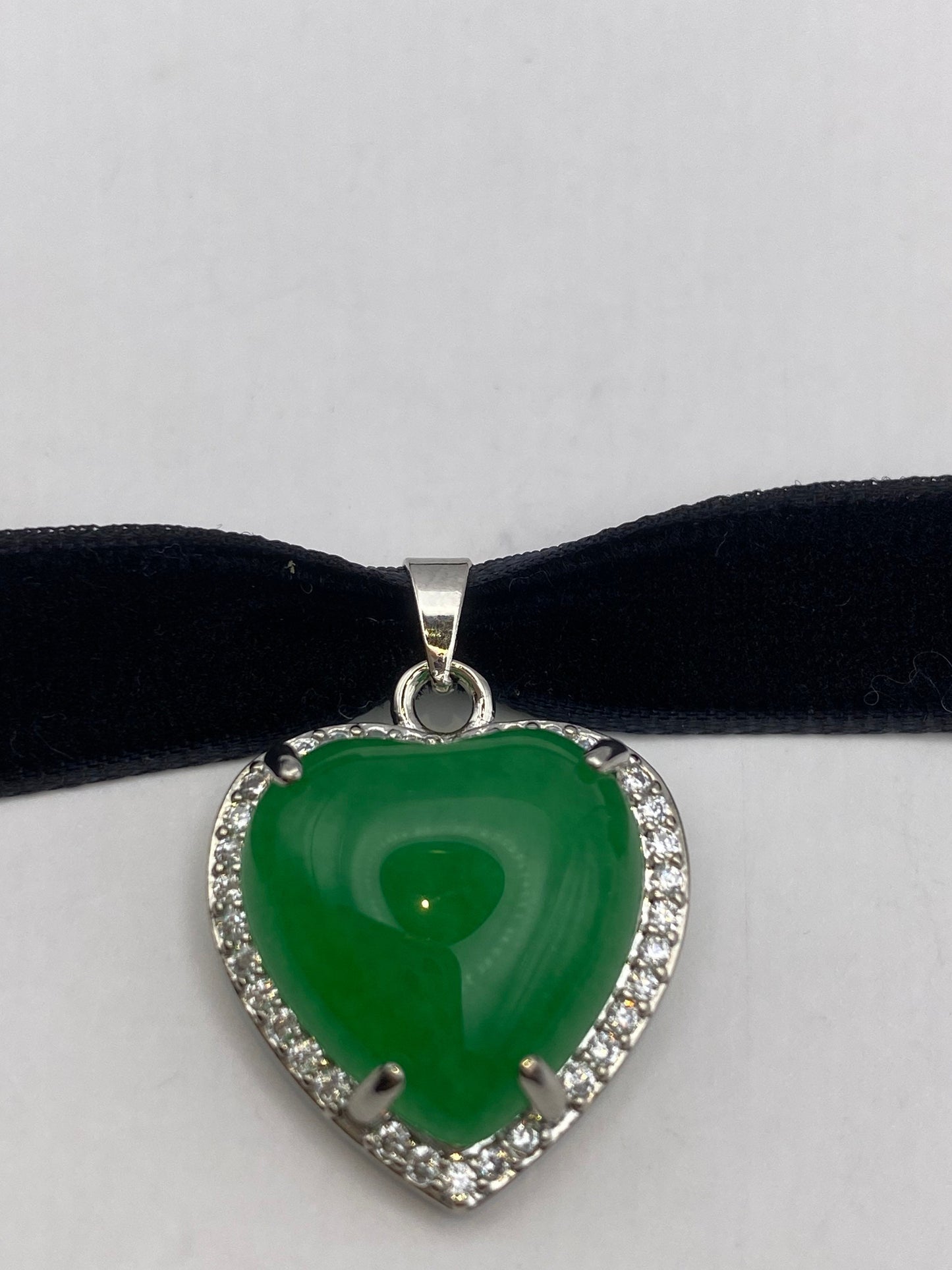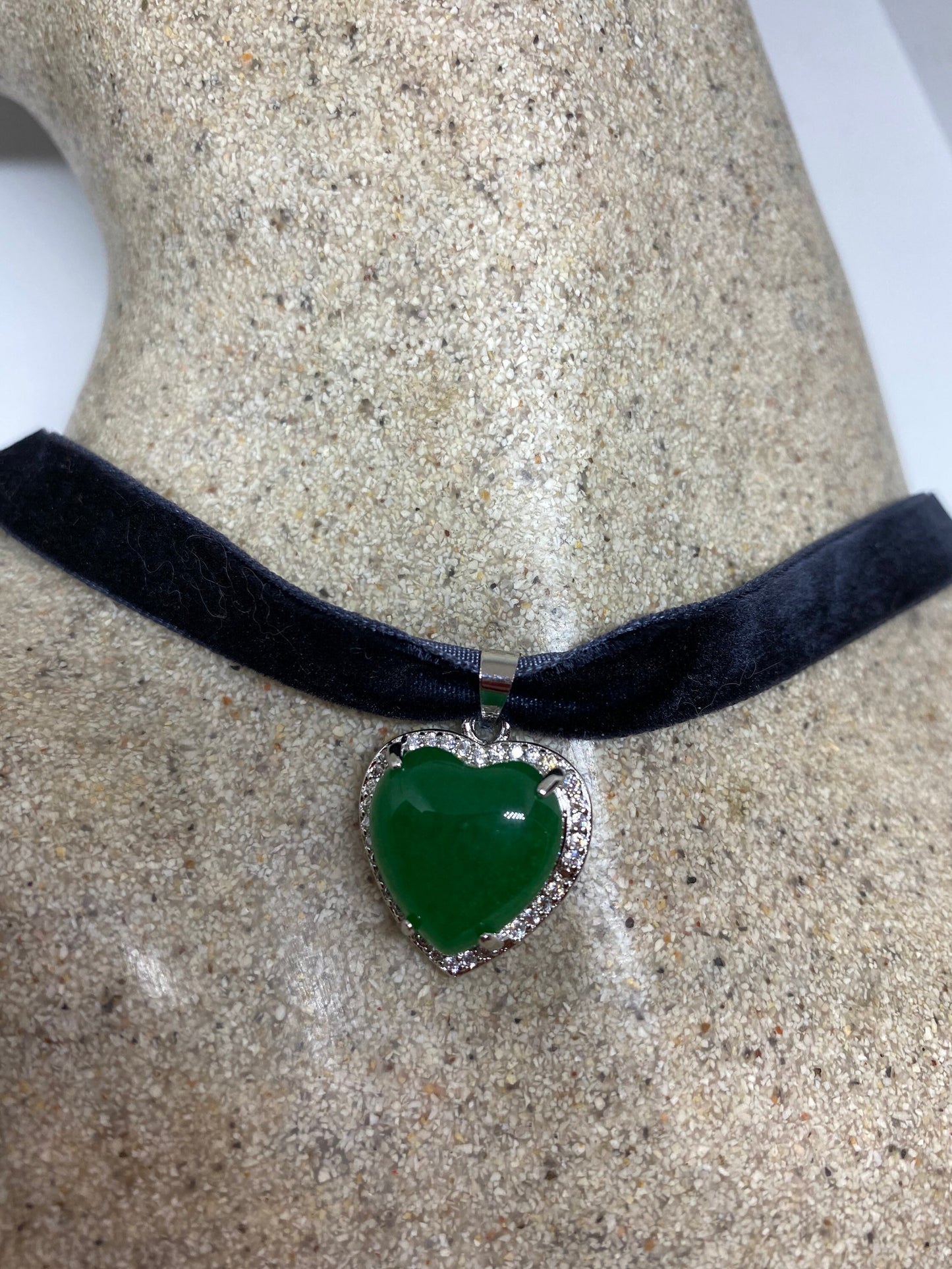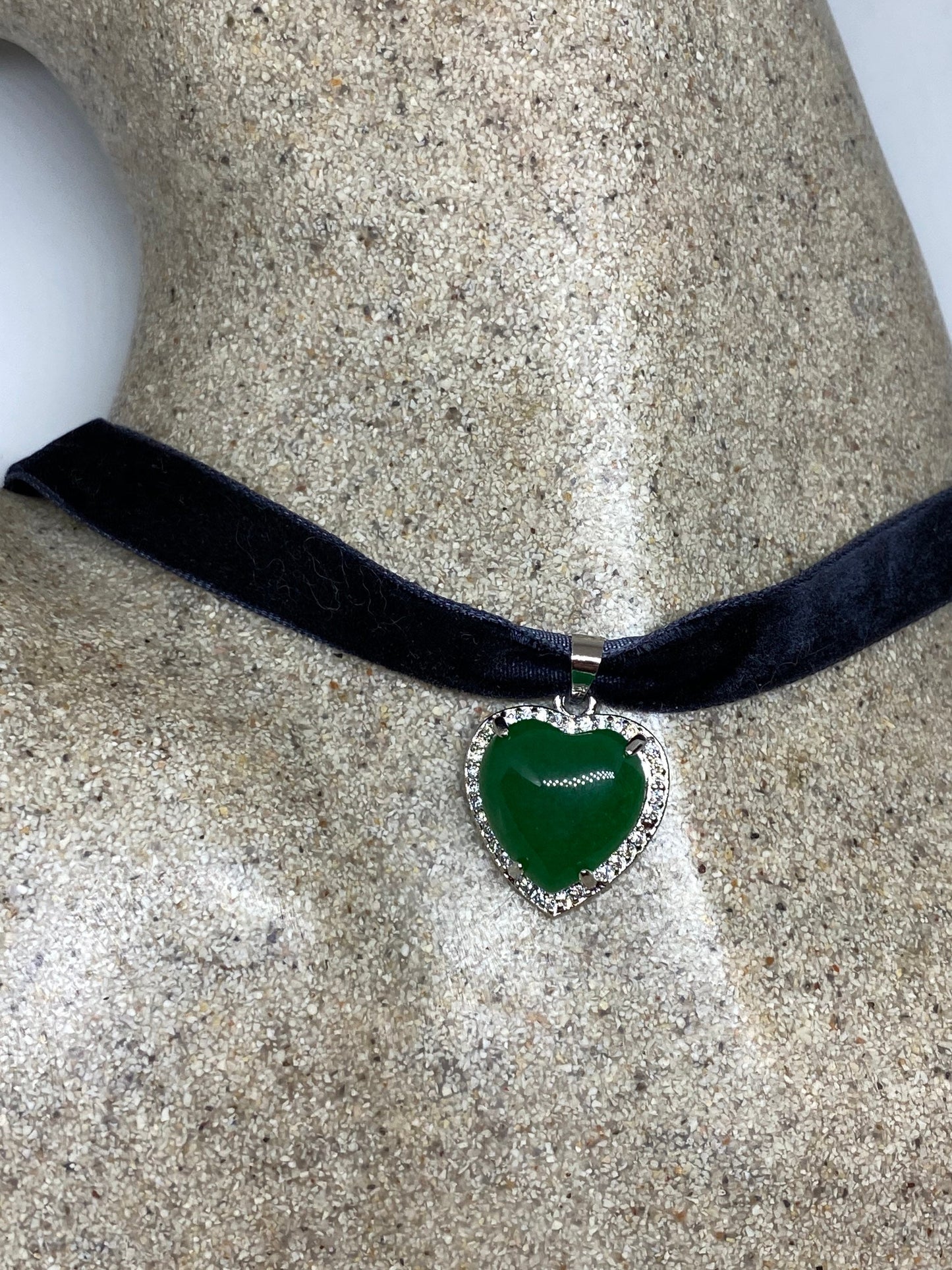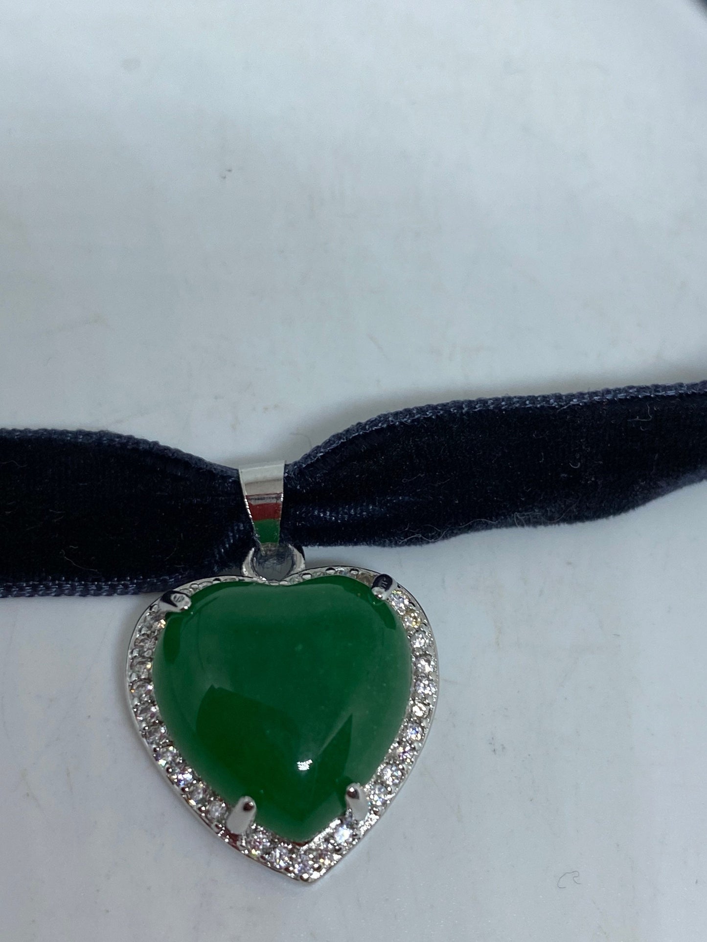 Vintage Green Jade Heart Choker Silver Finish Necklace Pendant