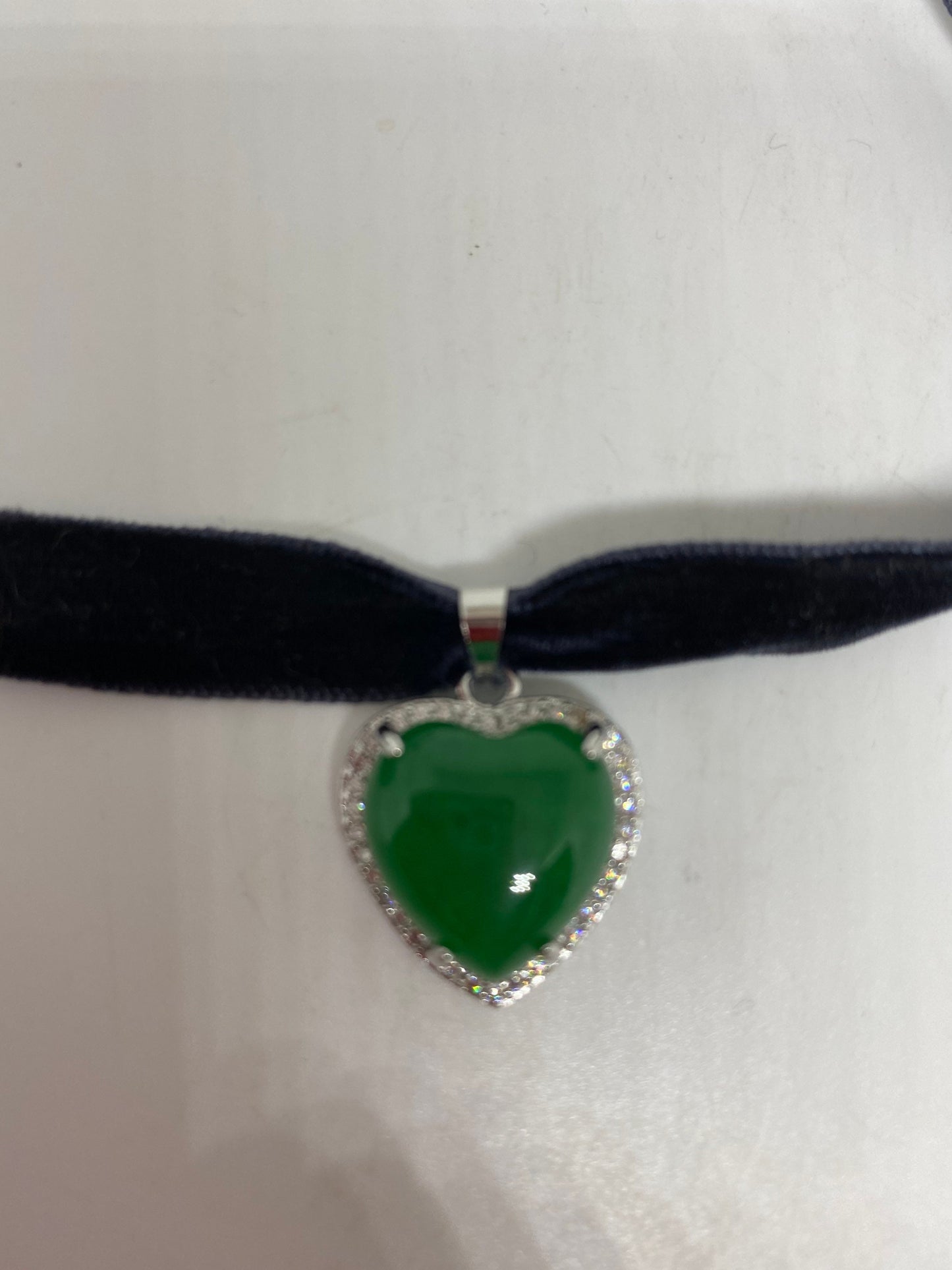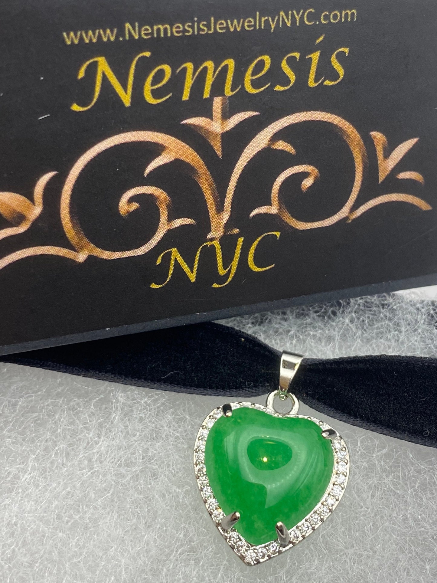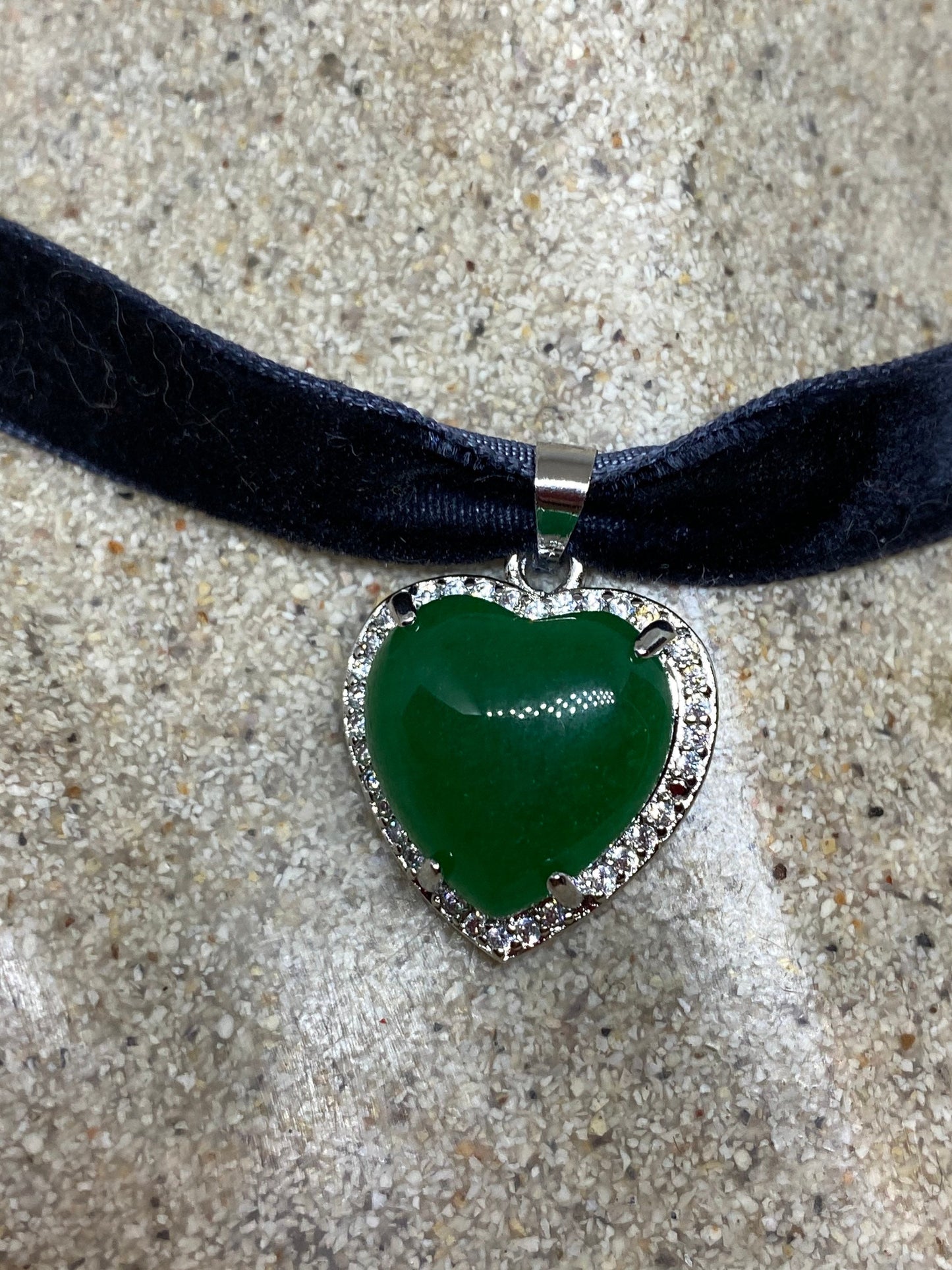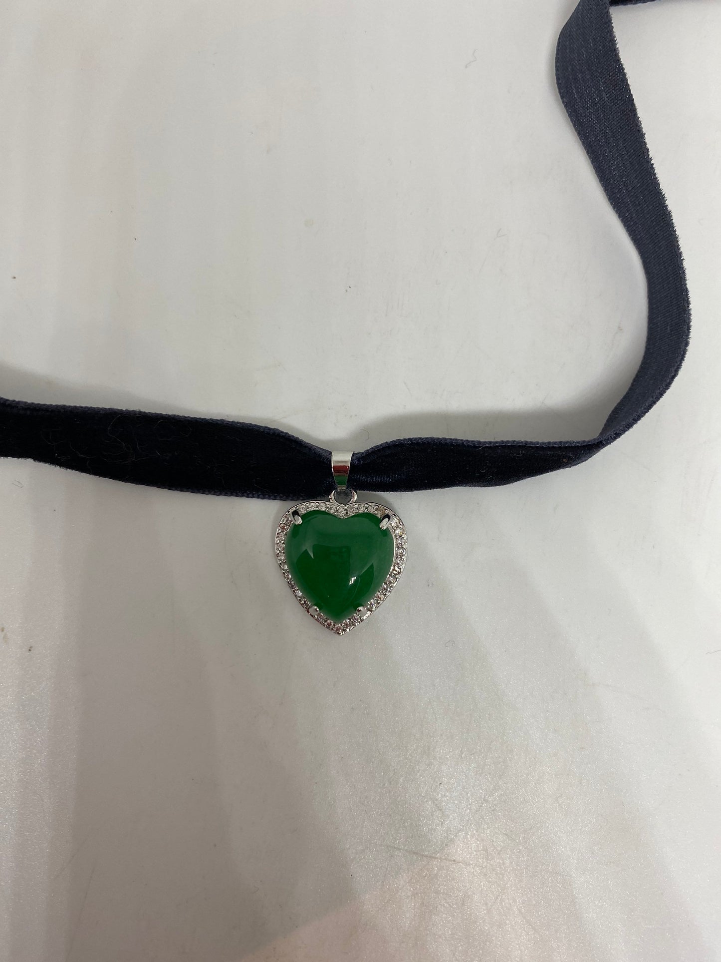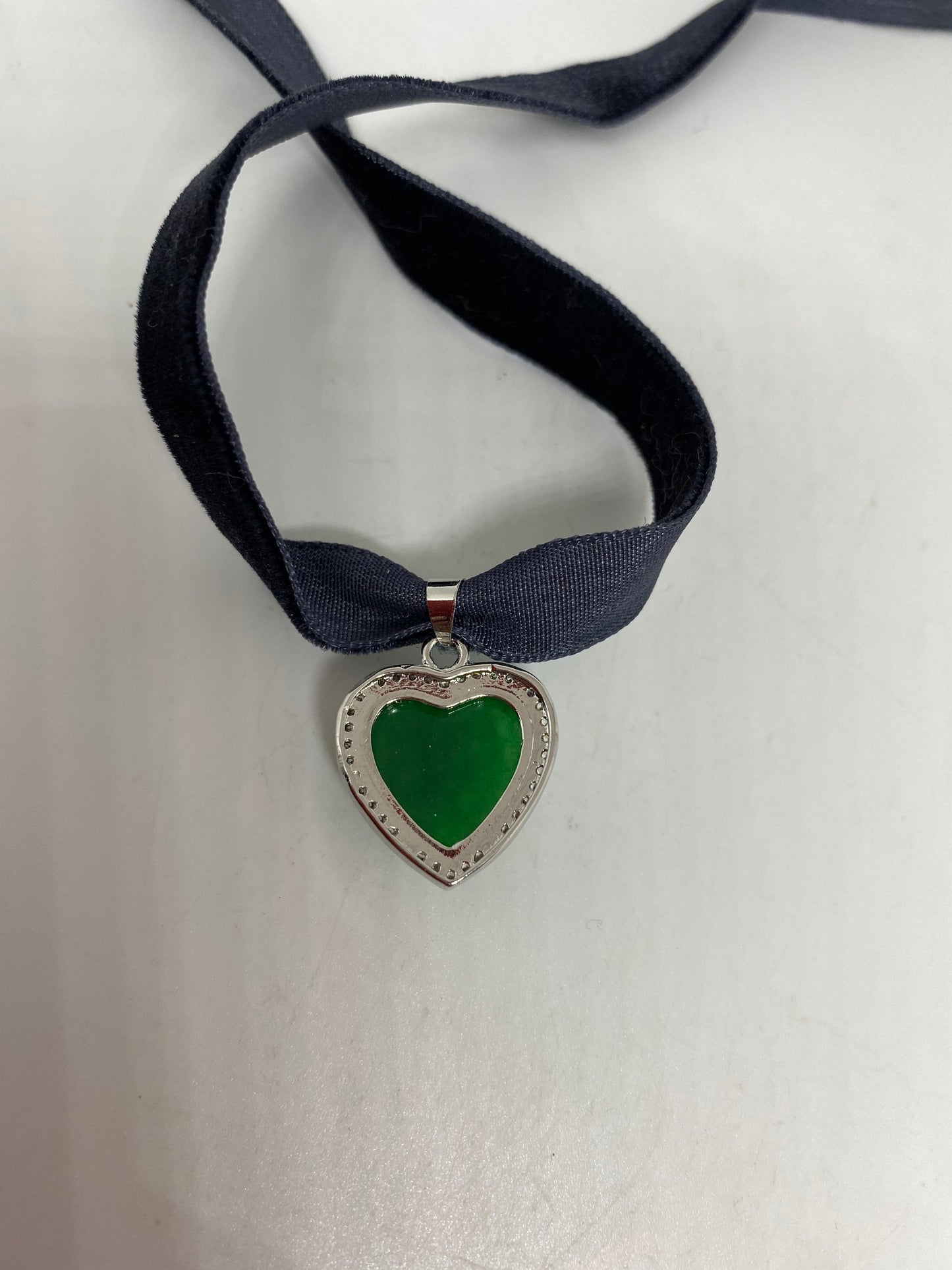 Vintage Green Jade Heart Choker Silver Finish Necklace Pendant