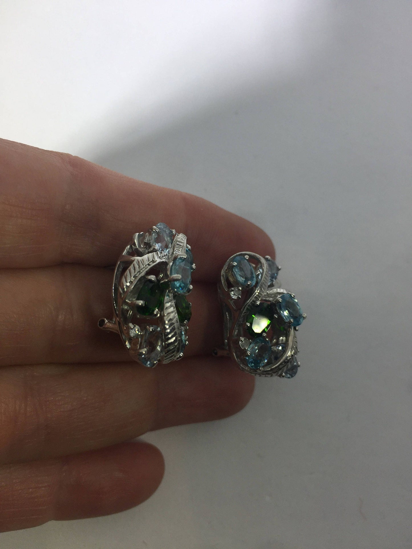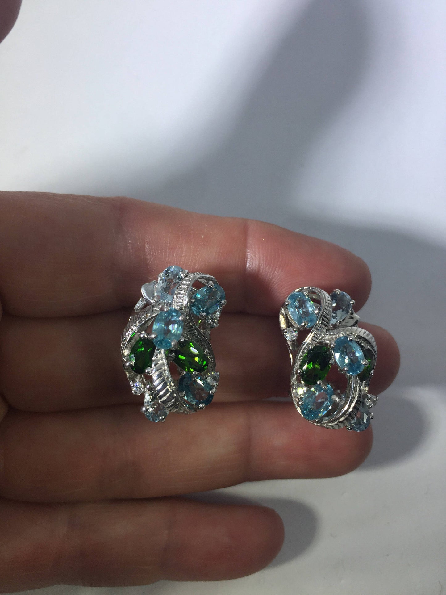 Vintage Handmade 925 Sterling Silver Blue Topaz Chrome Diopside button Earrings