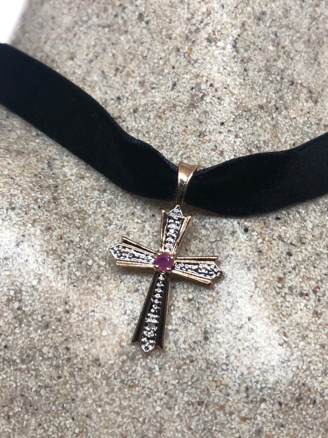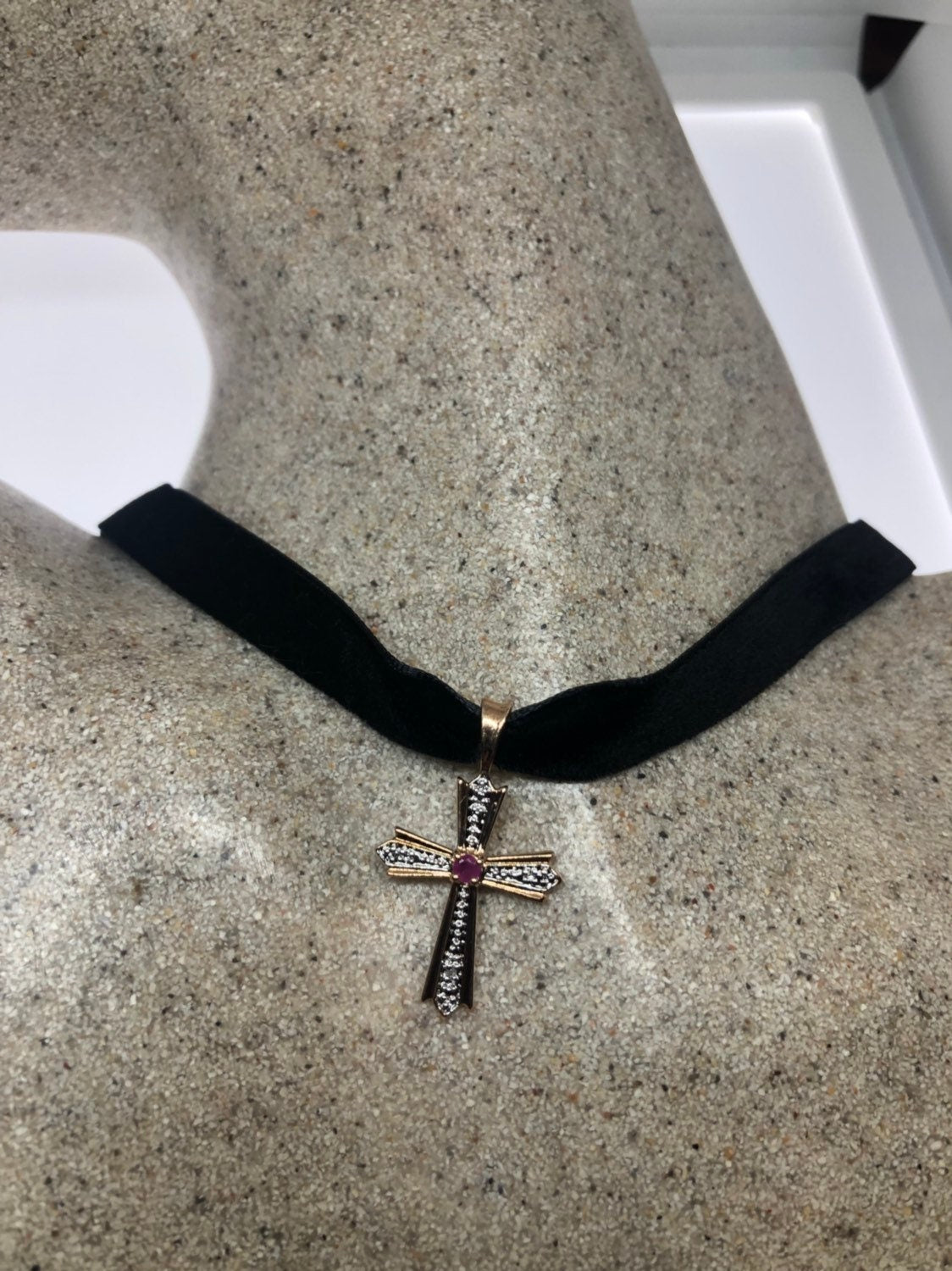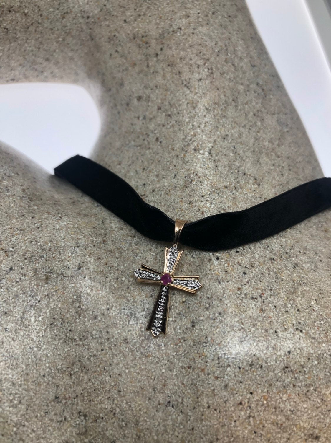 Vintage Handmade 925 Sterling Silver Ruby White Sapphire Cross Pendant Choker