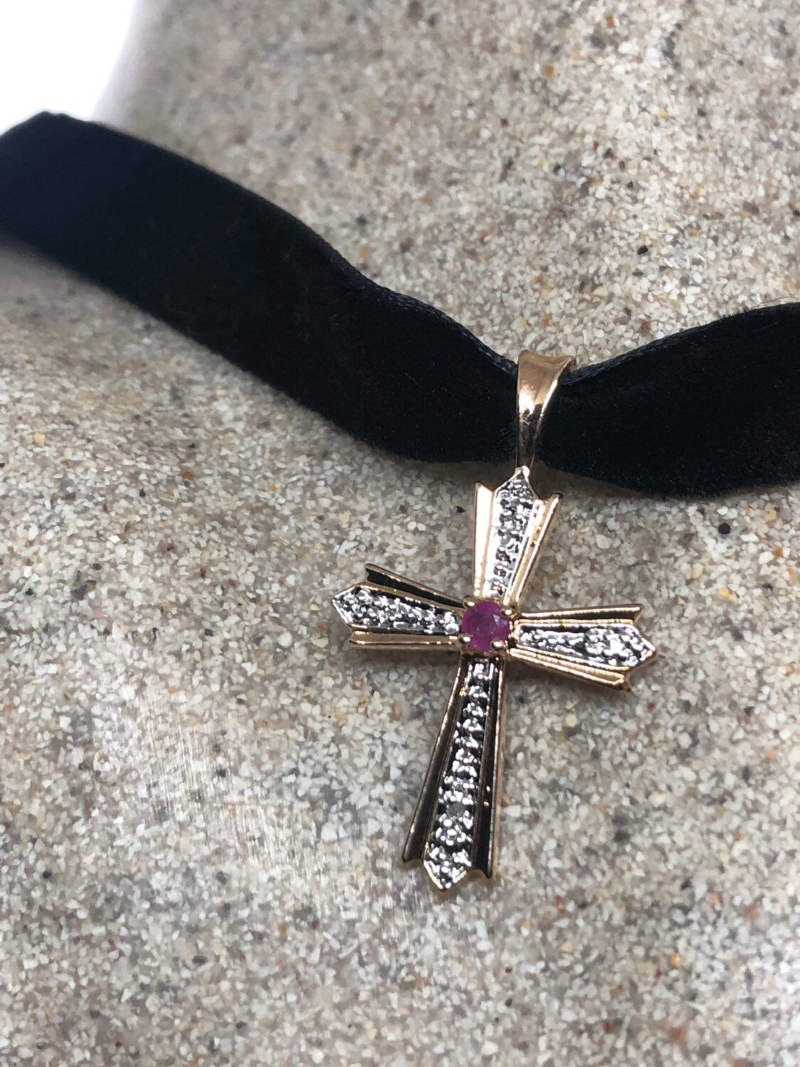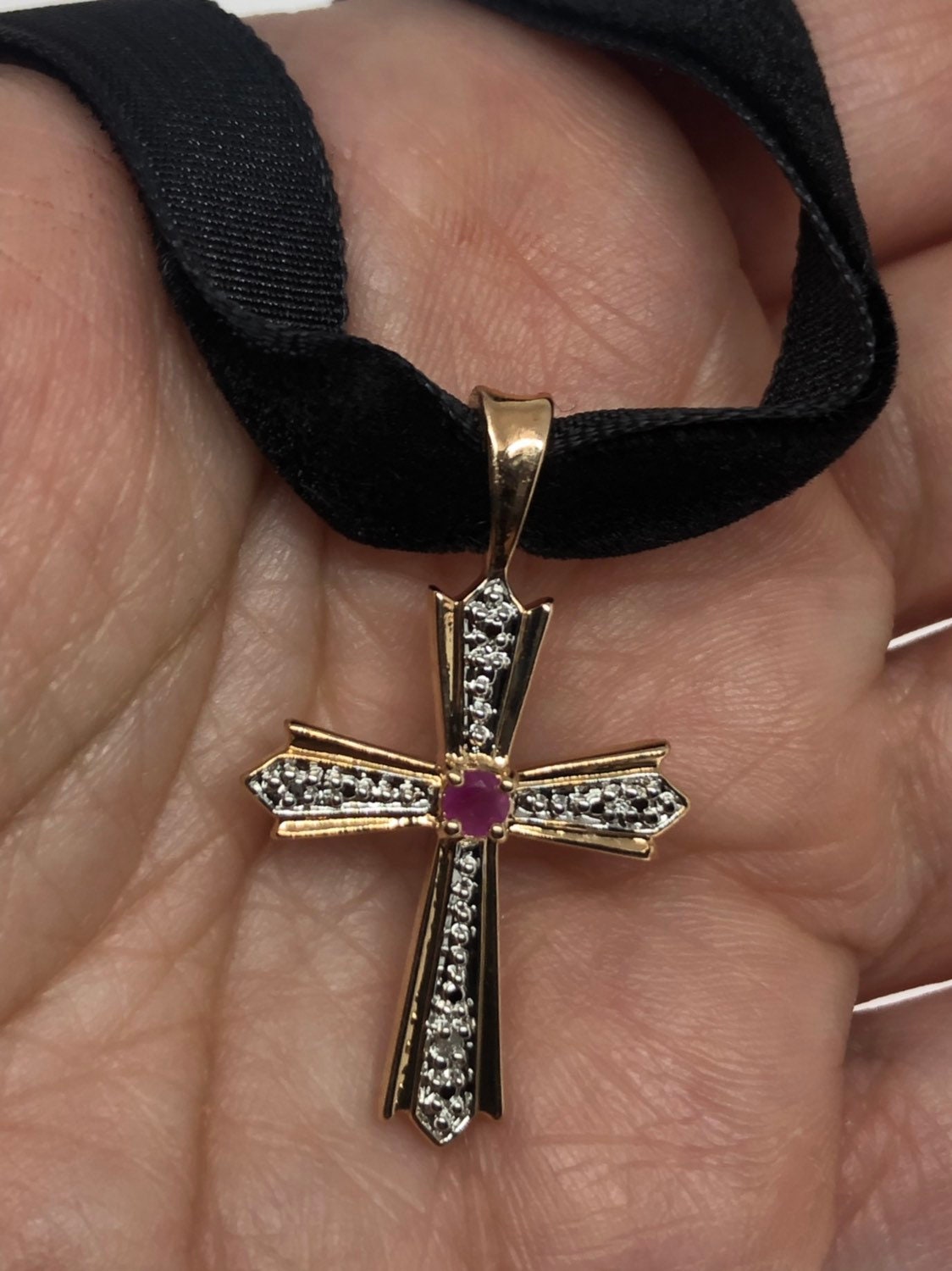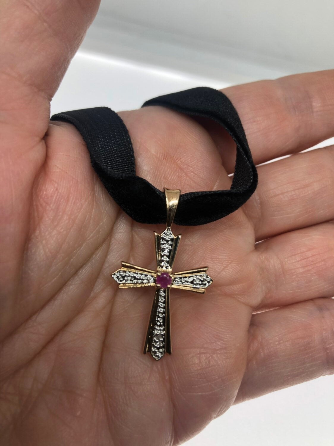 Vintage Handmade 925 Sterling Silver Ruby White Sapphire Cross Pendant Choker