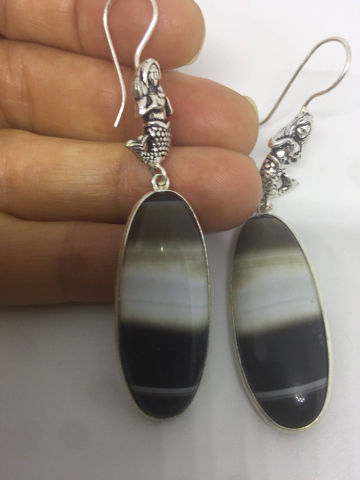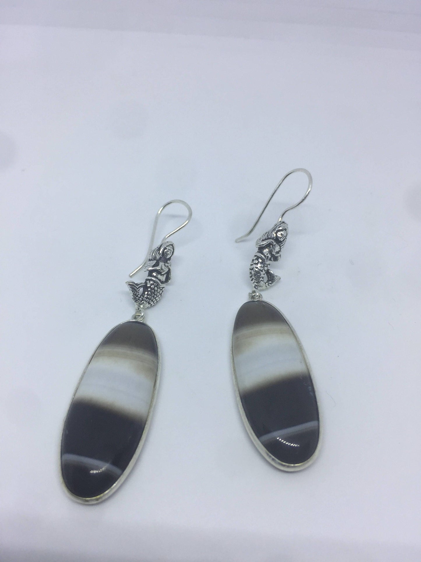Vintage Handmade Sterling Silver Black and White Agate Earrings in Mermaid Setting