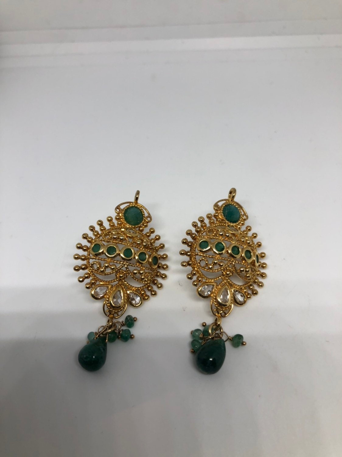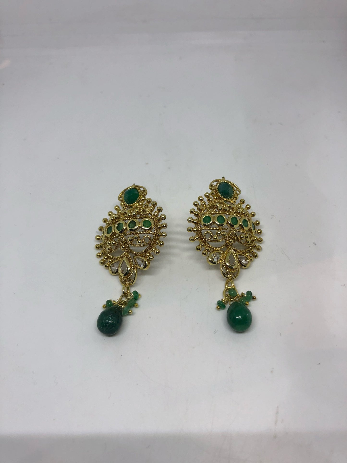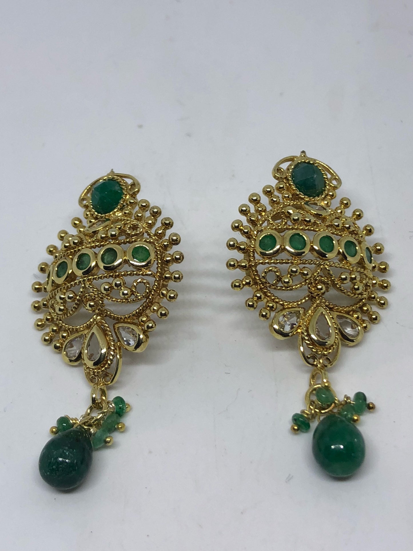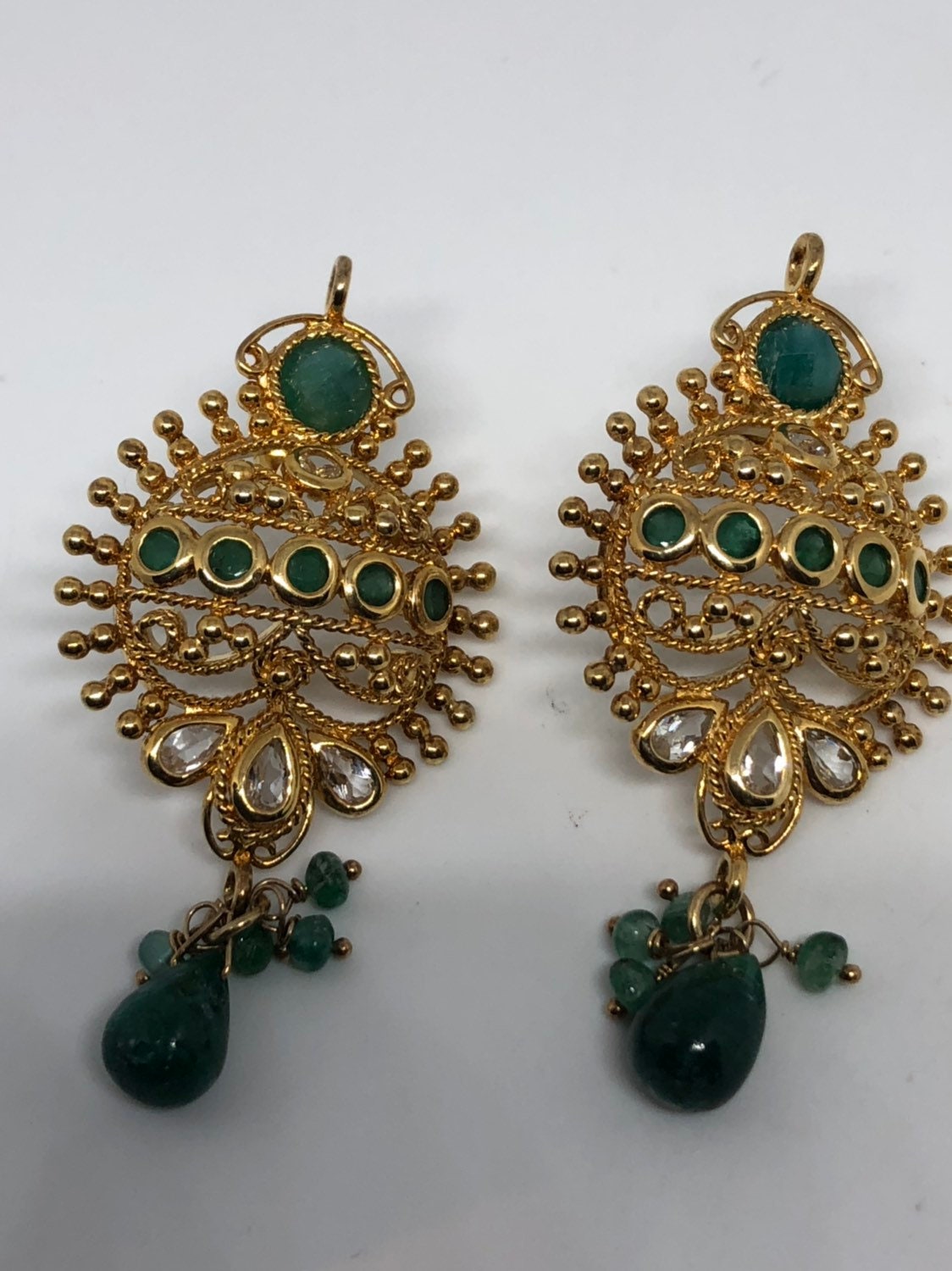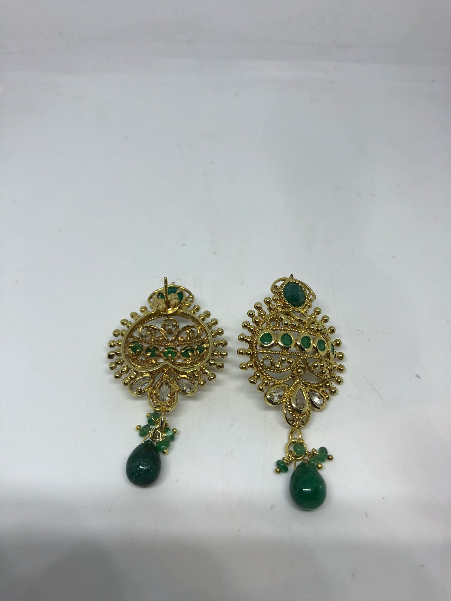 Vintage Handmade Sterling Silver Genuine Green Emerald White Sapphire Stud button Earrings