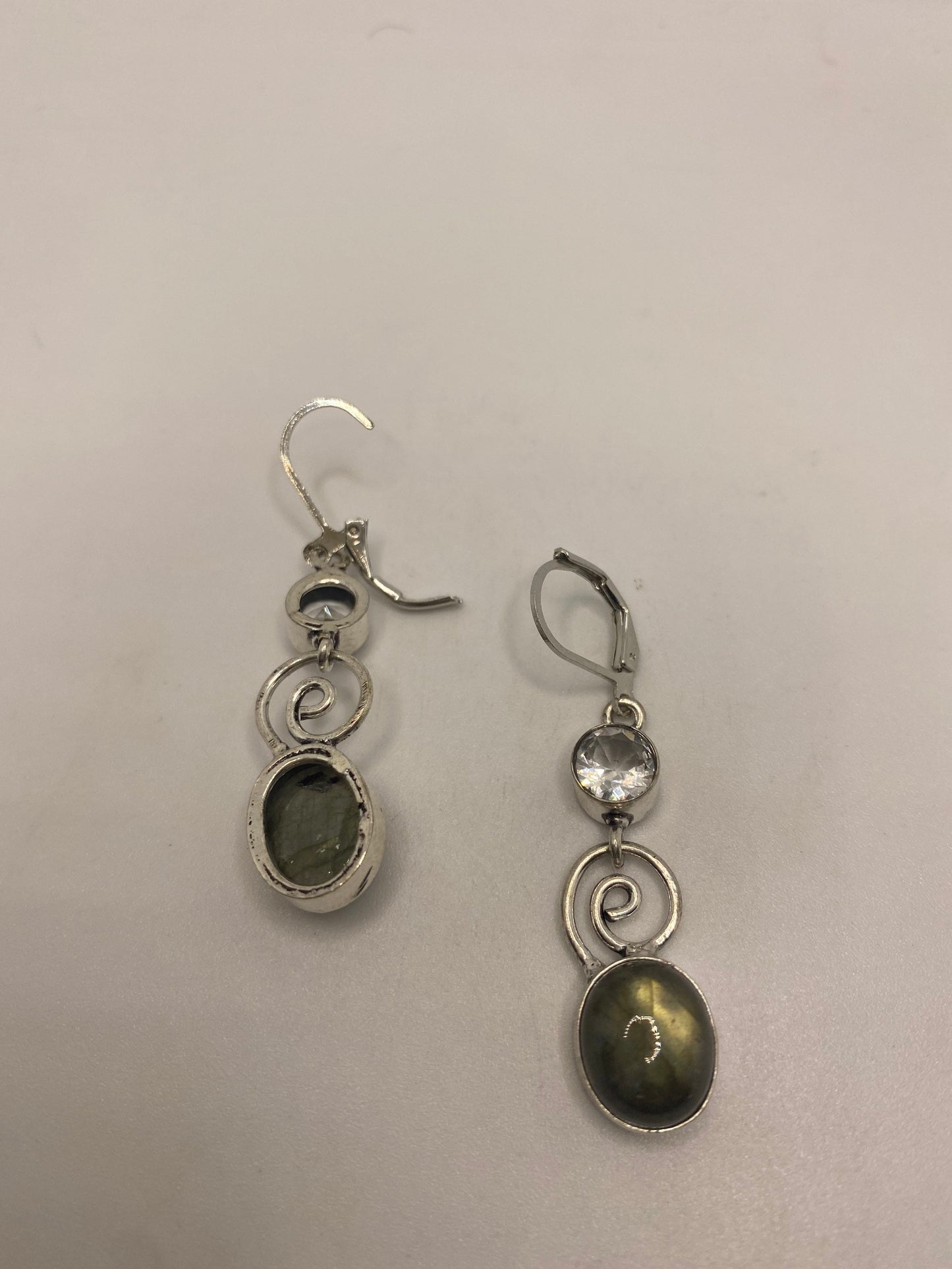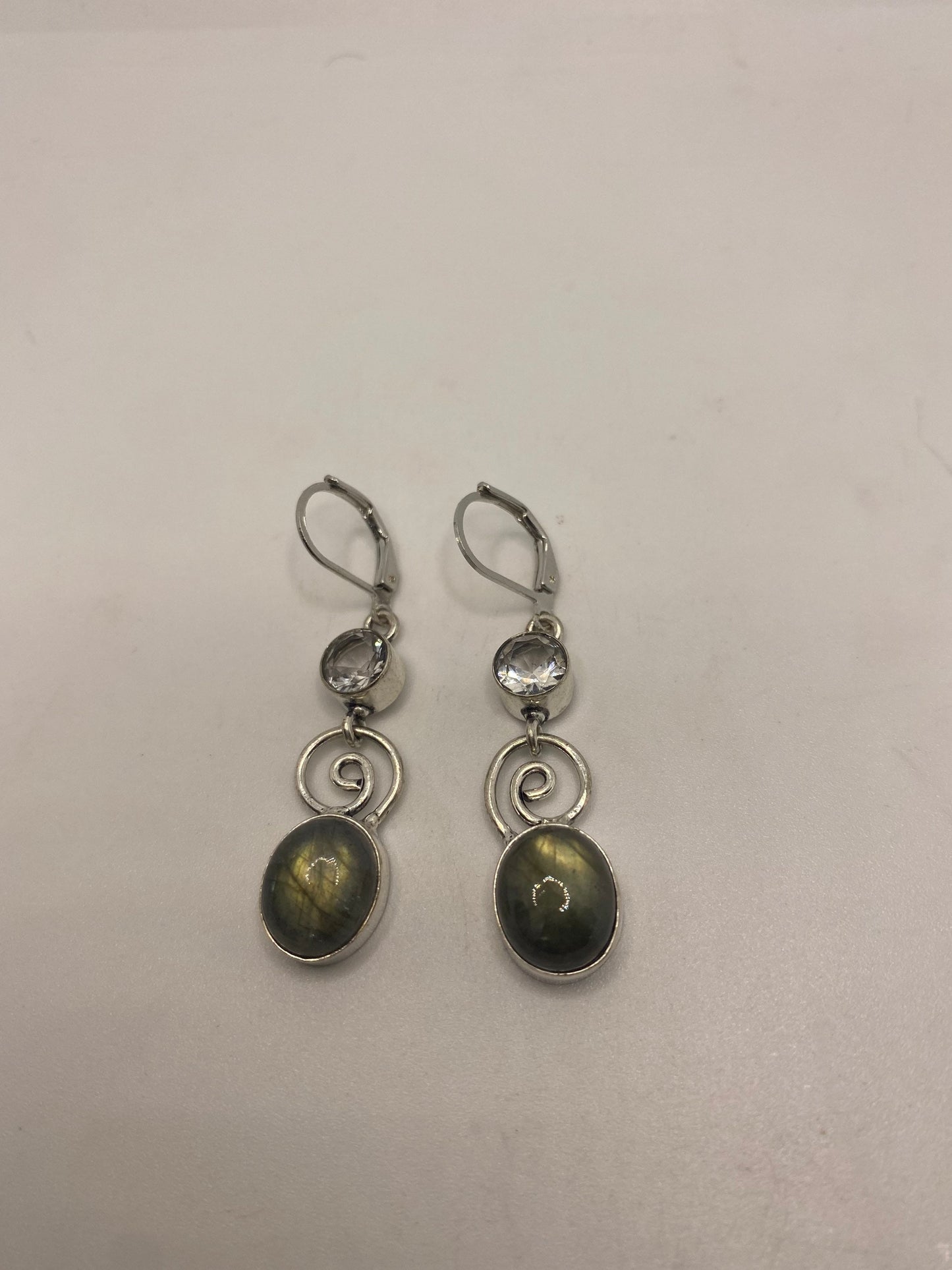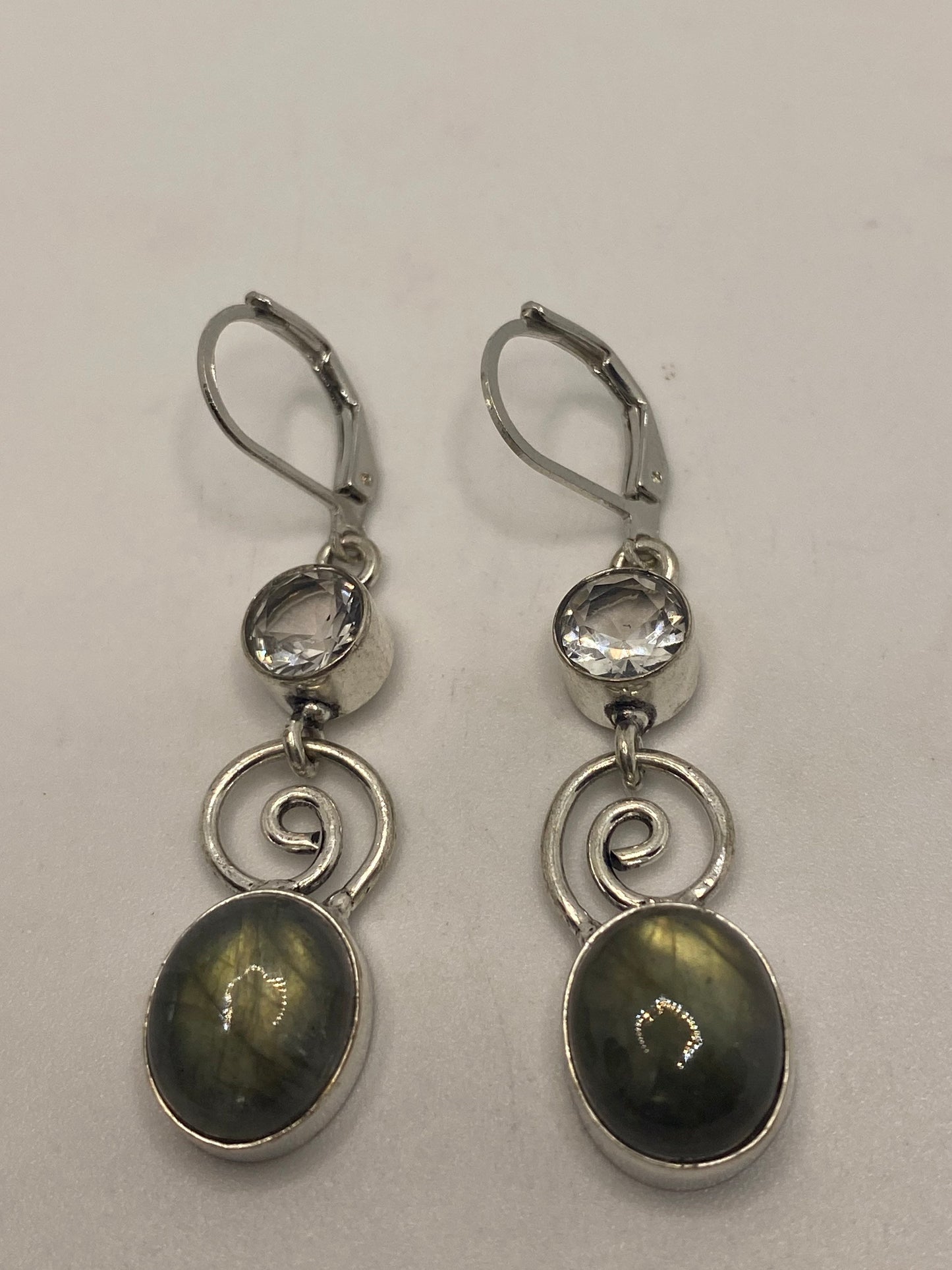 Delicate and detailed green labradorite white topaz stone and Silver earrings