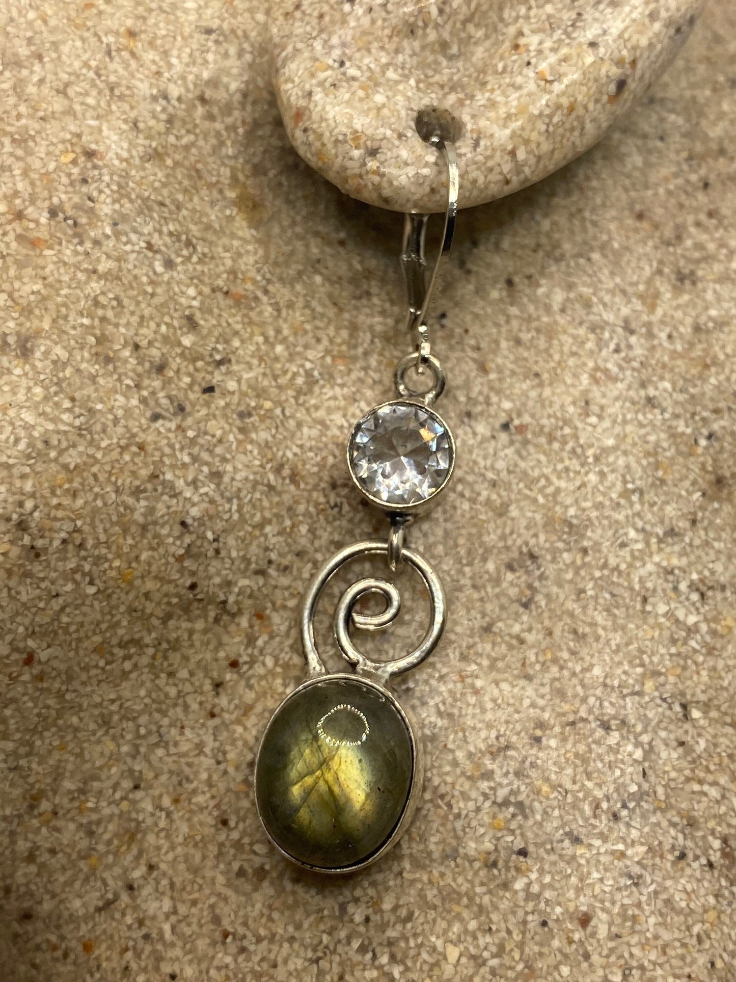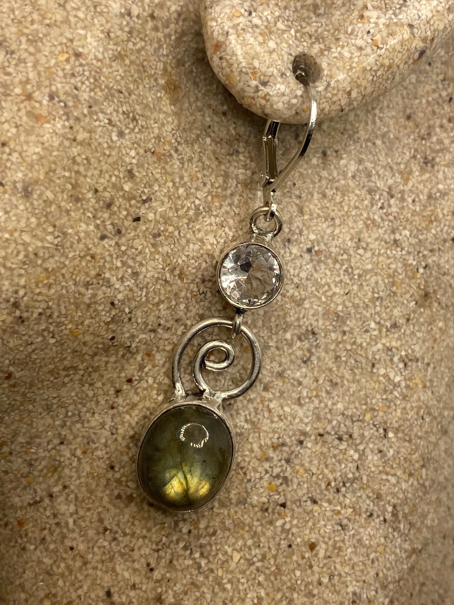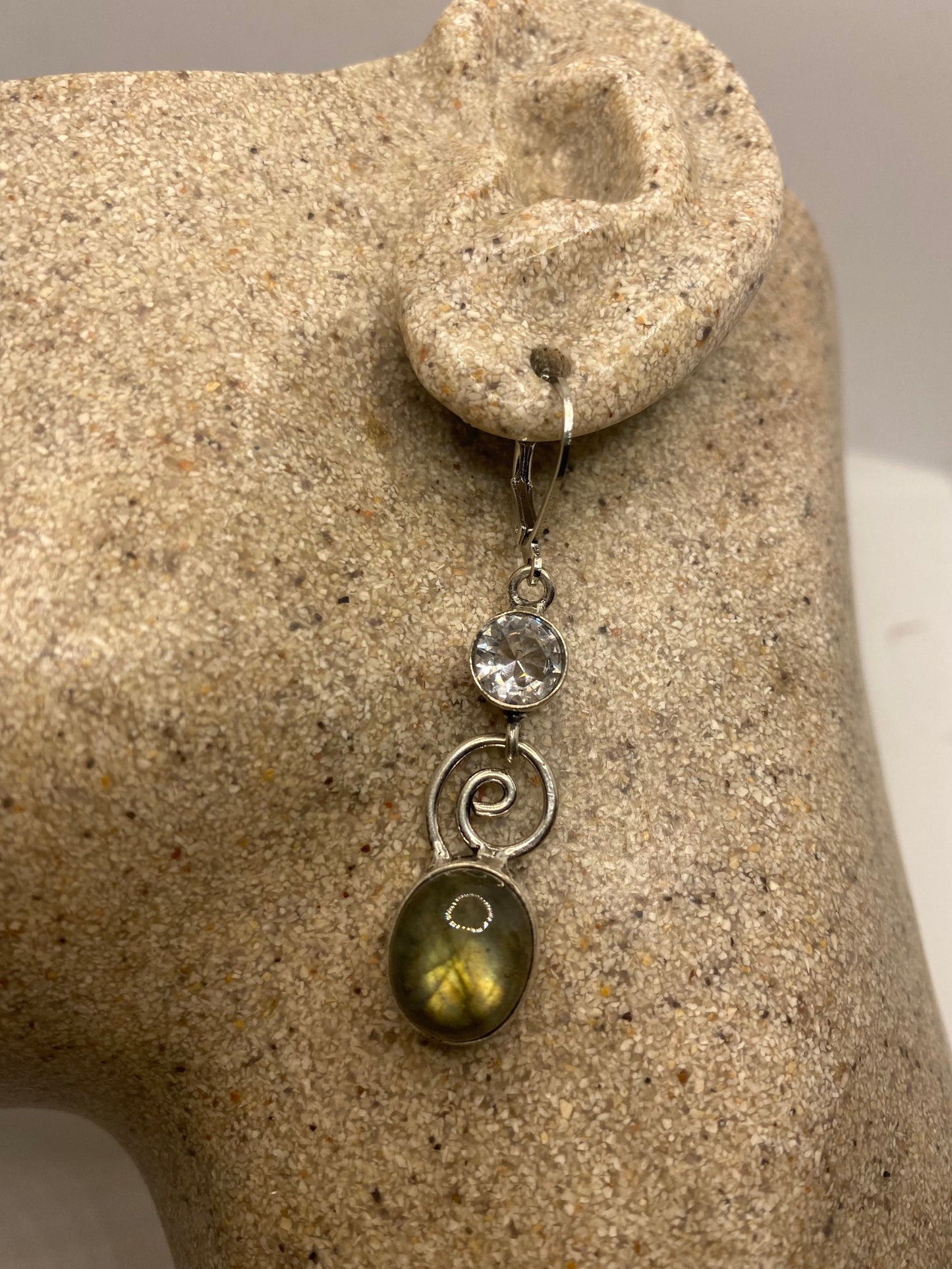 Delicate and detailed green labradorite white topaz stone and Silver earrings