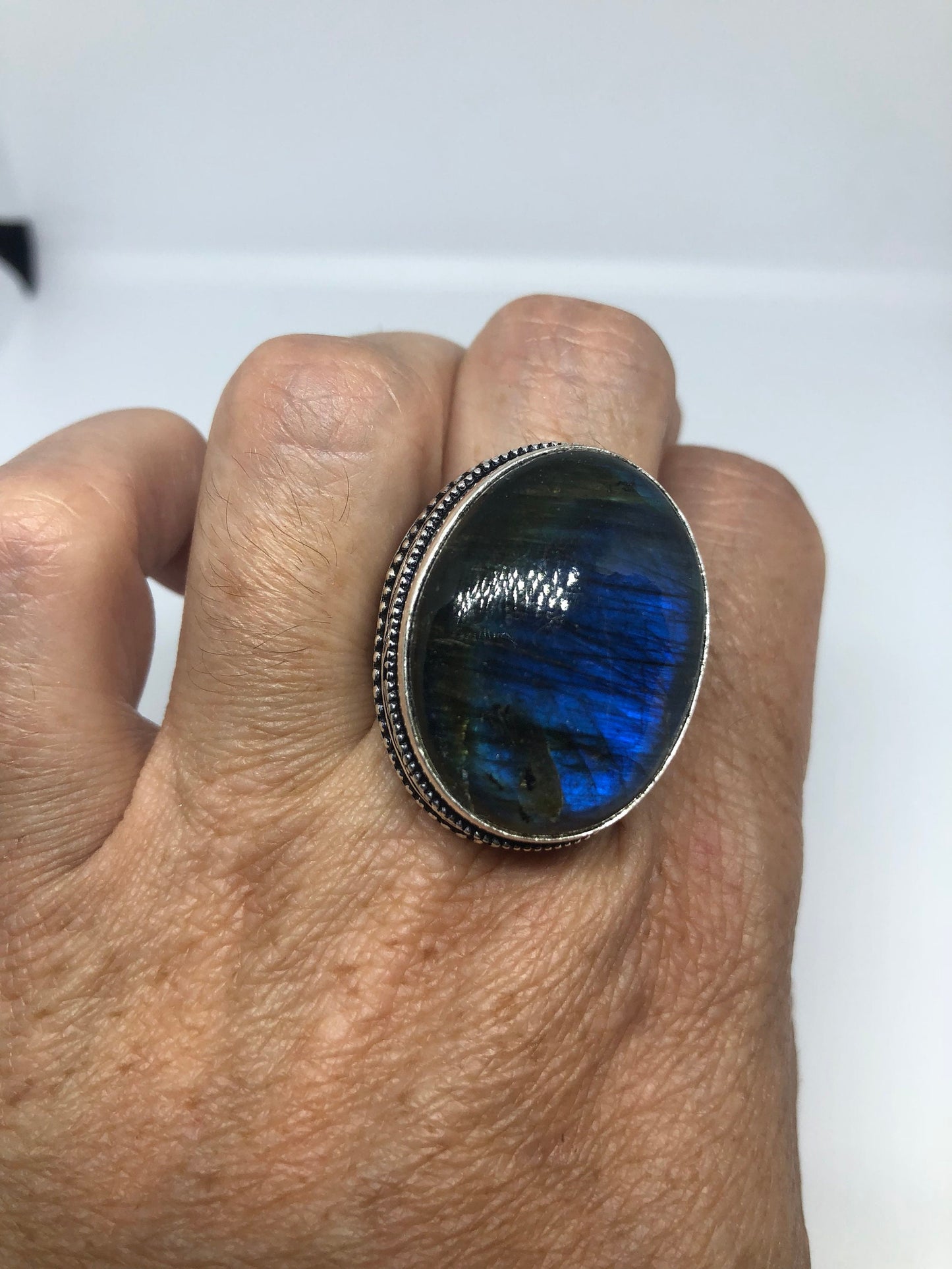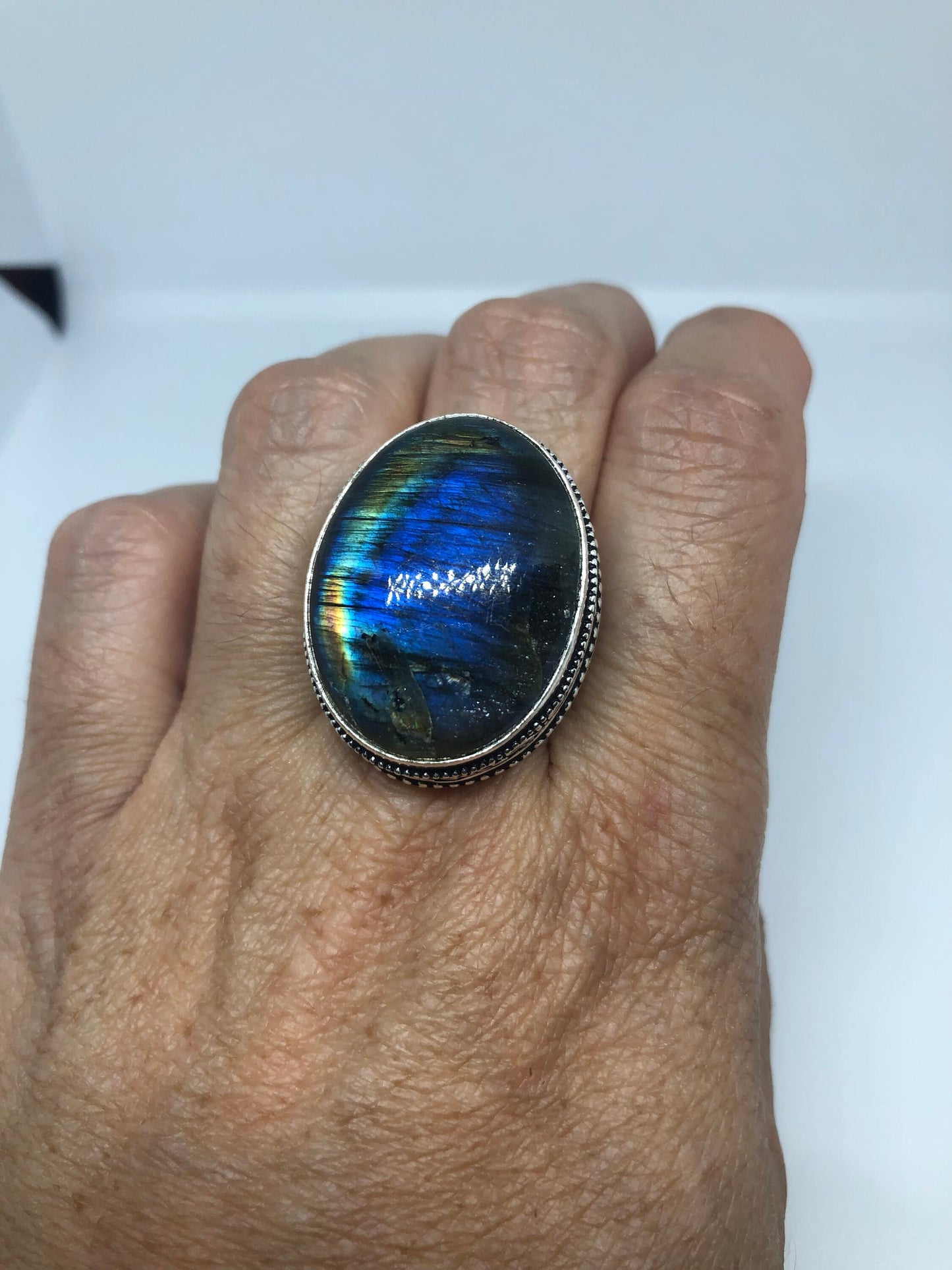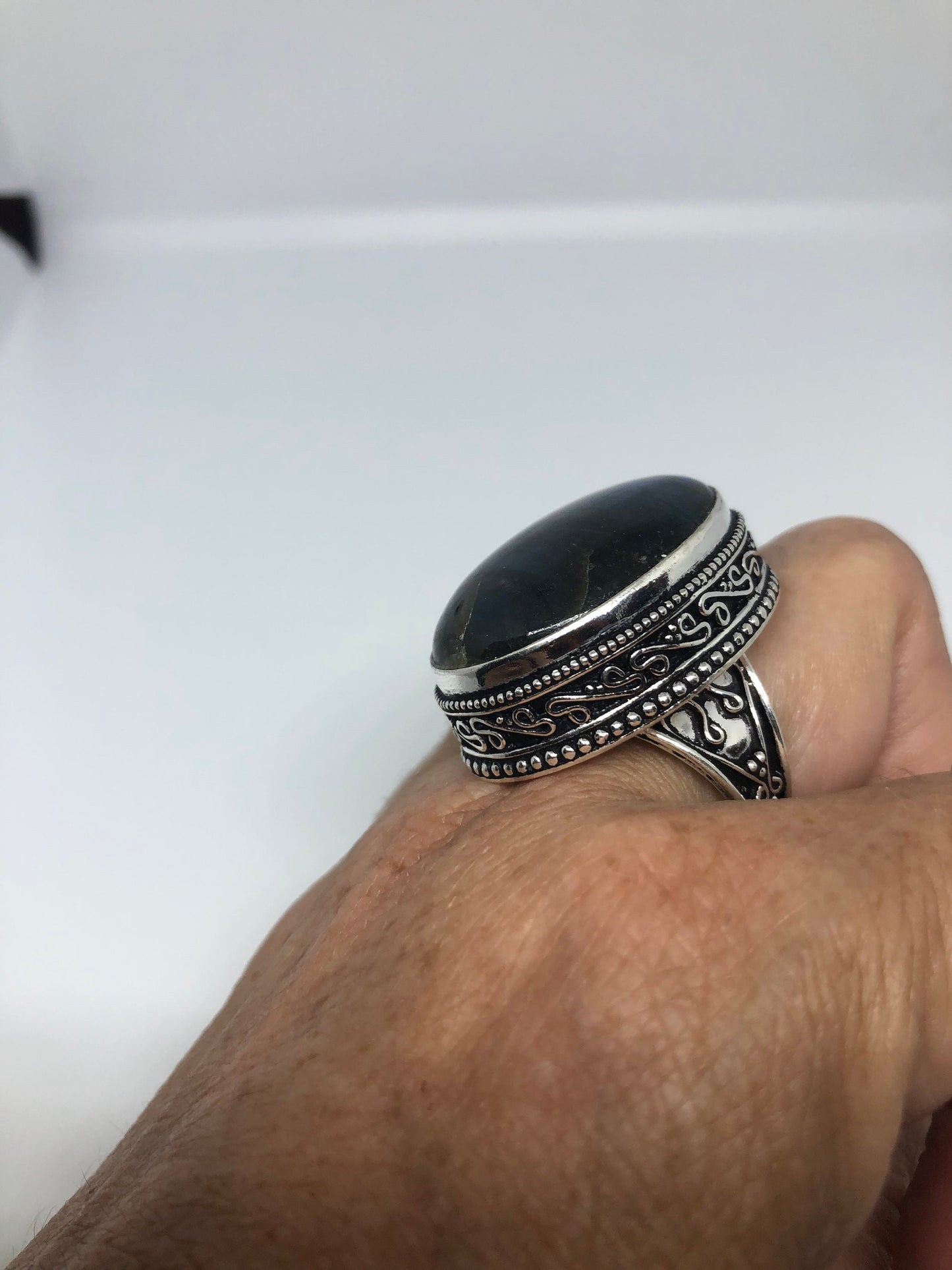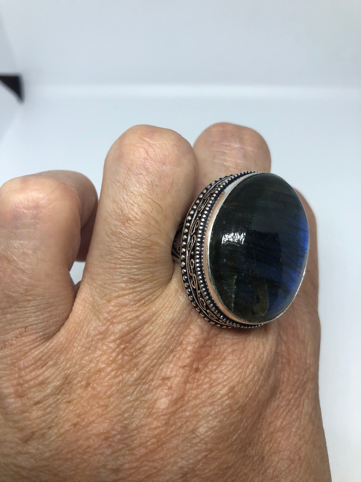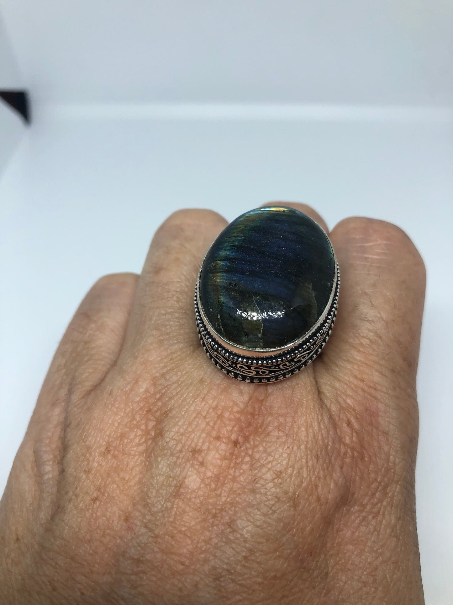 Vintage Large Blue Green Labradorite Stone Silver Ring