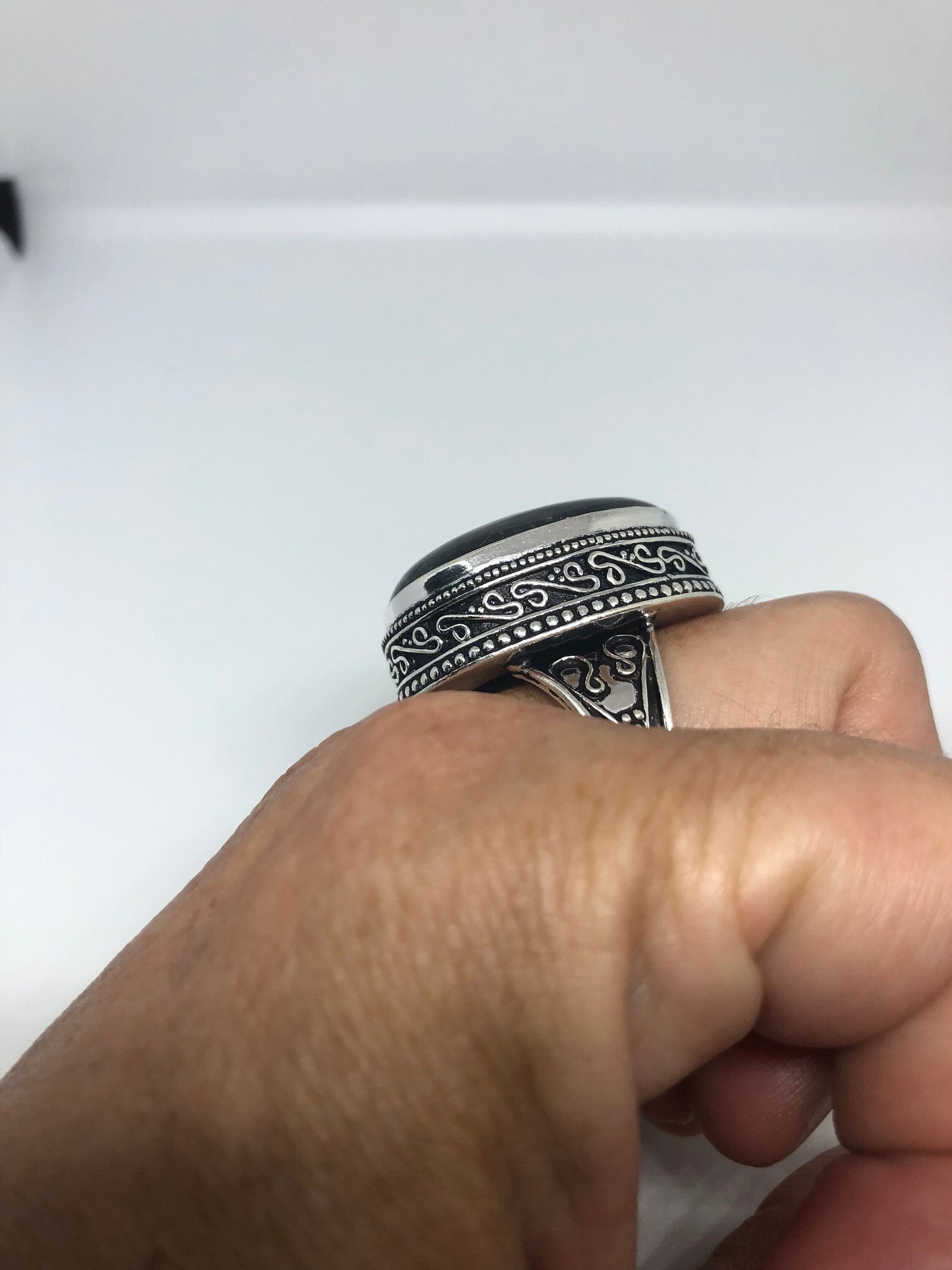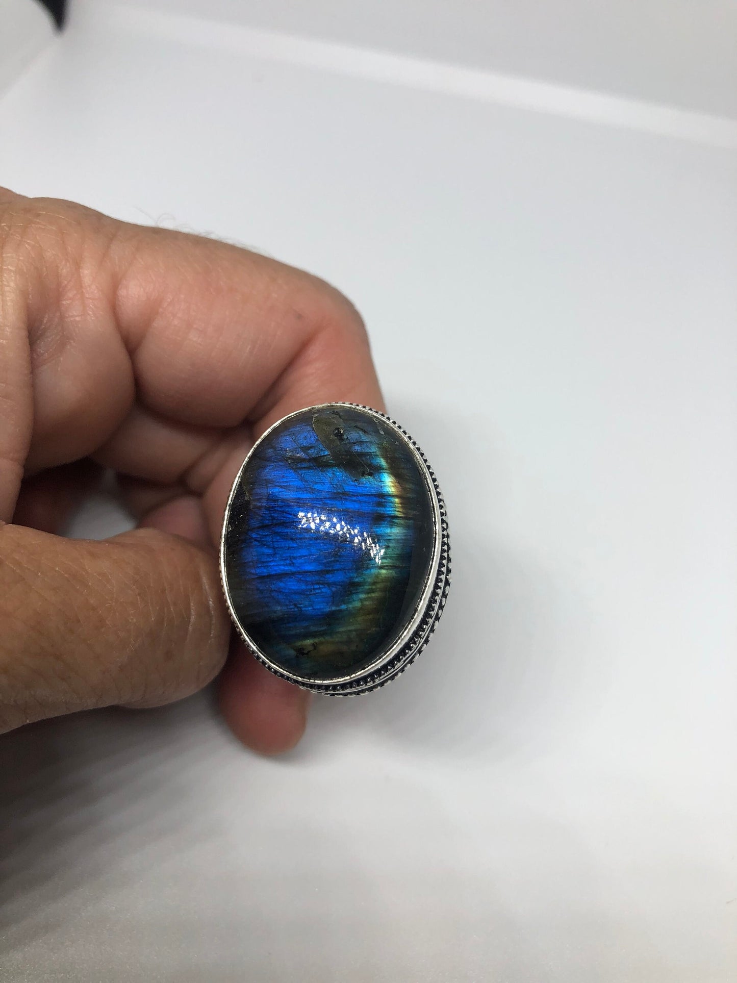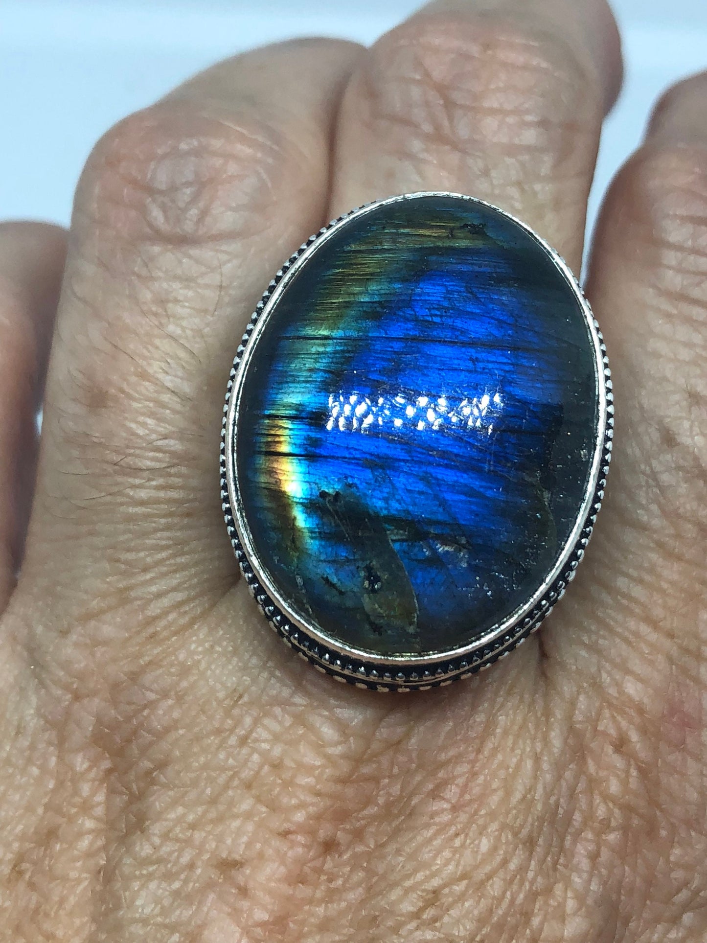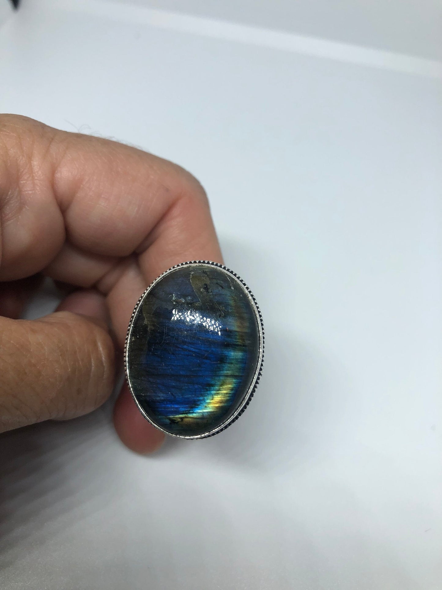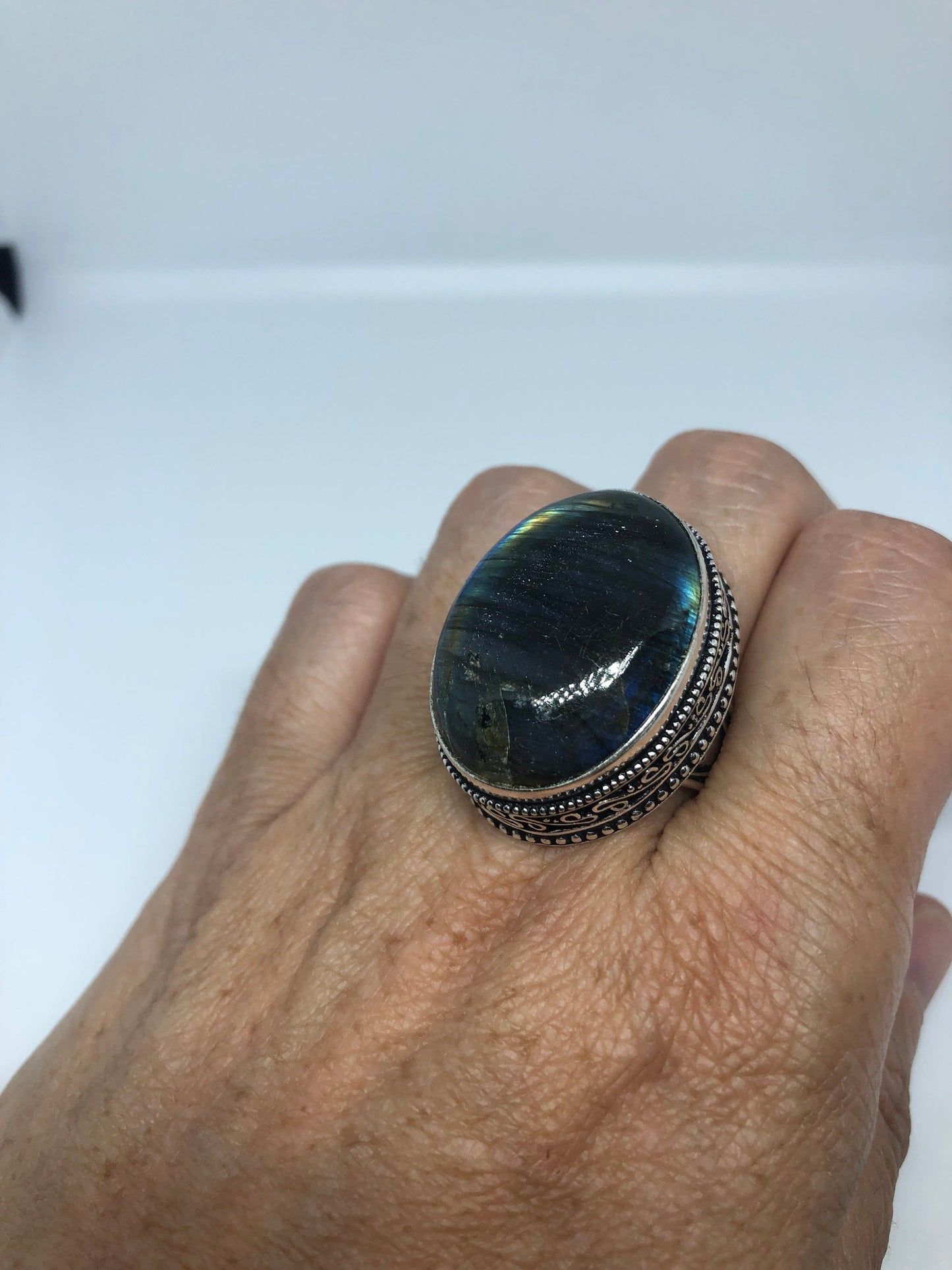 Vintage Large Blue Green Labradorite Stone Silver Ring