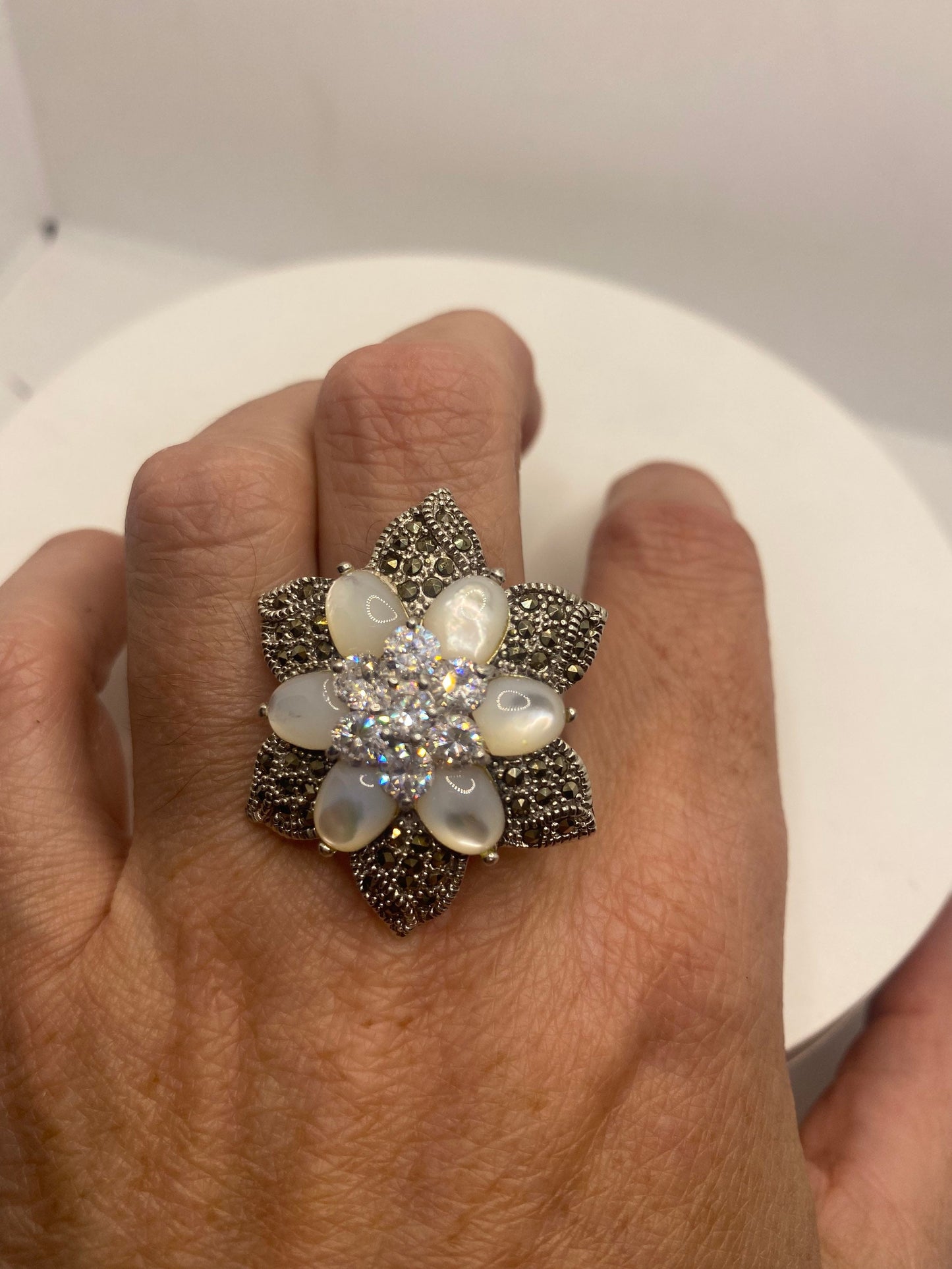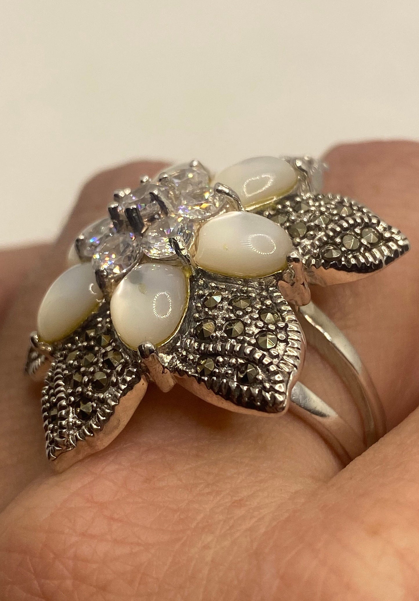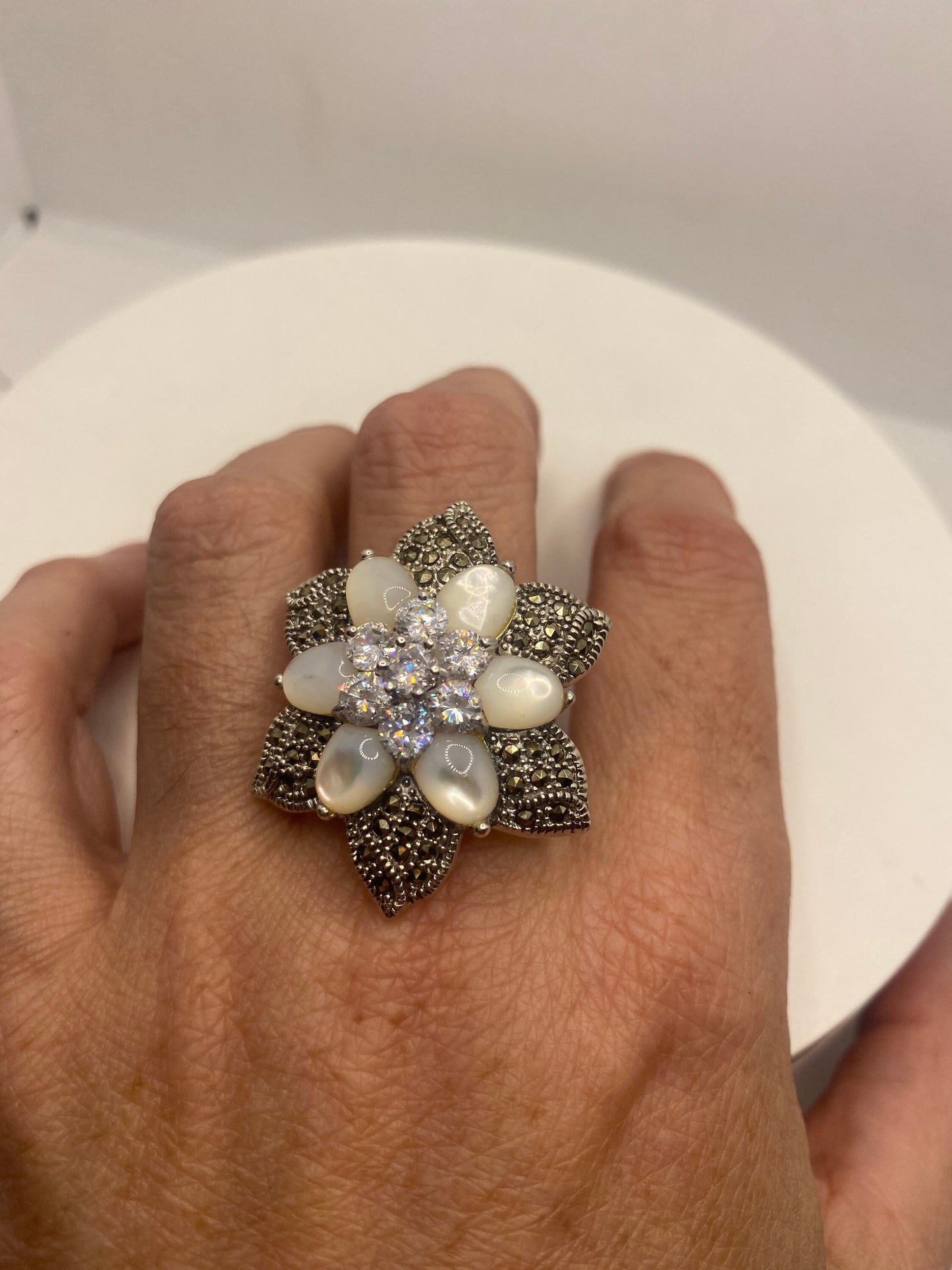 Vintage Mother of Pearl 925 Sterling Silver Marcasite Flower Ring