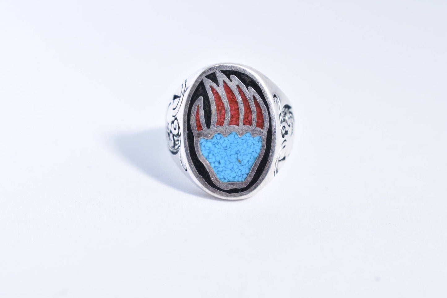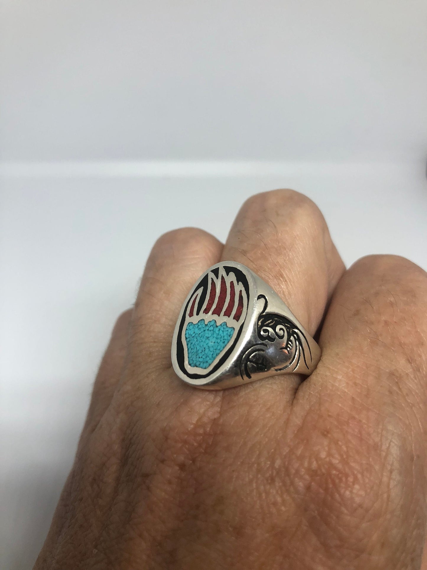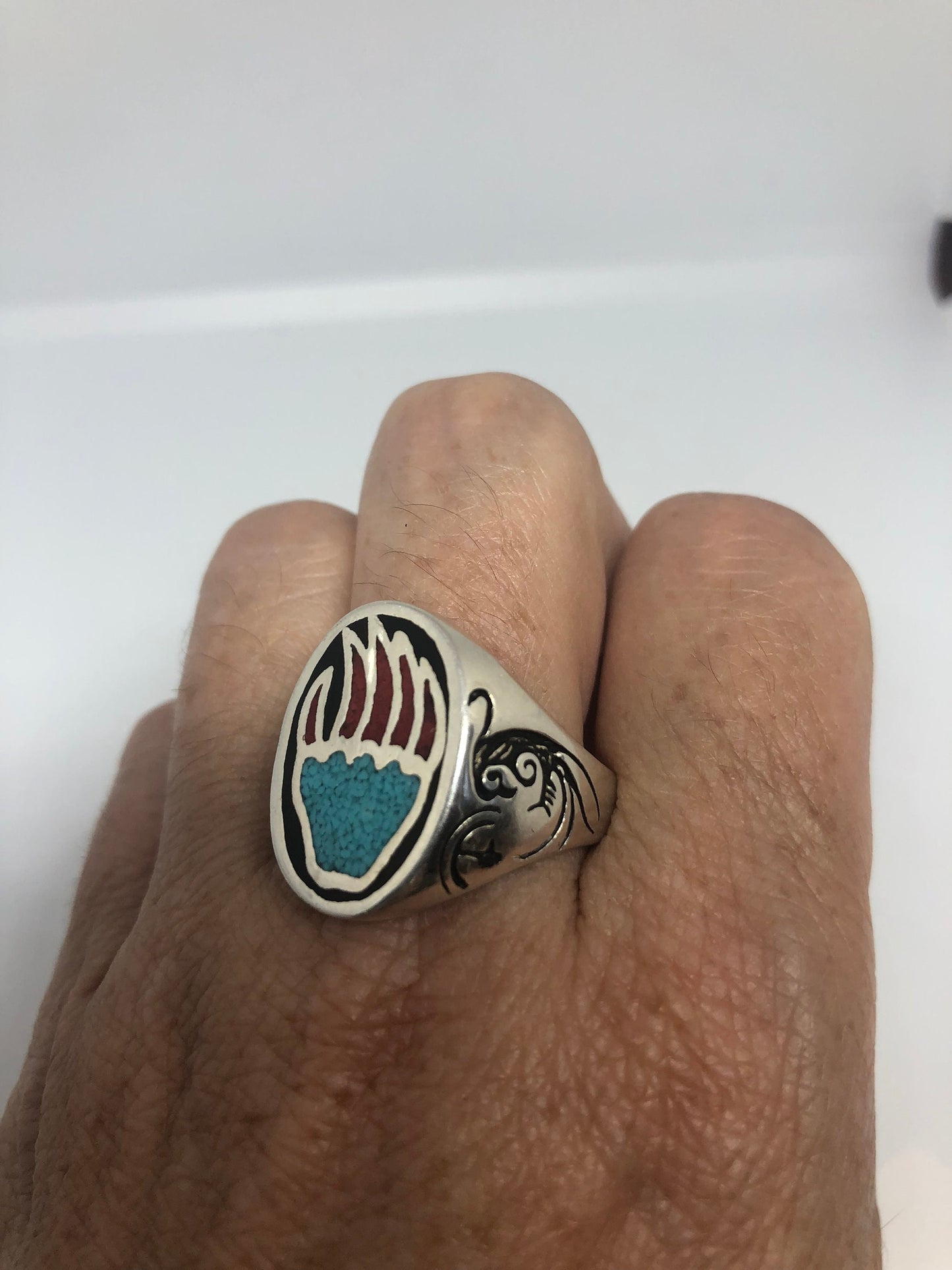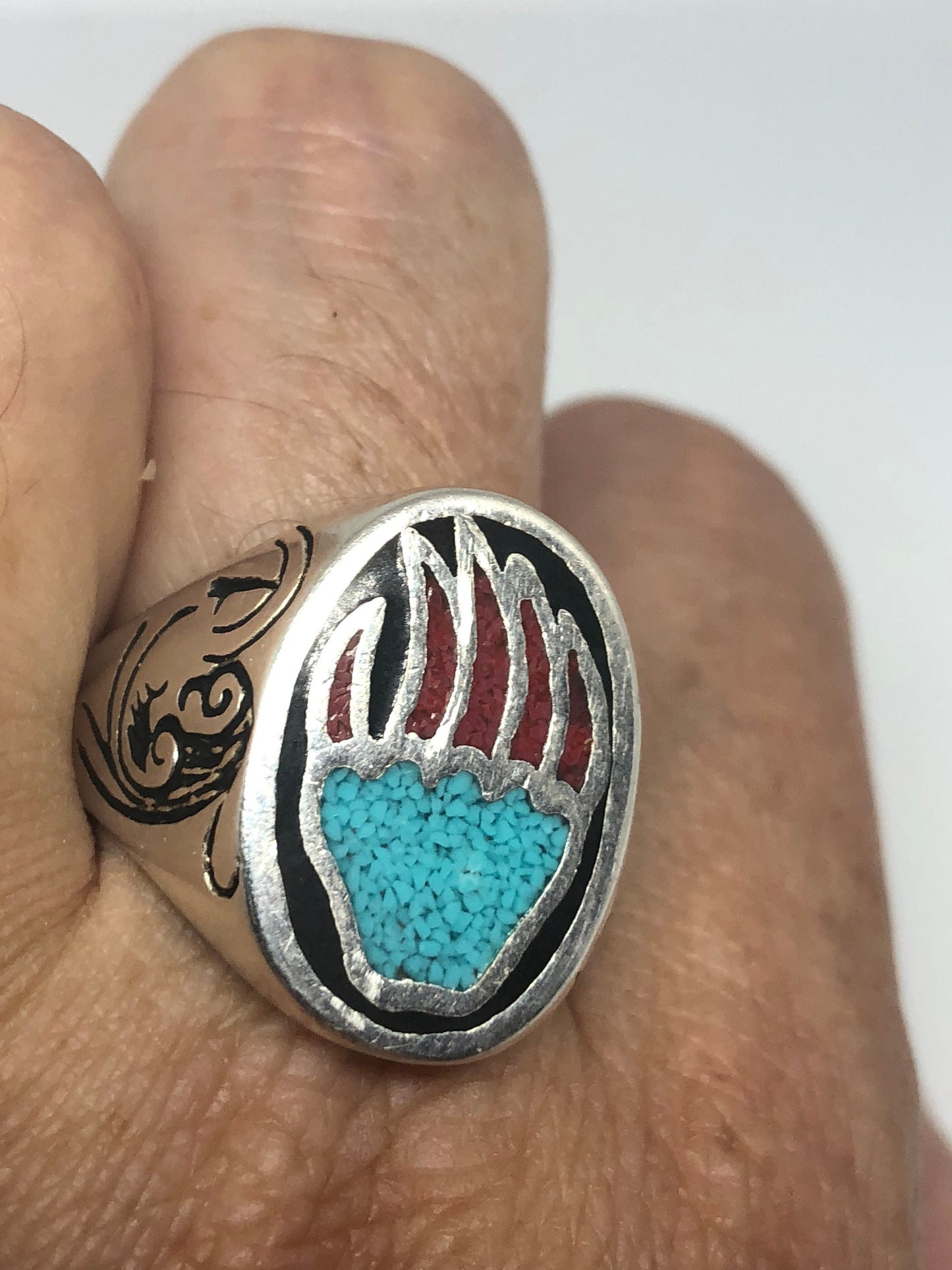 Vintage Native American Southwestern Style Turquoise Stone Inlay Mens Bear Paw Ring