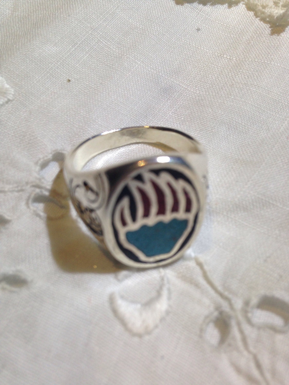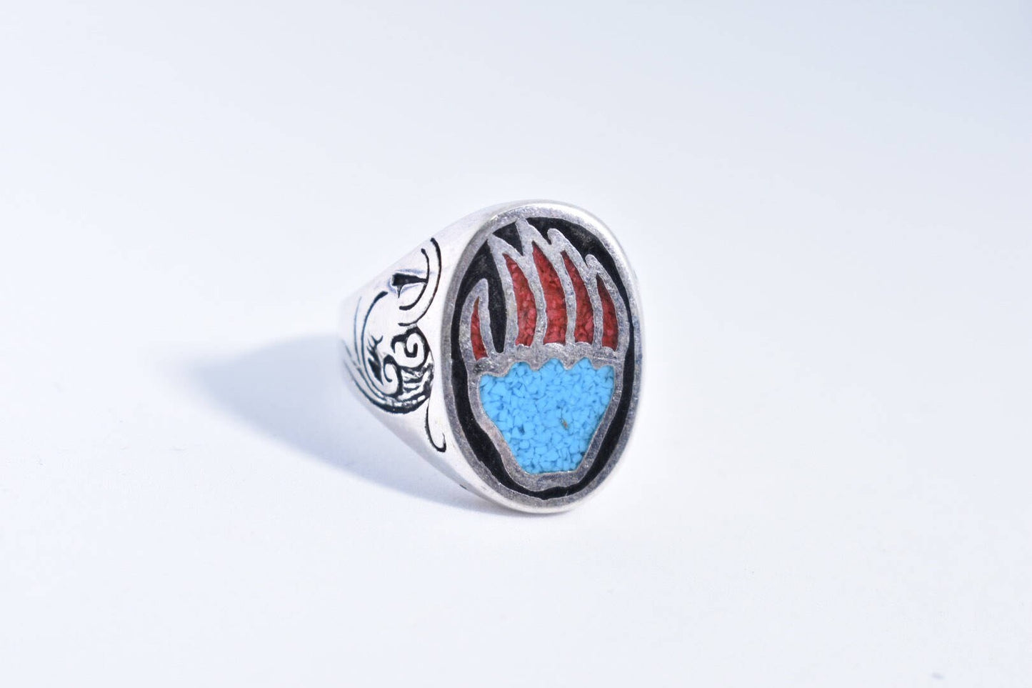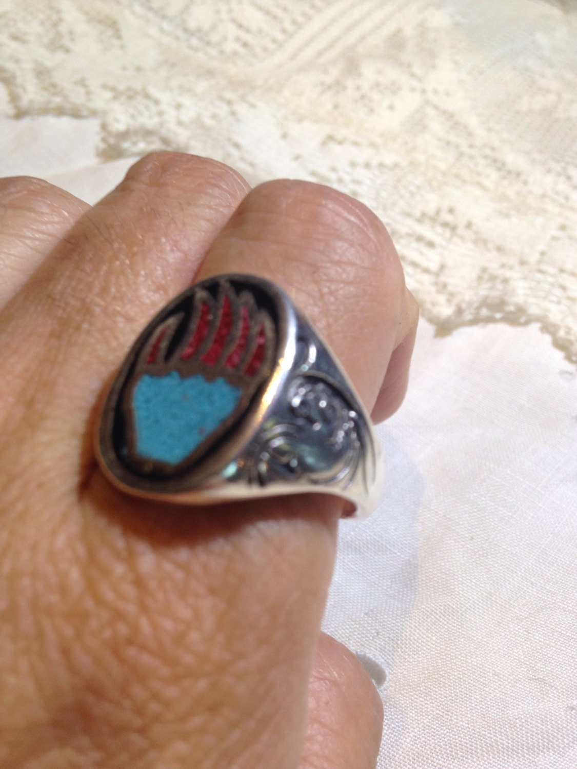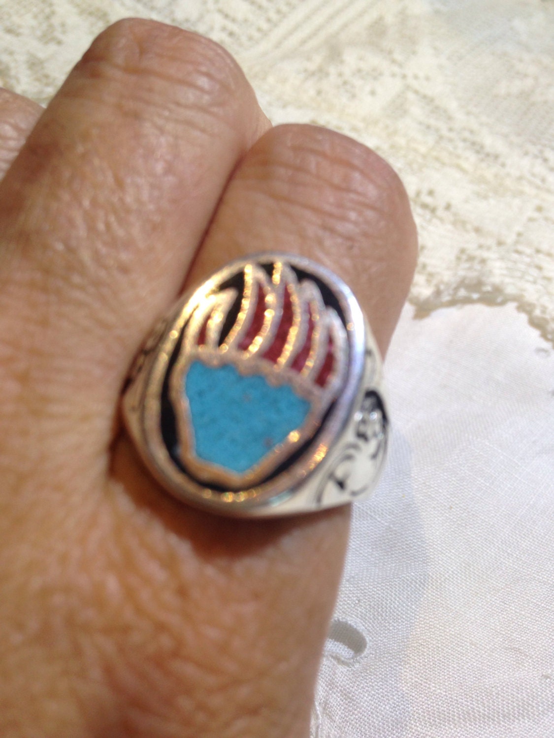 Vintage Native American Southwestern Style Turquoise Stone Inlay Mens Bear Paw Ring