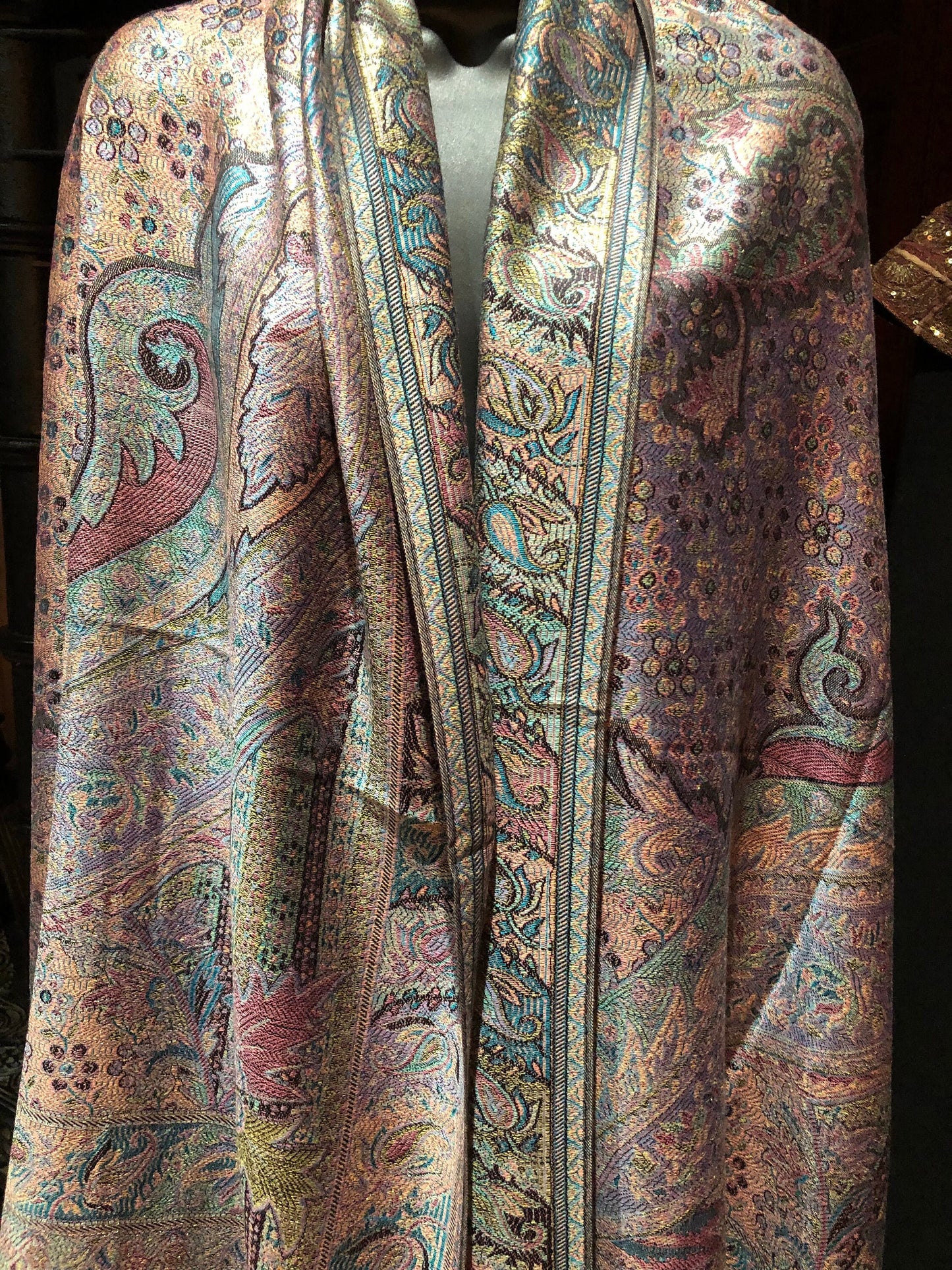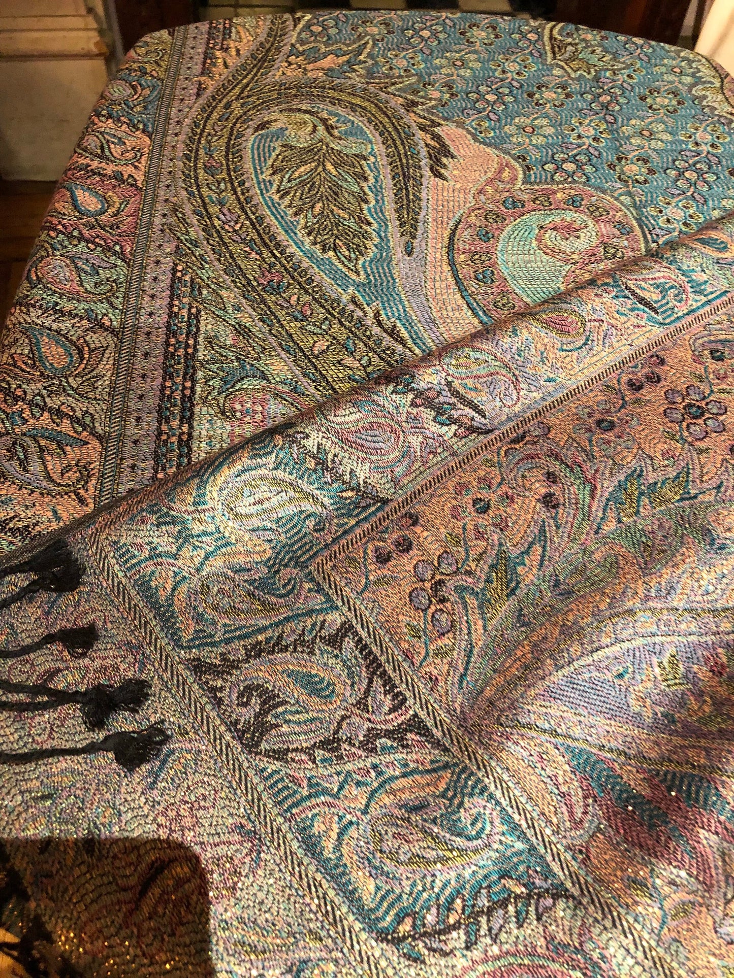 Vintage Pastel Golden Paisley Brocade Pashmina Scarf Wrap Shawl