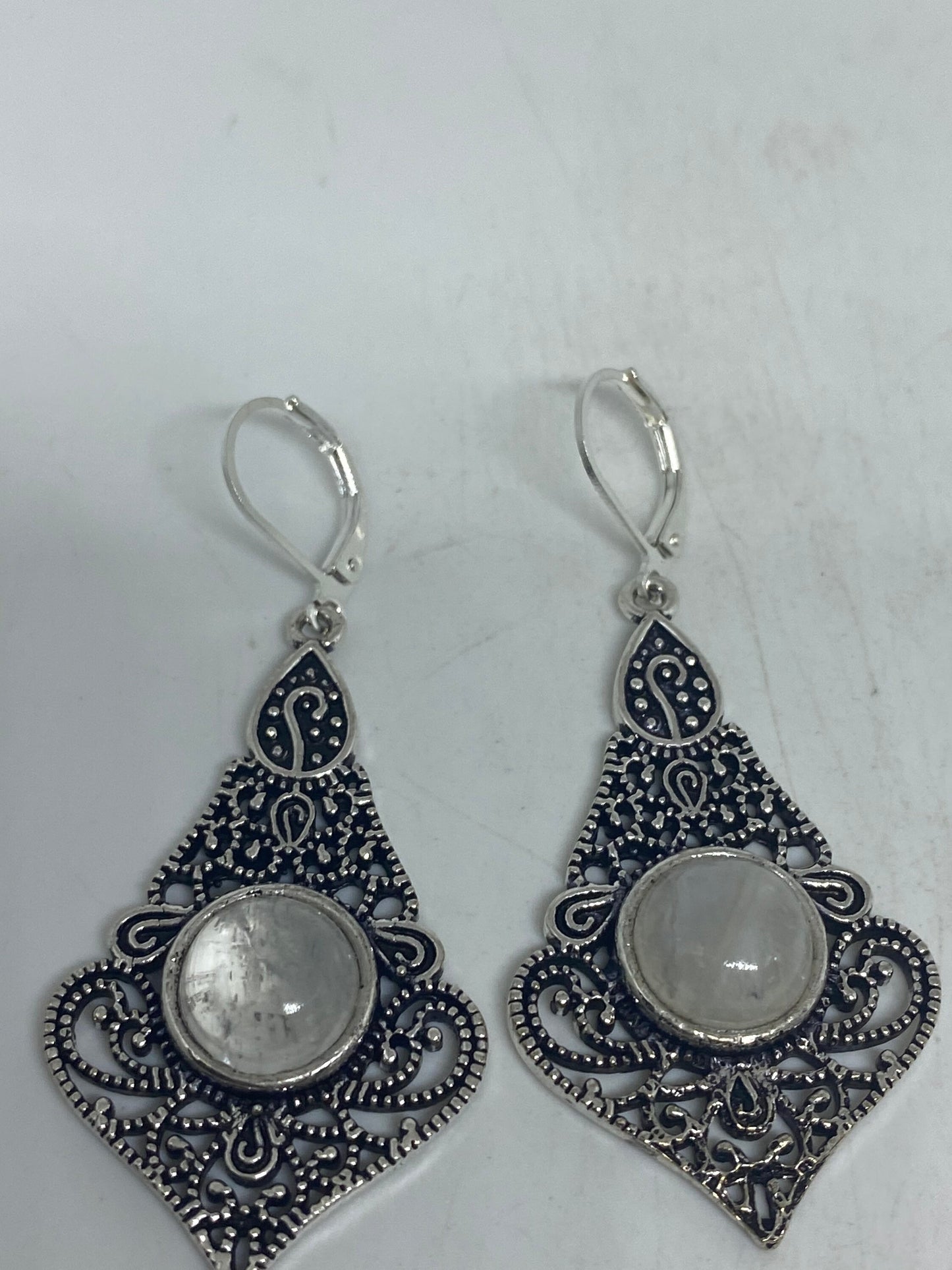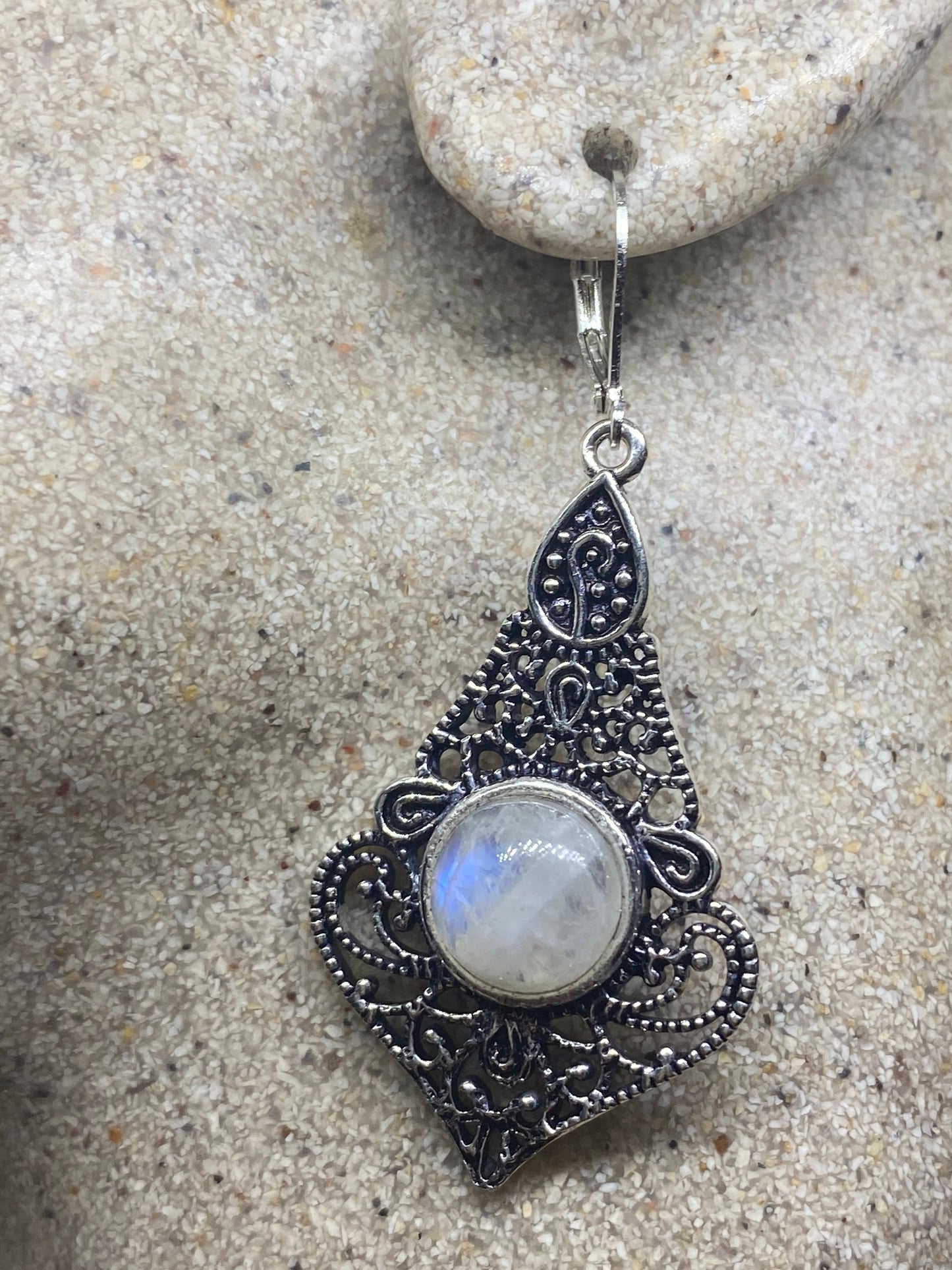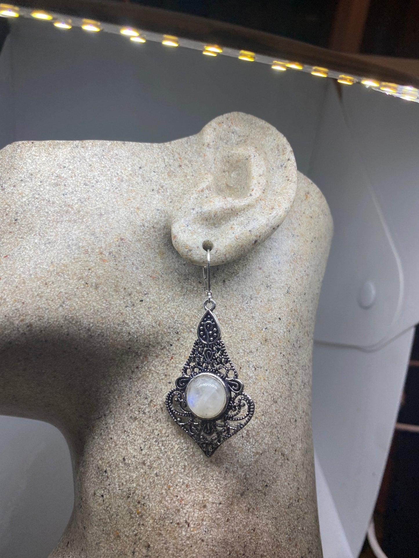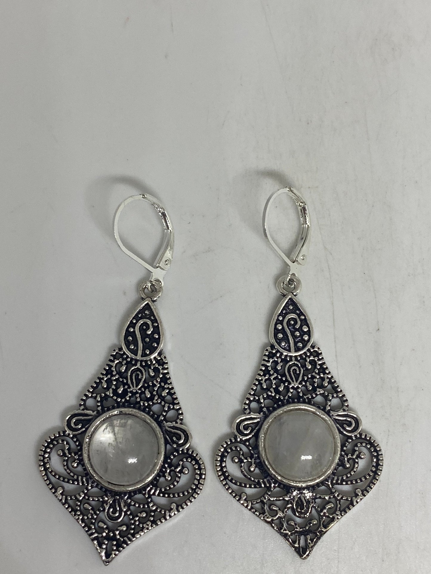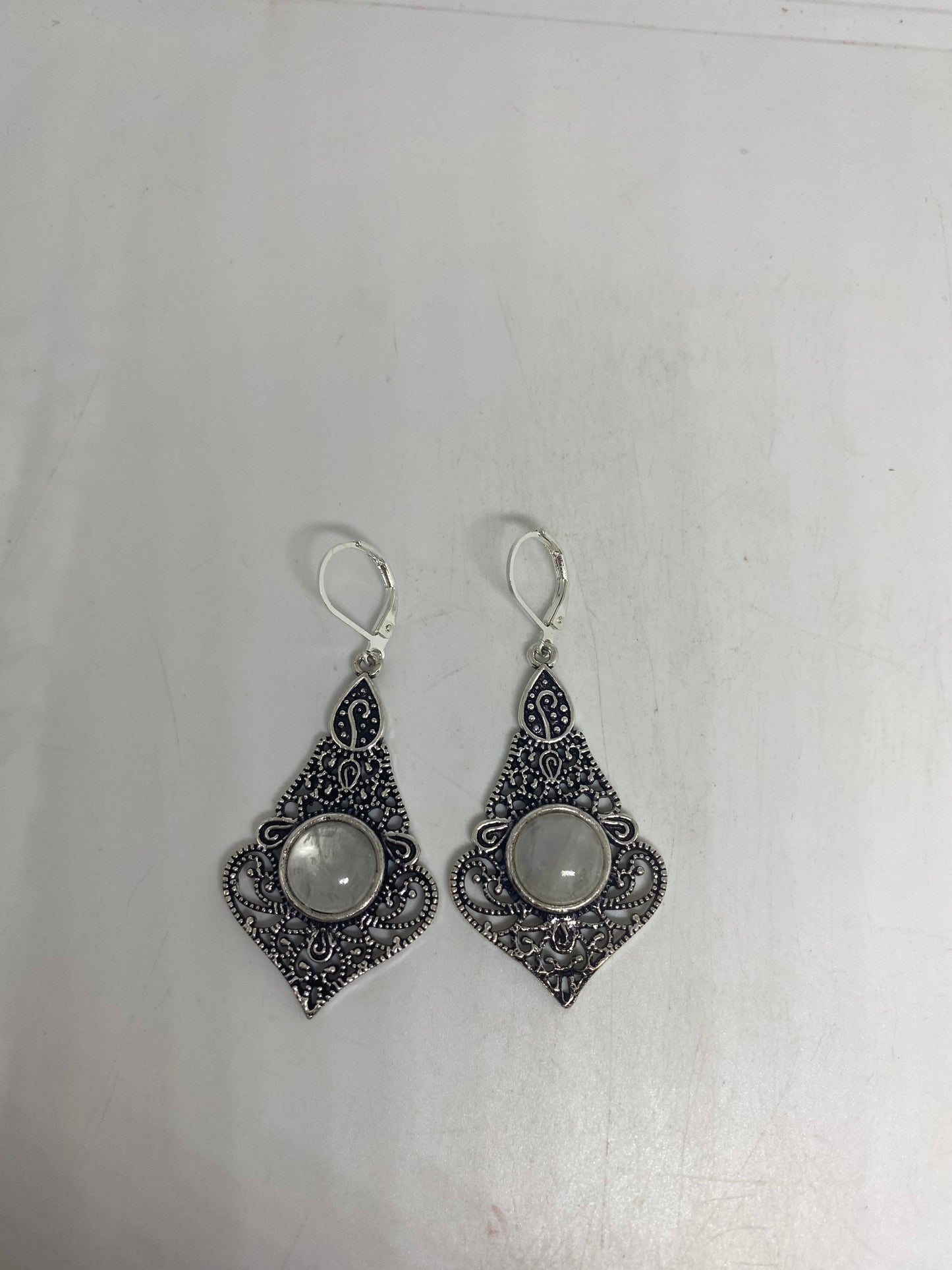 Vintage white rainbow moonstone stone and 925 Silver leverback earrings