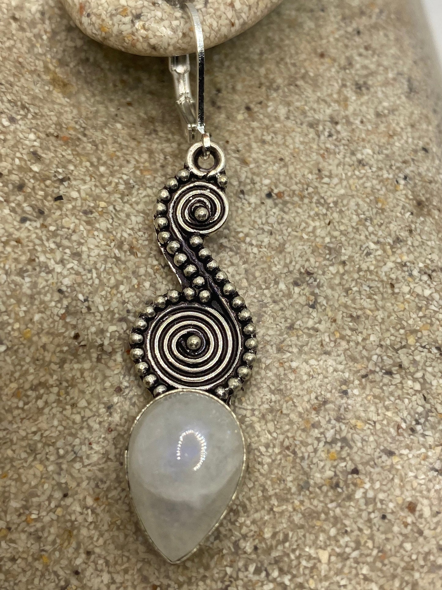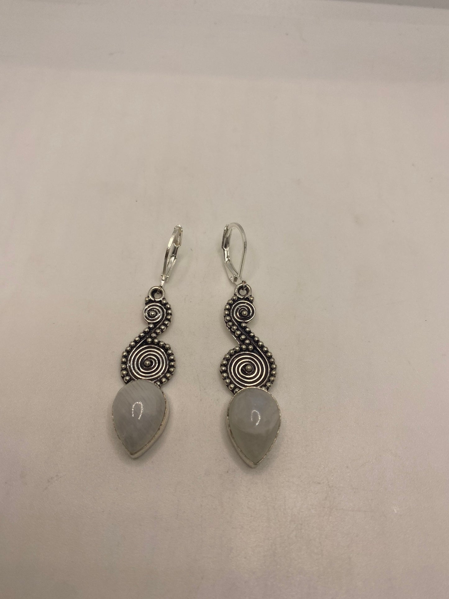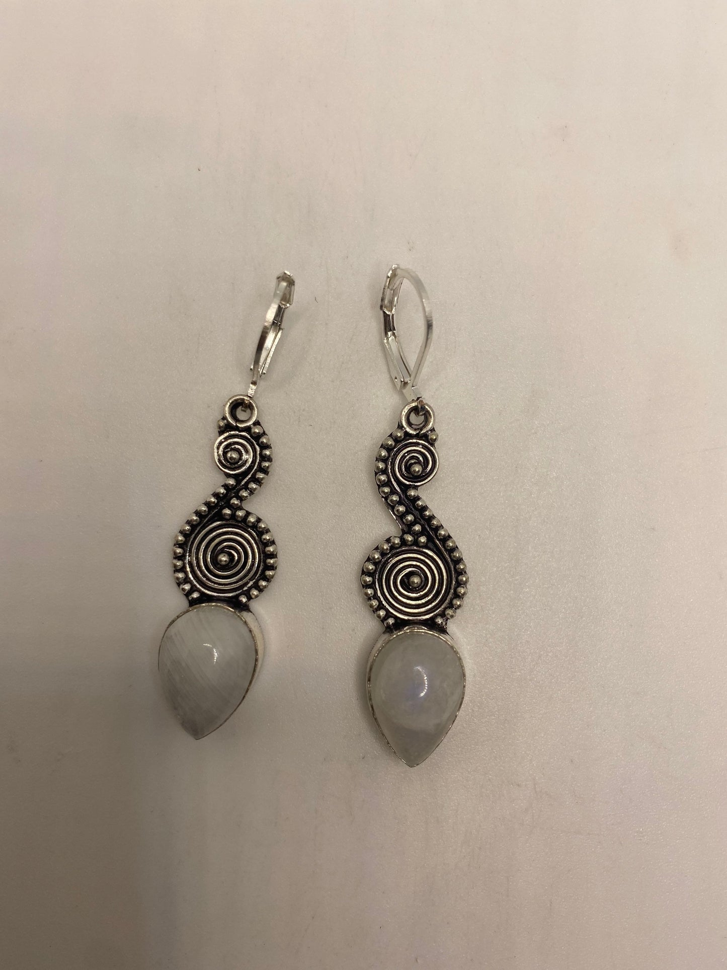 Delicate and detailed white rainbow moonstone and Silver lever back earrings