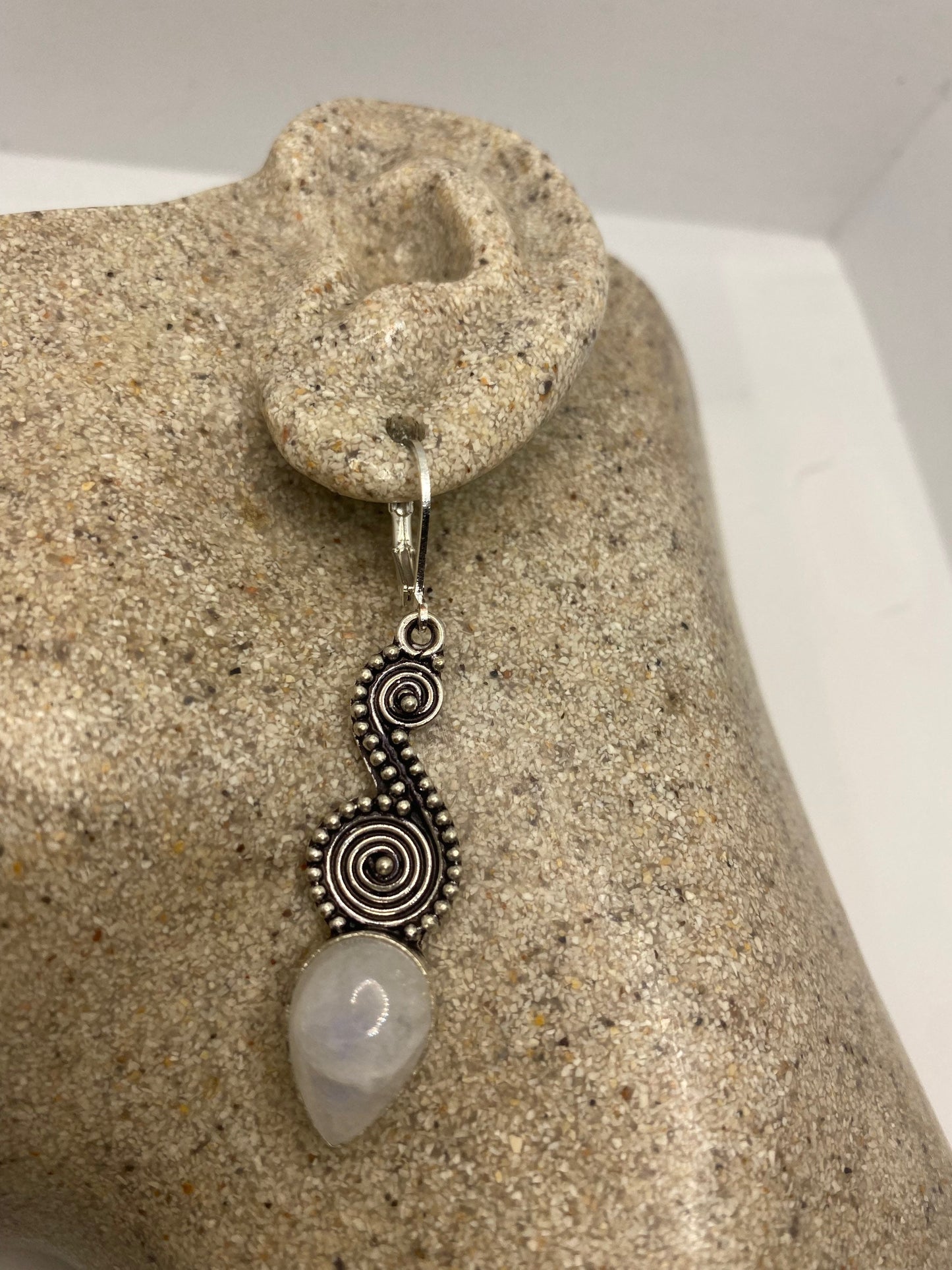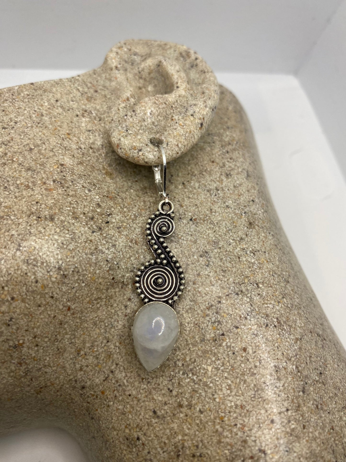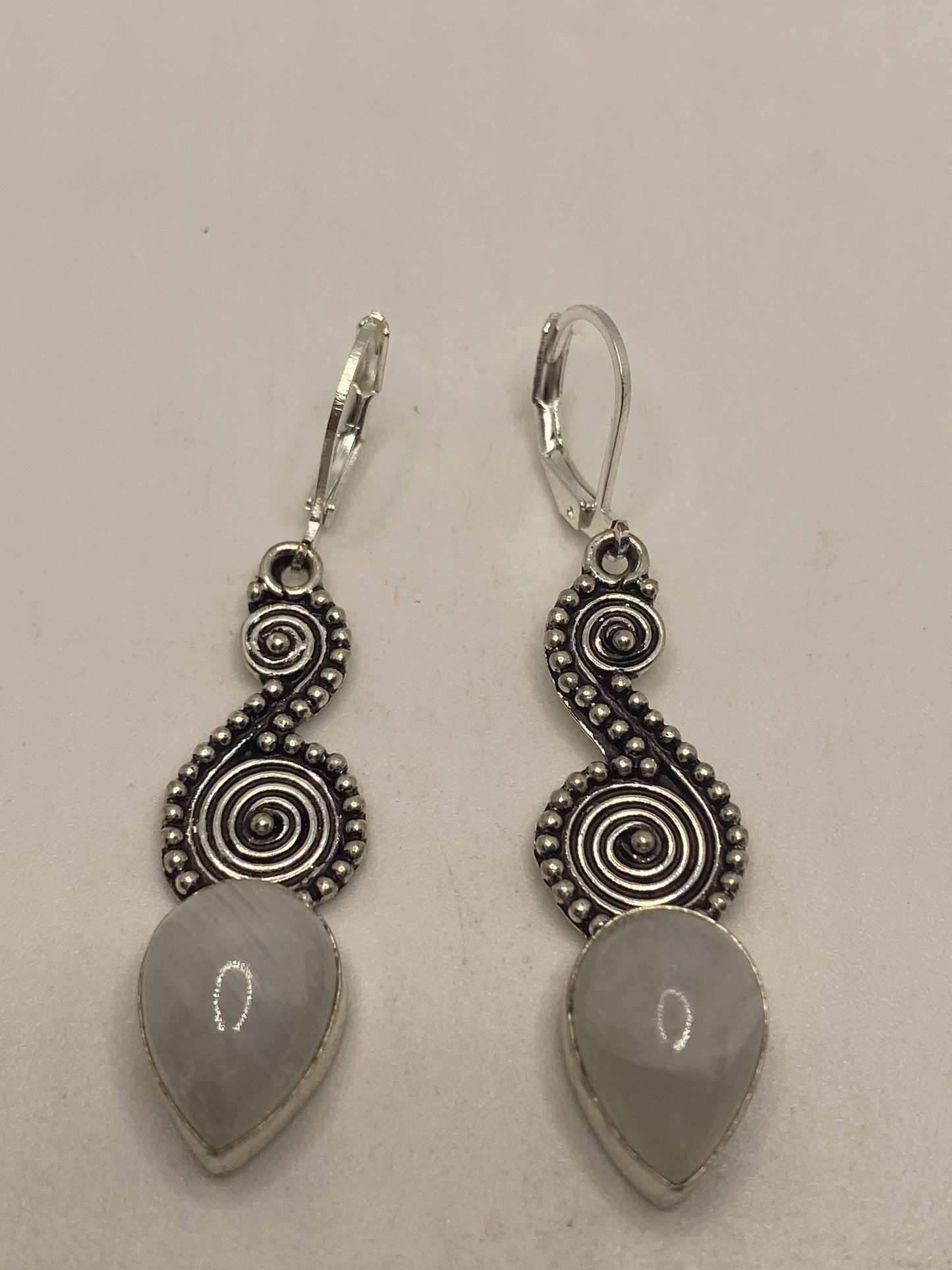 Delicate and detailed white rainbow moonstone and Silver lever back earrings